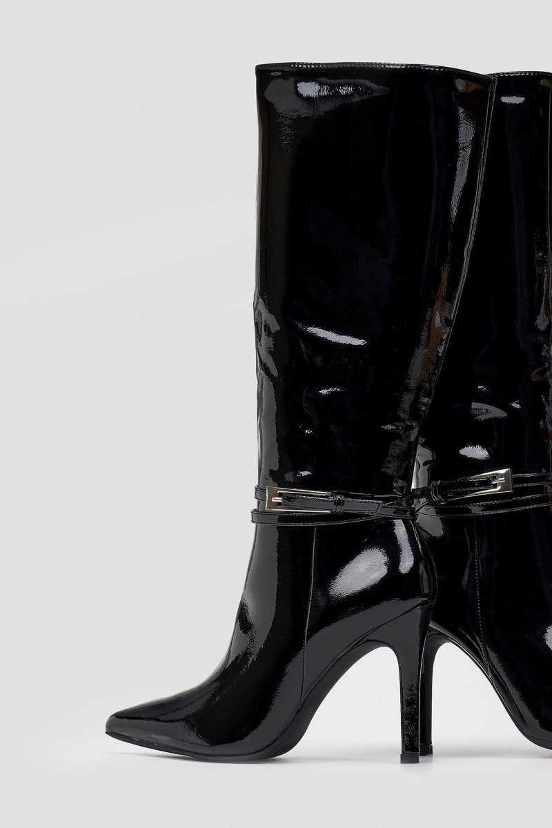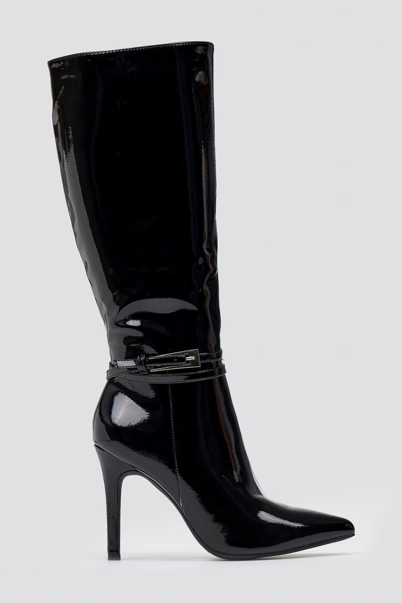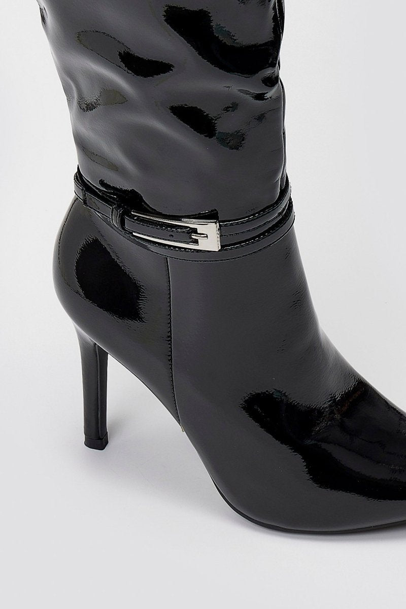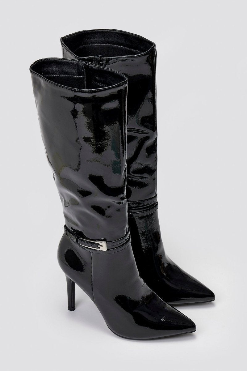 Pointed patent boots with slim stiletto heel, ankle strap with metallic buckle, and side zipper. Glossy finish adds timeless elegance.