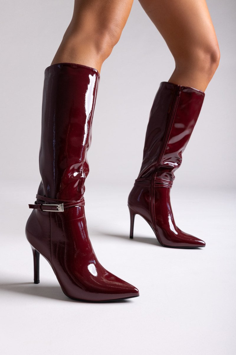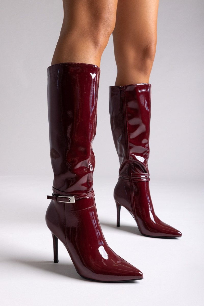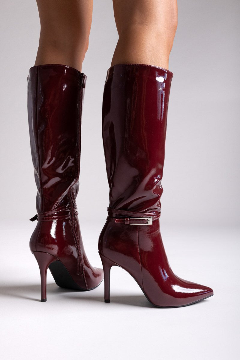 Pointed Patent Boots with Stiletto Heel - Burgundy Patent