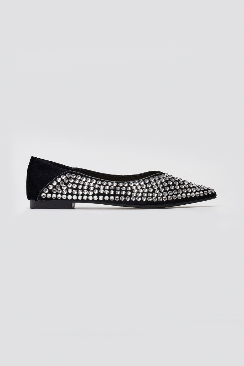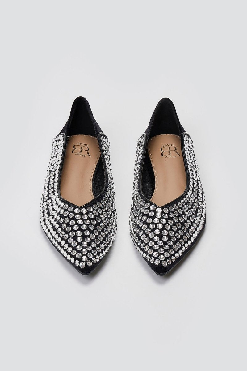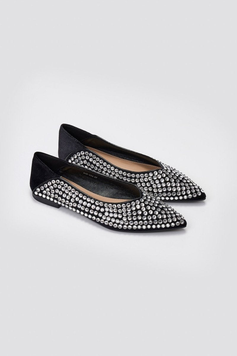 Pointed Suede Ballet Flats with Stones - Black Suede