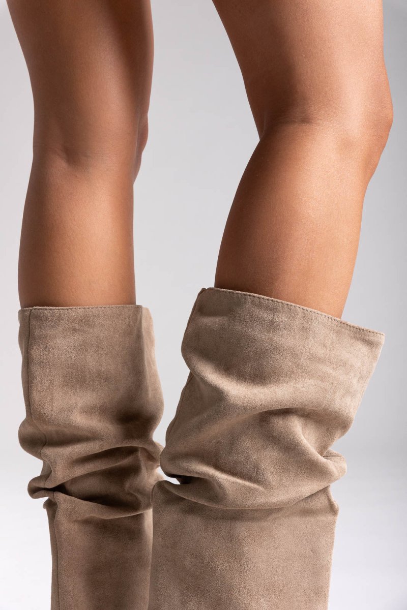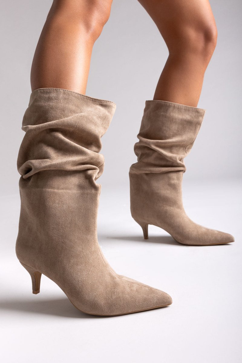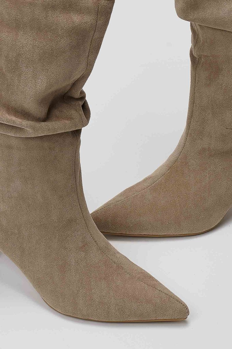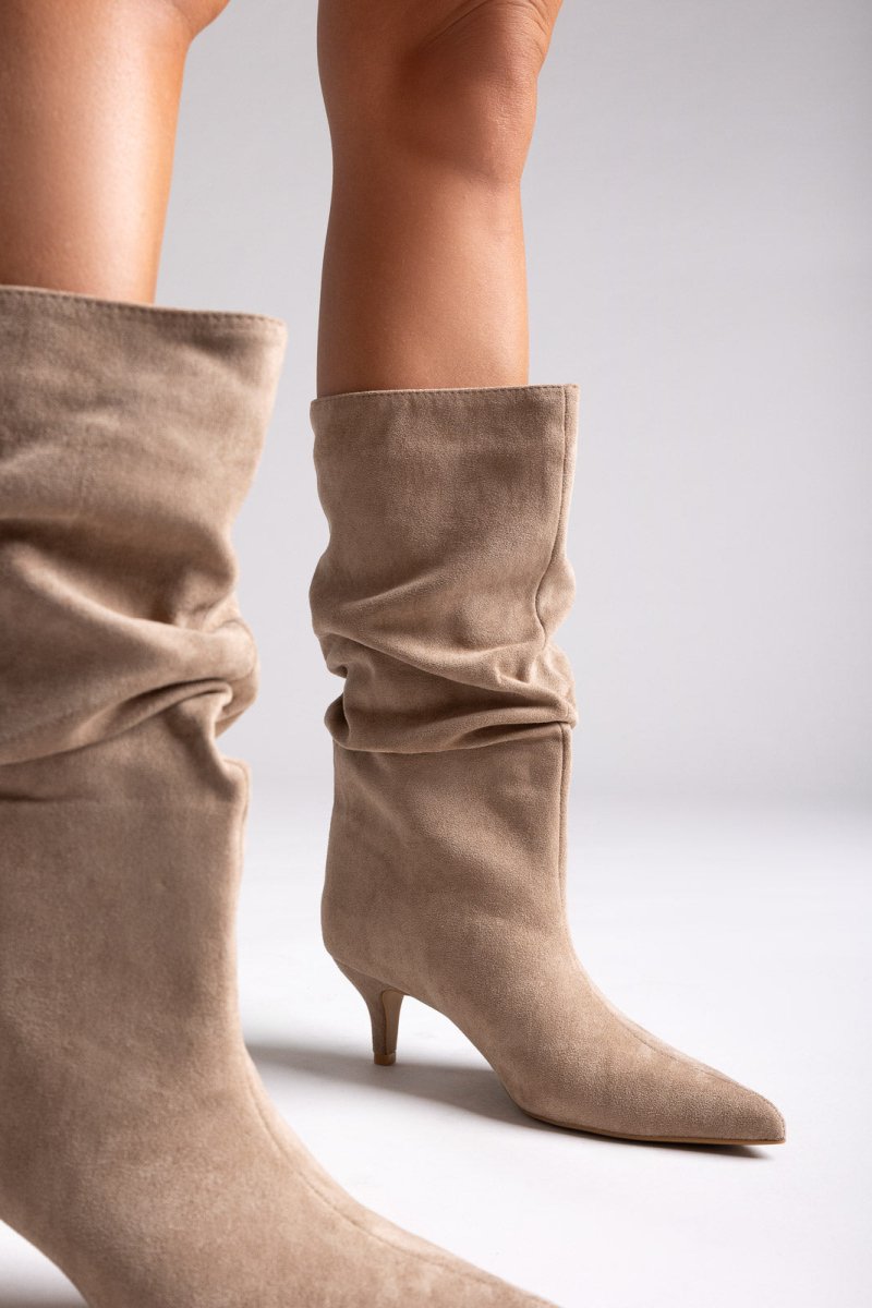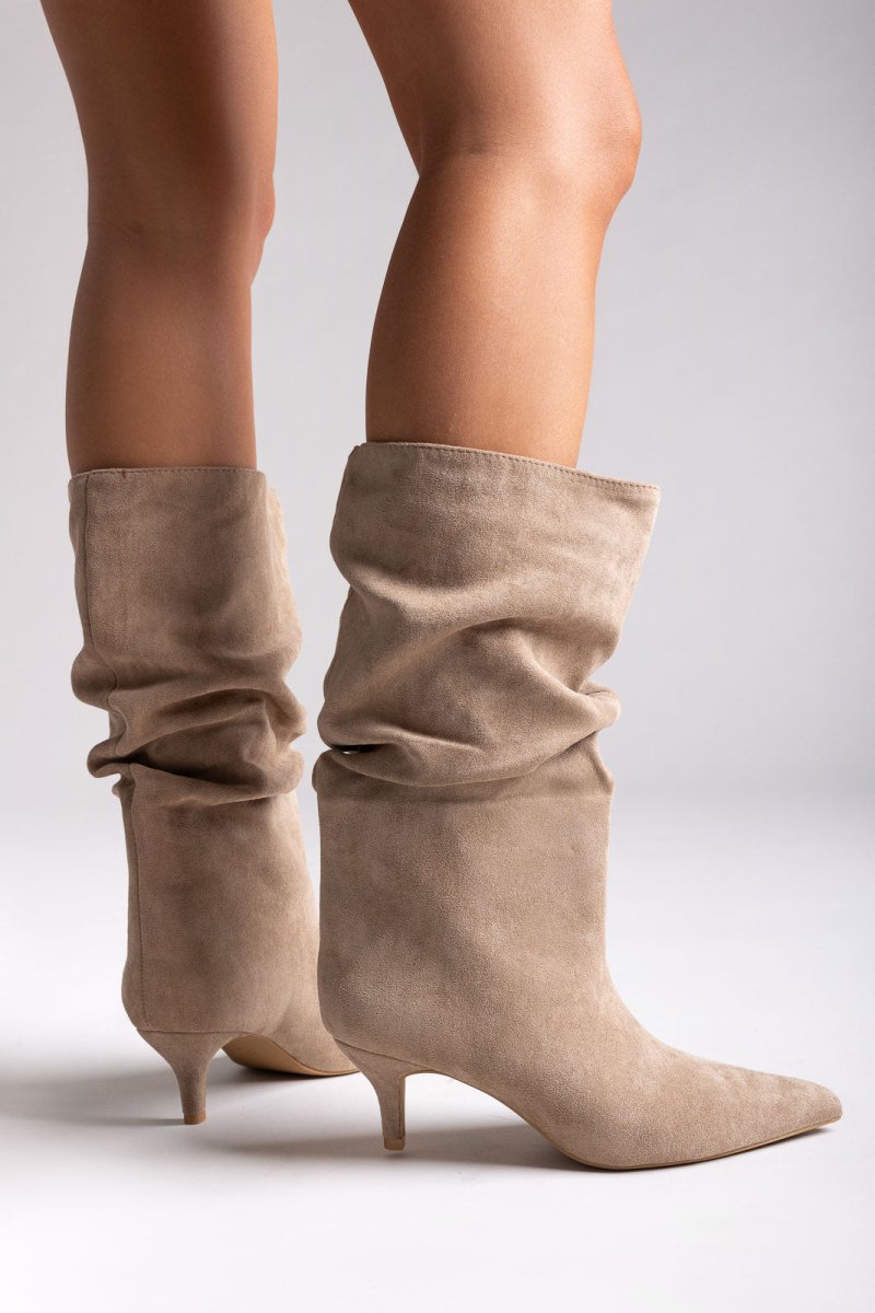 Pointed Suede Slouch Boots with Kitten Heel - Taupe Suede