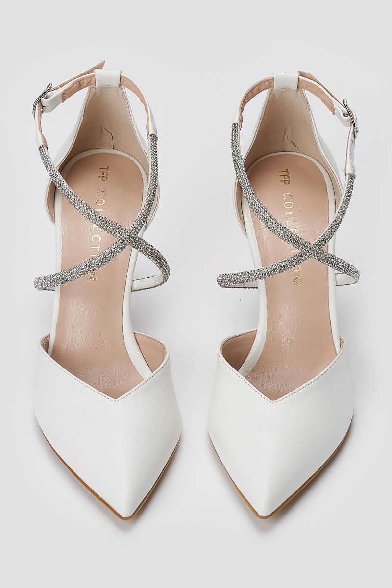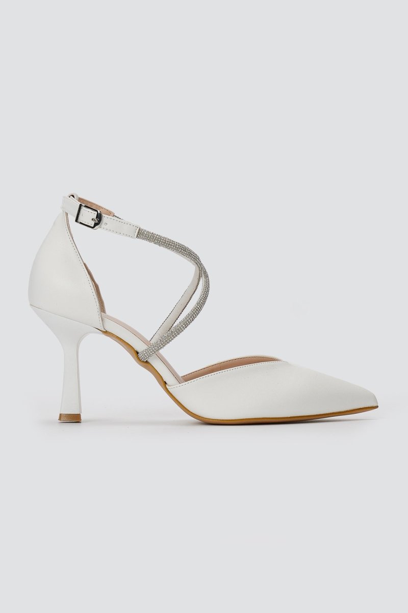 Pointed pumps with open sides, slim stiletto heel and crossover rhinestone straps. Side buckle fastening ensures a secure fit. Elegant lift crafted for modern women.