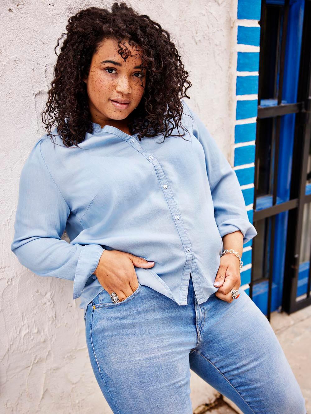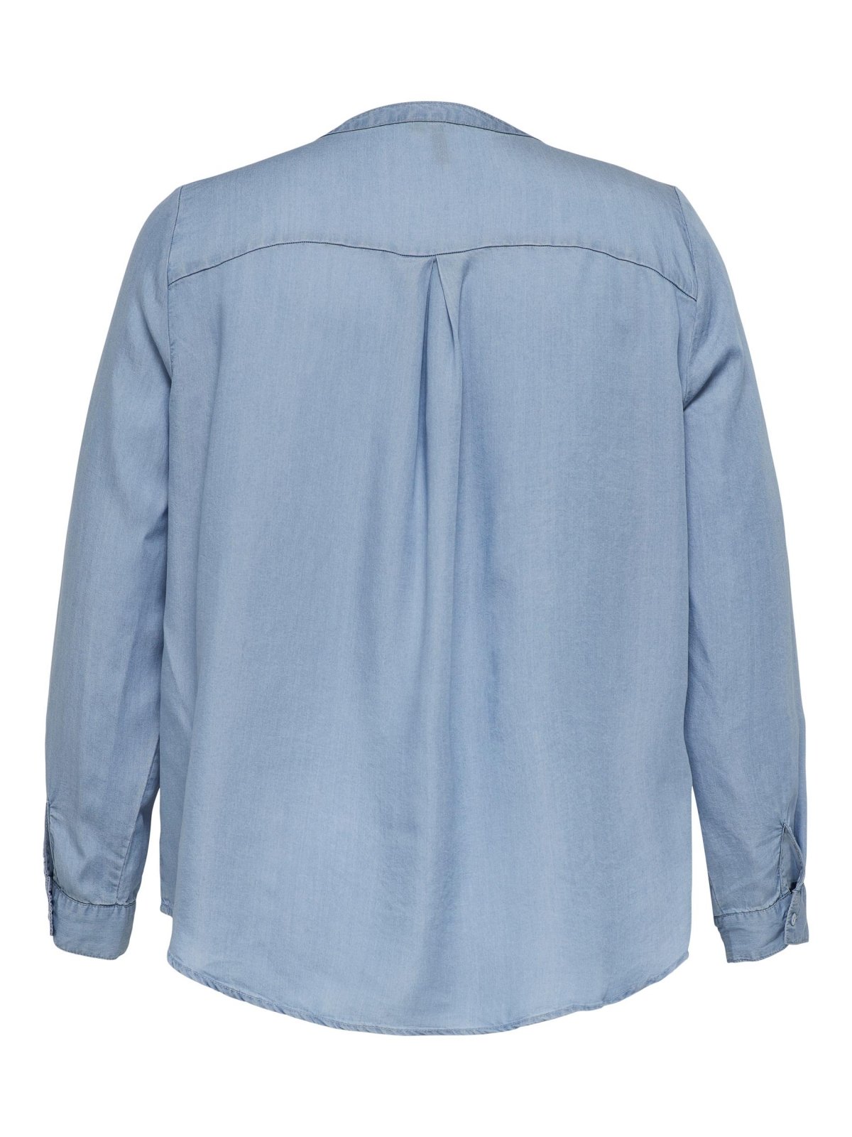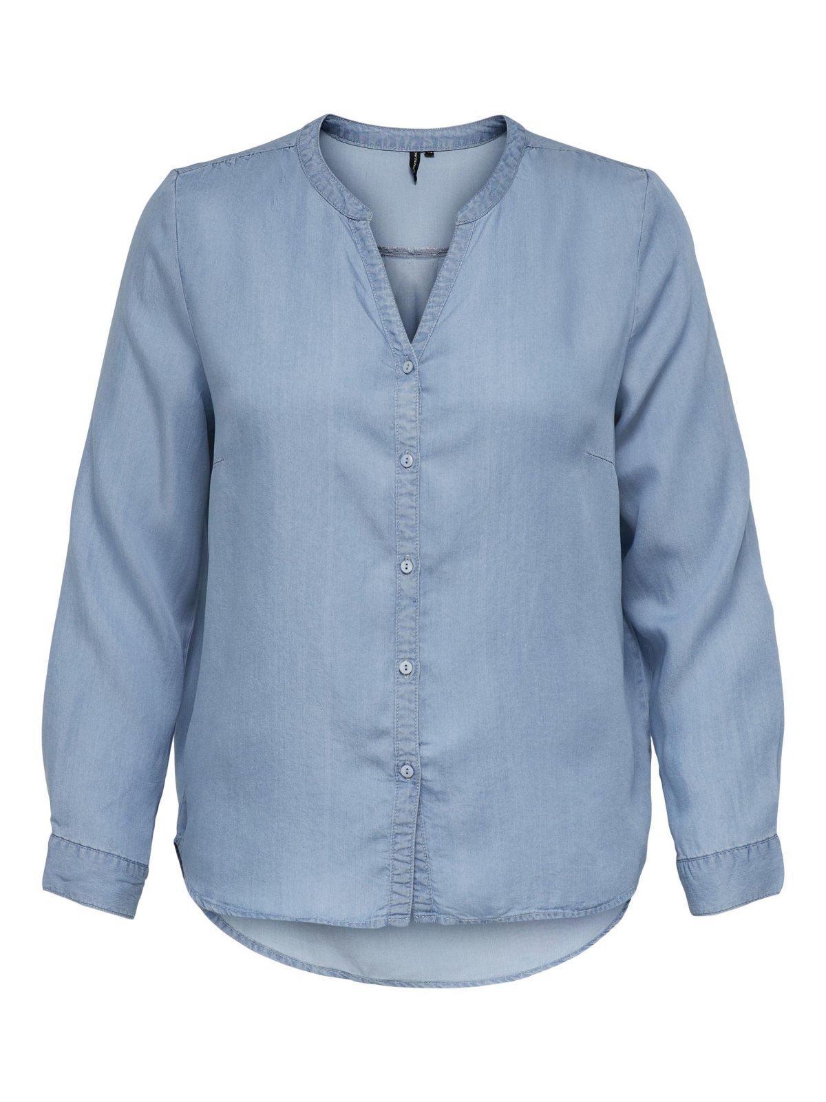 Πουκάμισο plus size σε denim απόχρωση Carmakoma. Έχει μάο γιακά. Κλείνει με κουμπιά. Οβάλ τελείωμα.