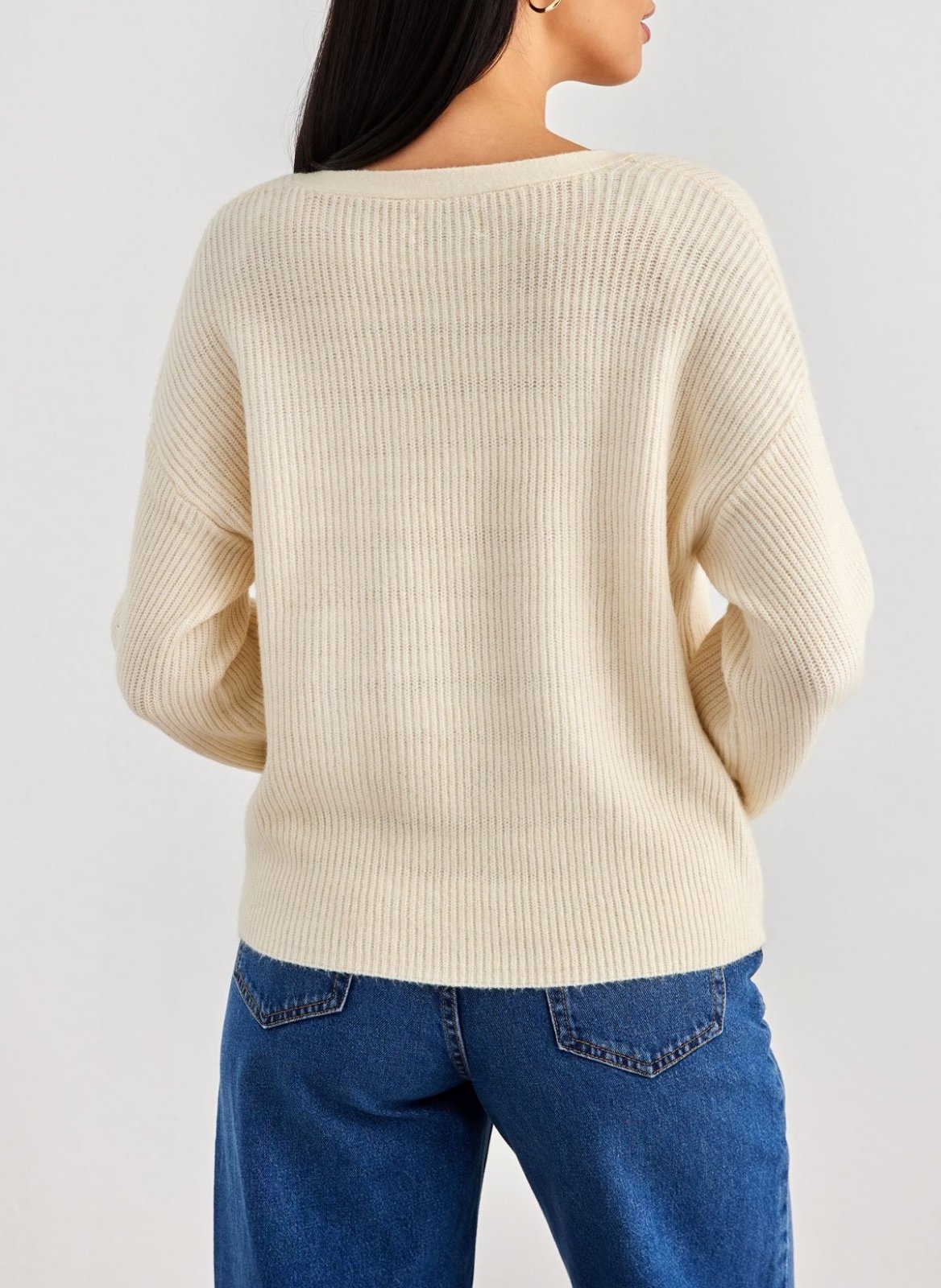 Πουλόβερ σε crop γραμμή ONLY. Έχει ανοιχτή v cut λαιμόκοψη. Στενό τελείωμα με λάστιχο στα μανίκια. Ριμπ πλέξη. Loose εφαρμογή.