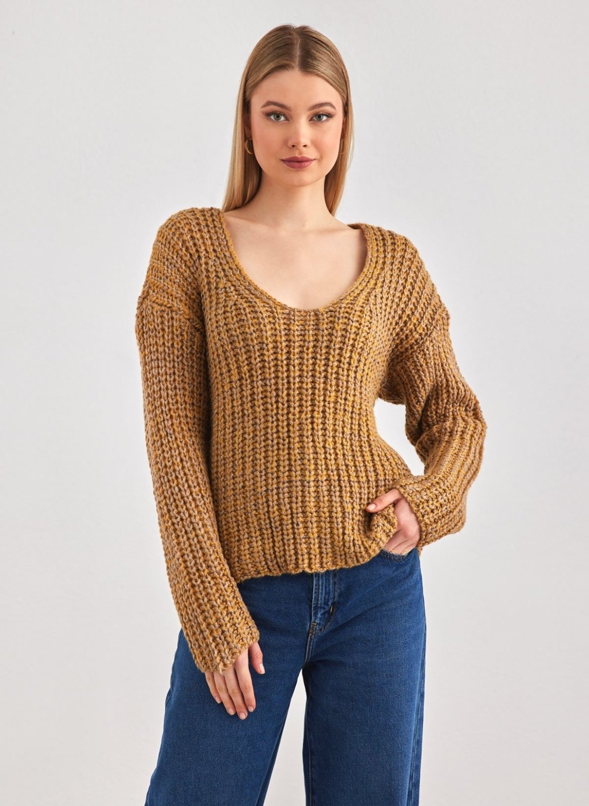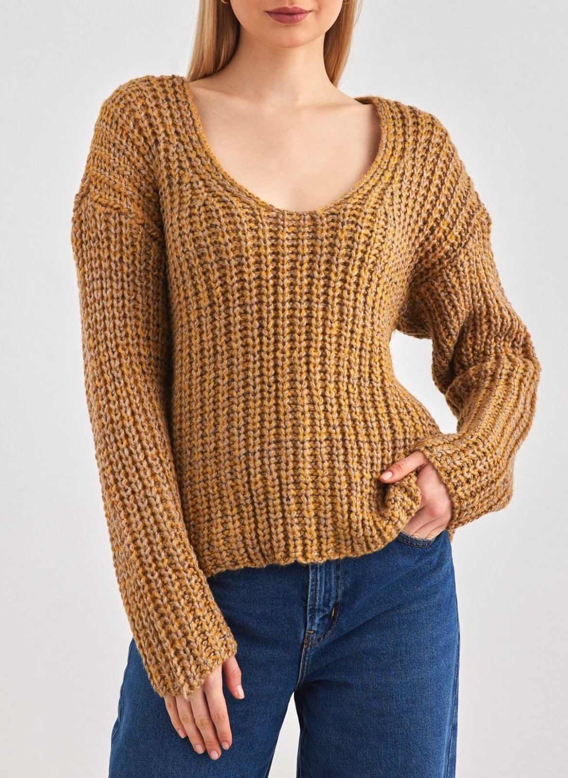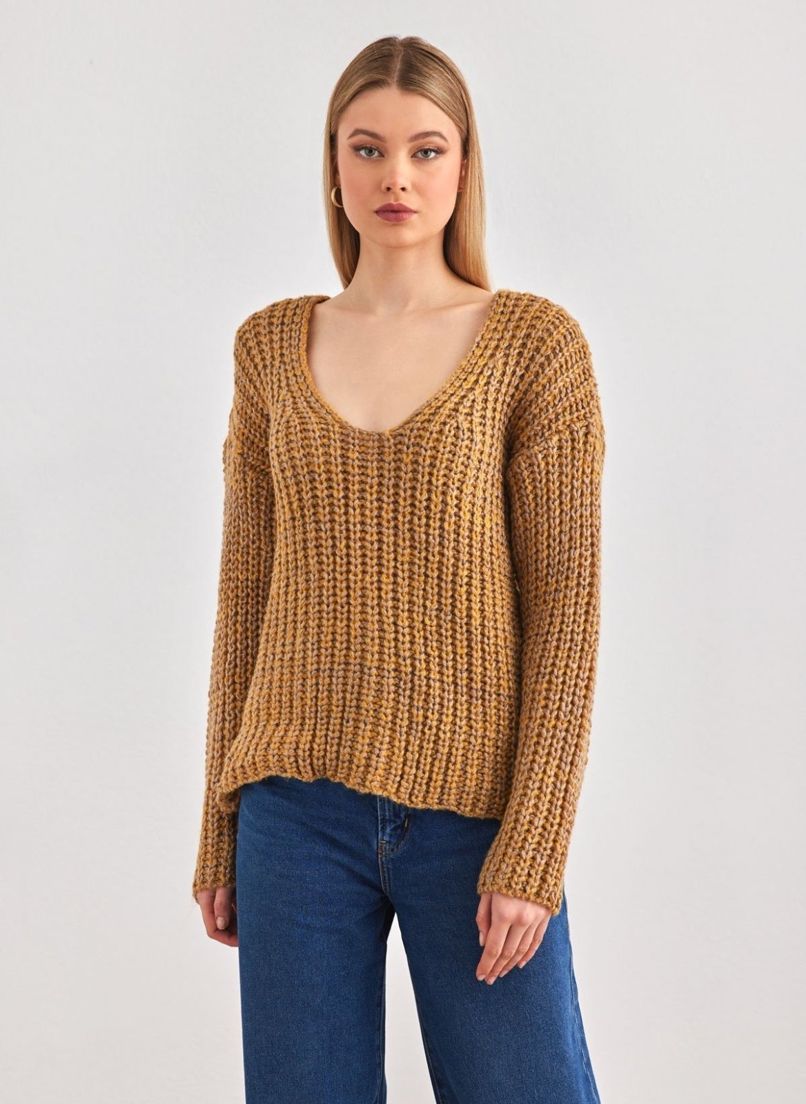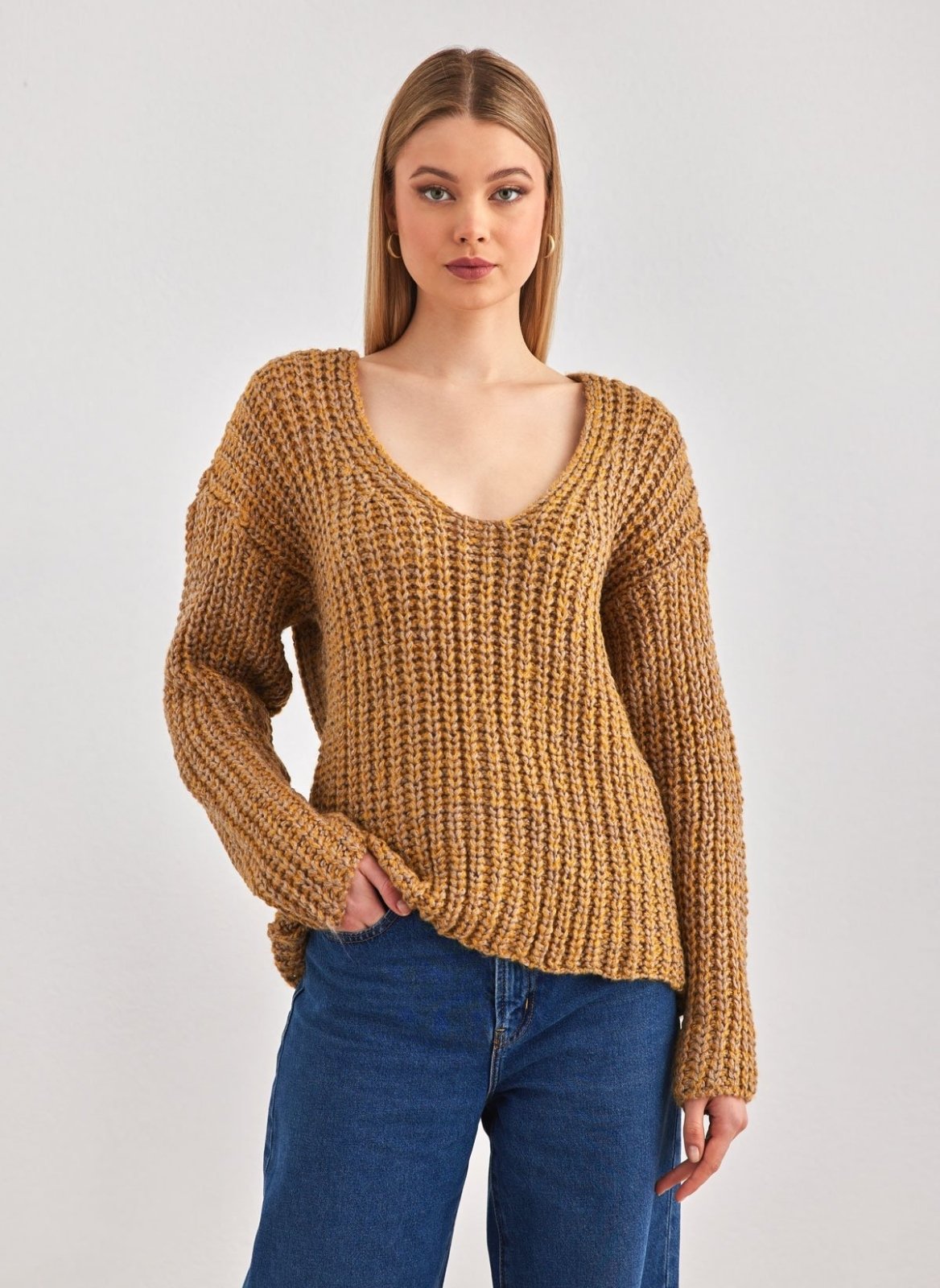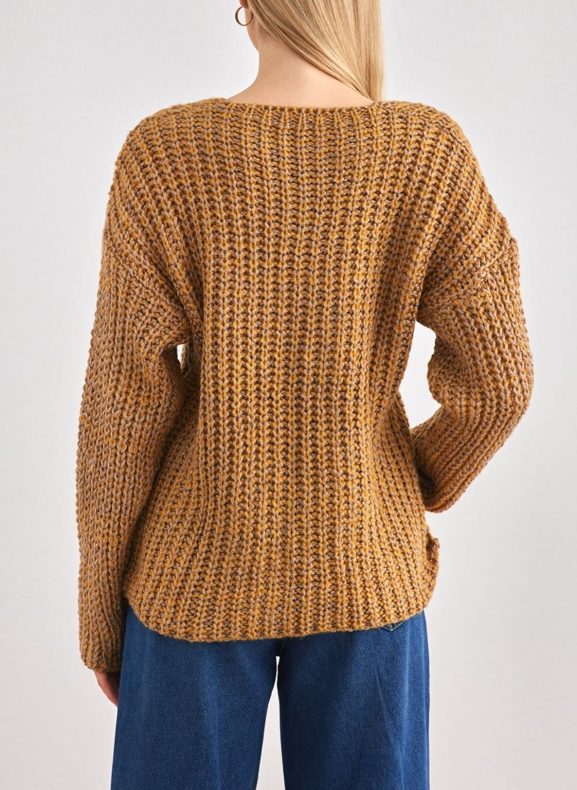 Πουλόβερ με ανοιχτή v cut λαιμόκοψη. Έχει χοντρή πλέξη με διακριτική μεταλλική κλωστή. Ίσια γραμμή.