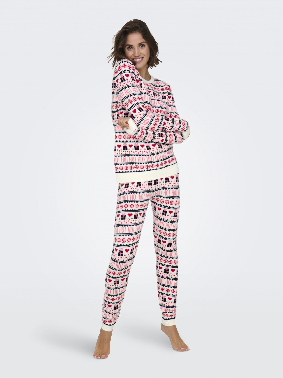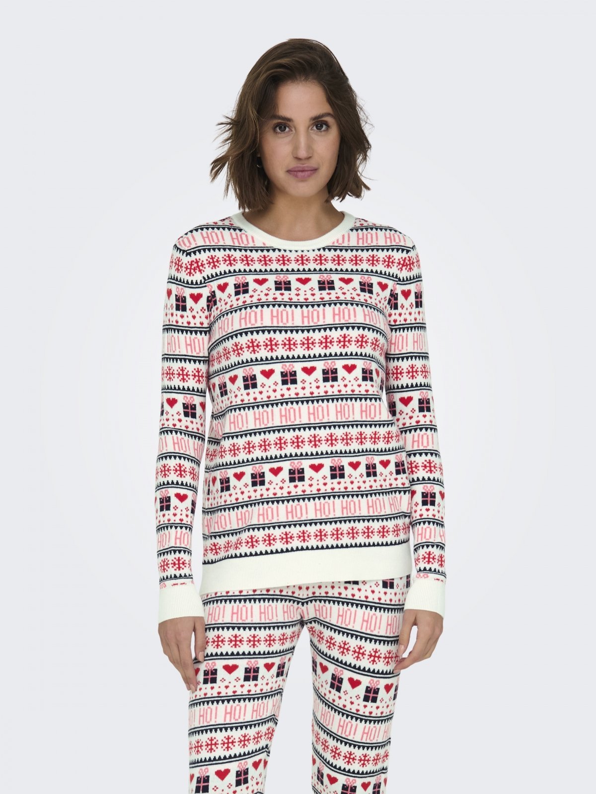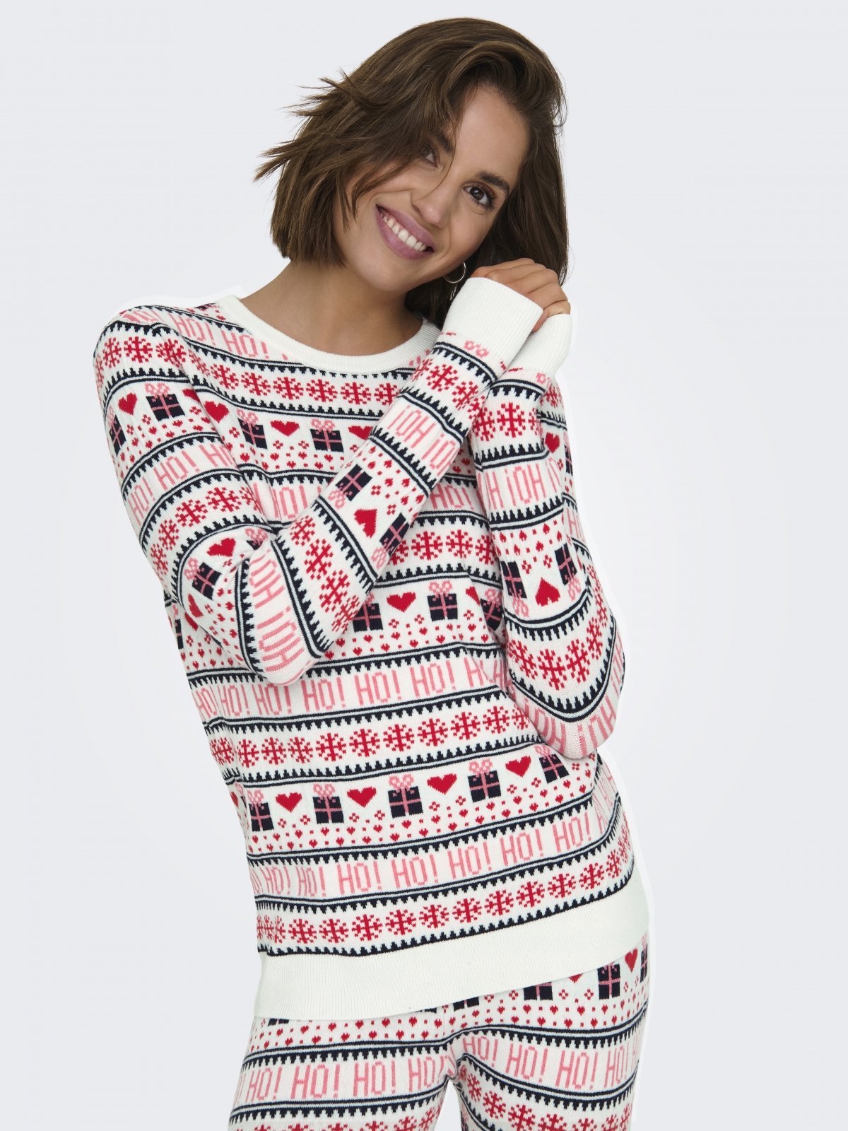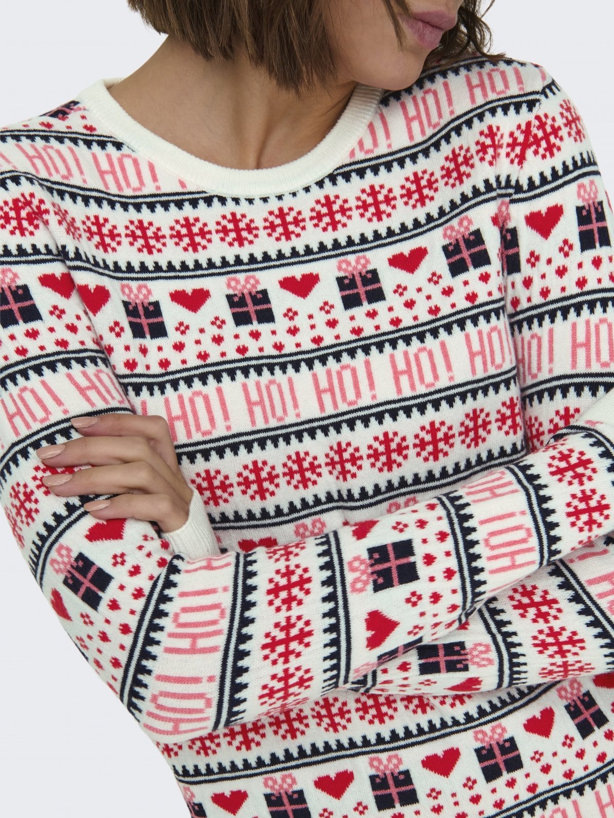 Πουλόβερ με χριστουγεννιάτικα prints ONLY. Στρογγυλή λαιμόκοψη. Λεπτομέρεια ριμπ πλέξη στα μανίκια και το τελείωμα.