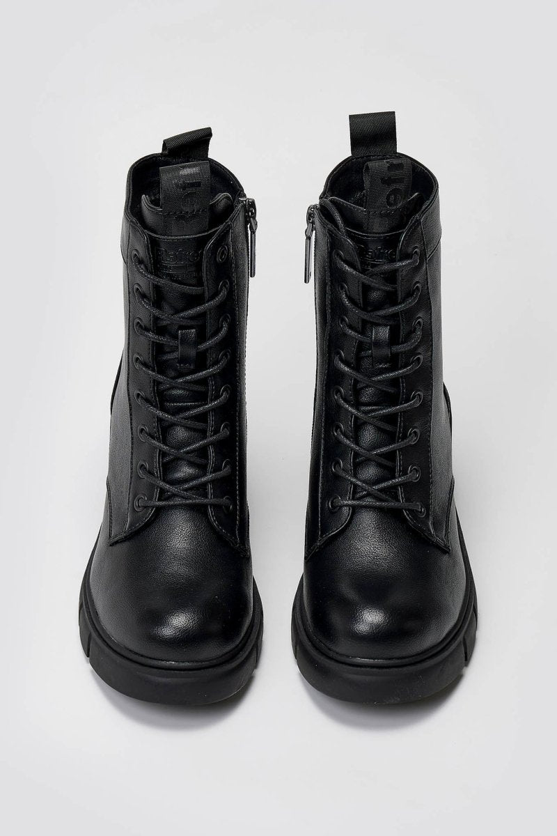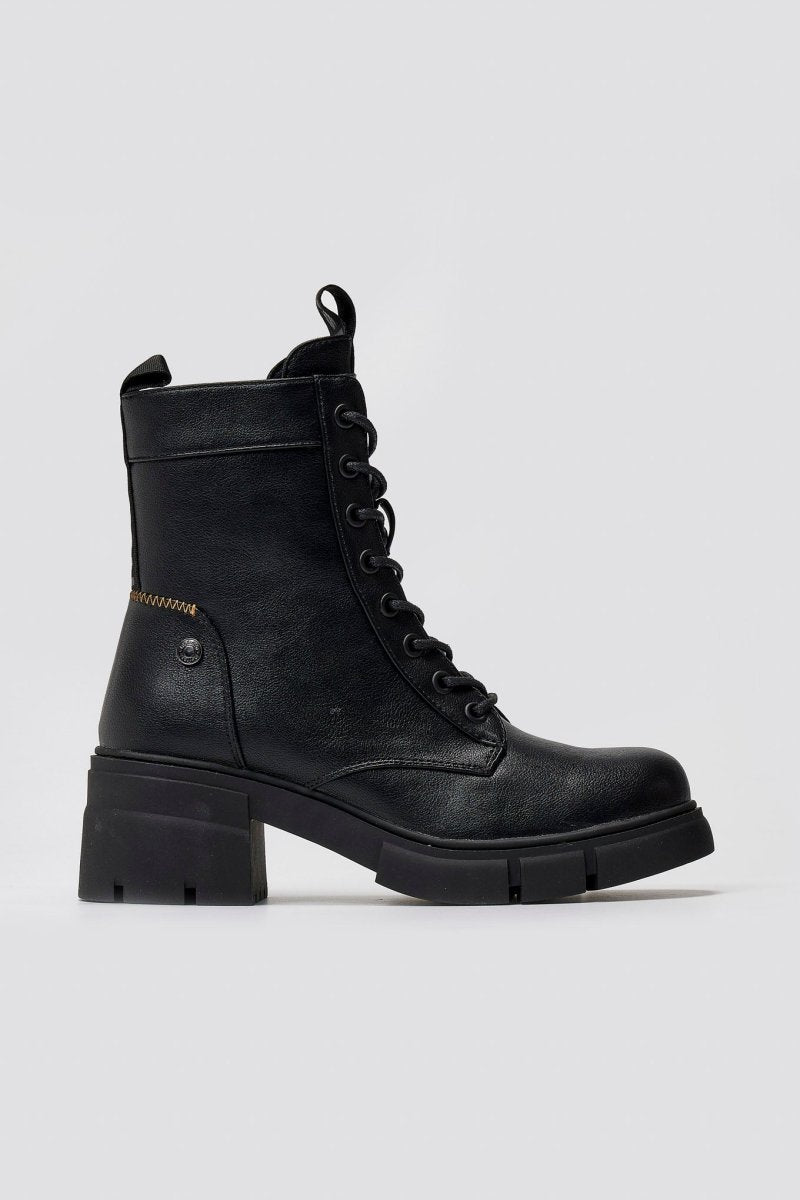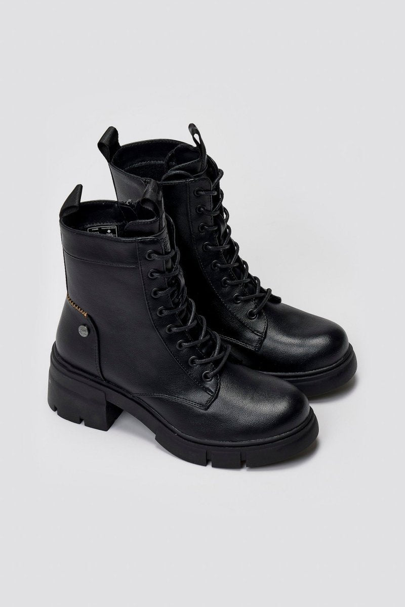 Lace-up vegan ankle boots with low block heel and soft memory foam insole. Featuring comfort biotech support. Certified PETA vegan