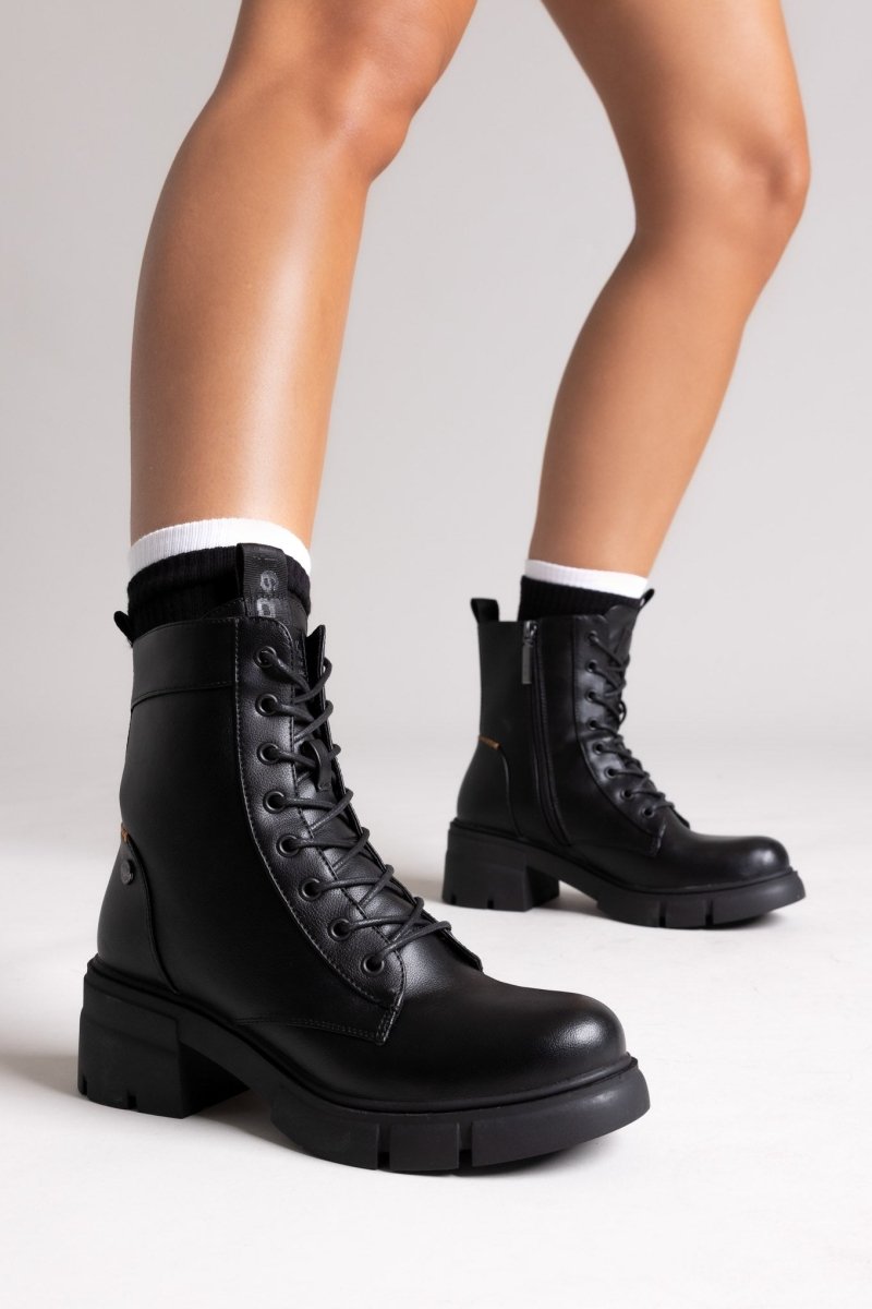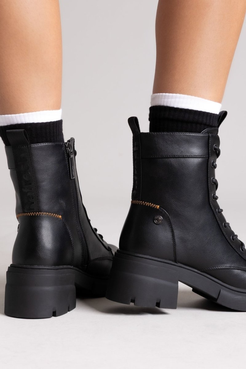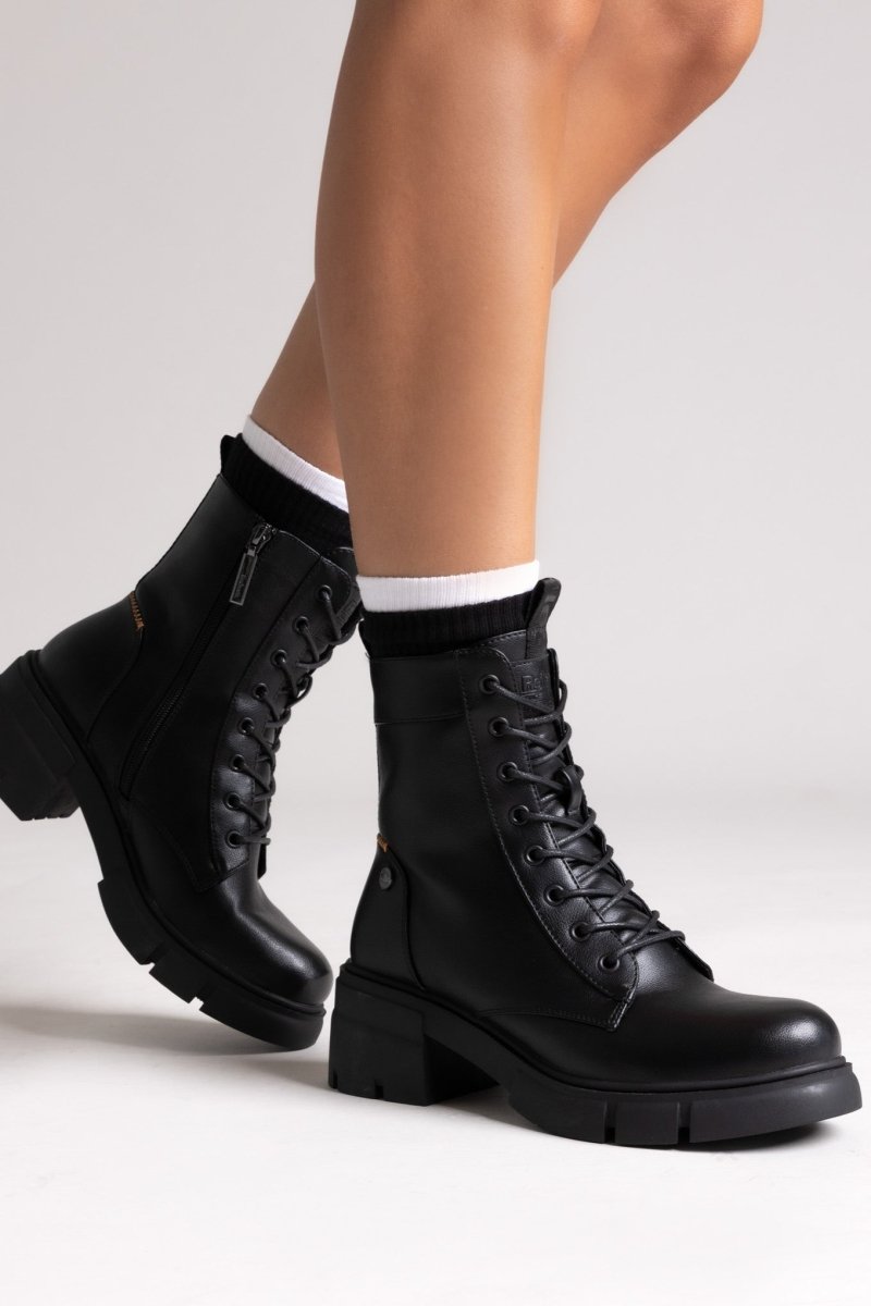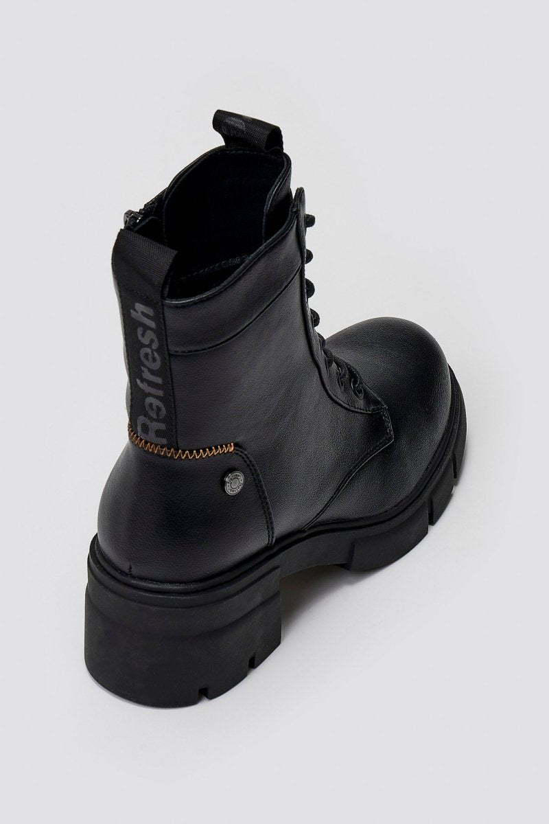 Lace-up vegan ankle boots with low block heel and soft memory foam insole. Featuring comfort biotech support. Certified PETA vegan