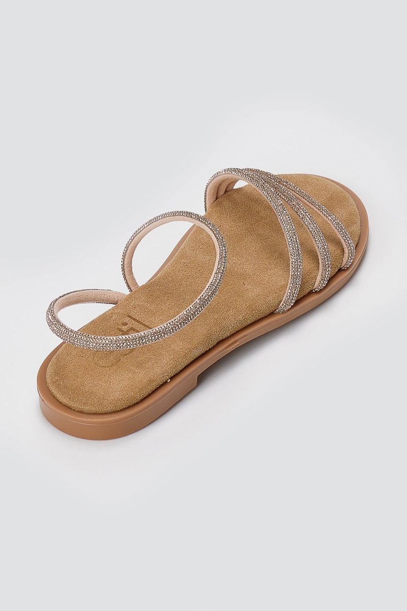 Sandals with a wraparound rhinestone ankle strap and a soft cushioned footbed for added support. Elegant summer style with comfortable all-day wear.