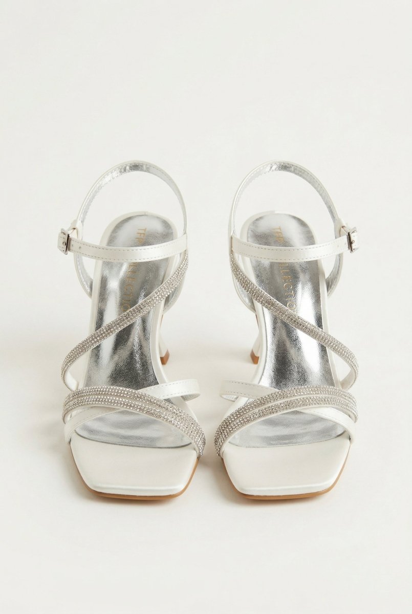 The TFP Rhinestone Strap Heeled Sandals in White Pearl are the ultimate choice for sophisticated evening wear and elevated summer occasions. These elegant sandals feature stunning rhinestone-embellished straps that catch the light beautifully, paired with a sleek slim heel and refined ankle bar closure. Designed for those who appreciate timeless elegance with a touch of glamour, these heeled sandals seamlessly transition from special events to upscale casual outings.