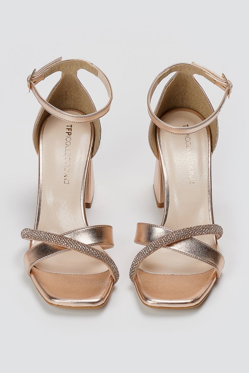 Elegant sandals with crossover rhinestone toes, square profile and closed heel with ankle strap. Leather insole, secure comfort. Greek-made craftsmanship for events.
