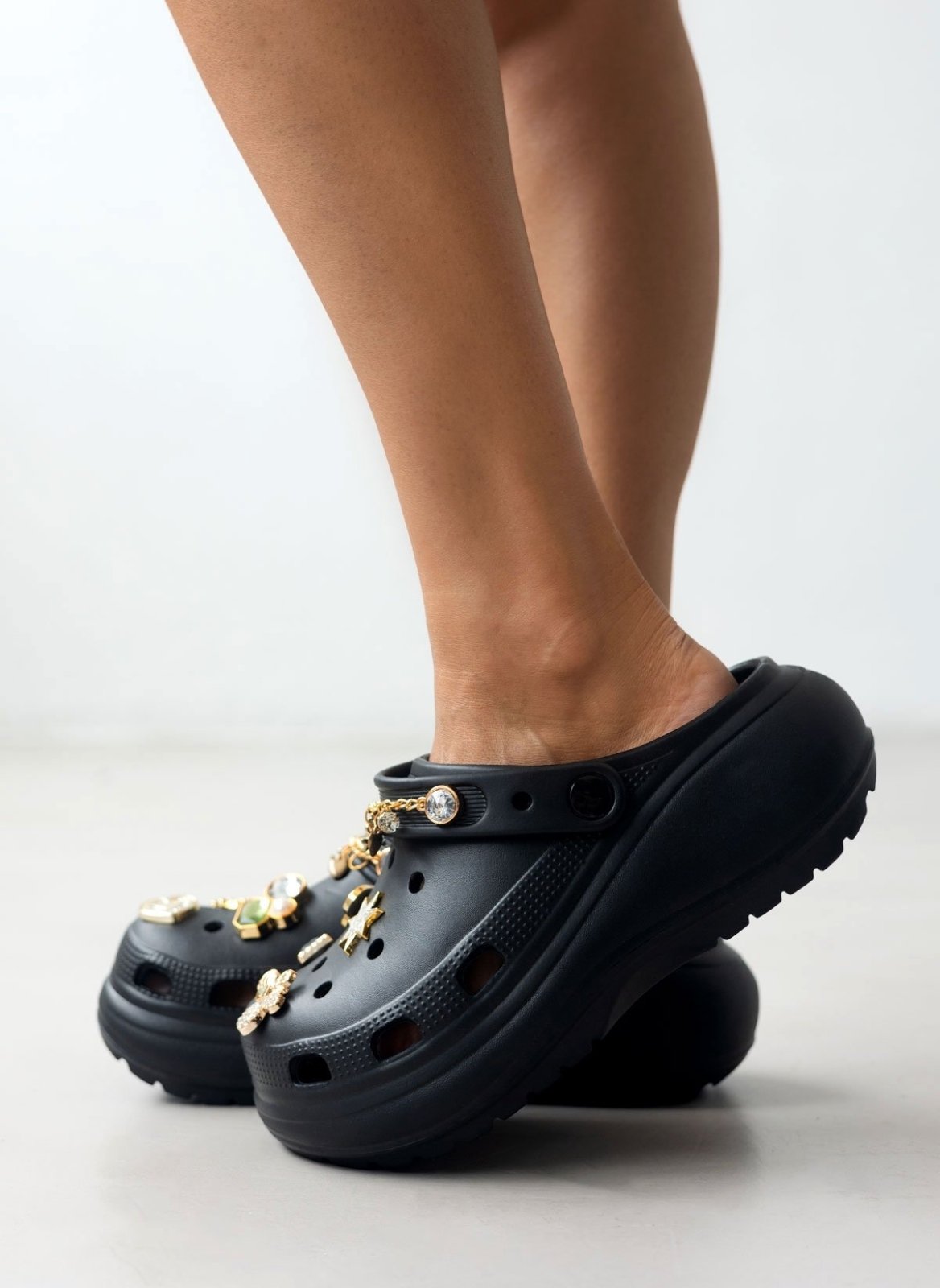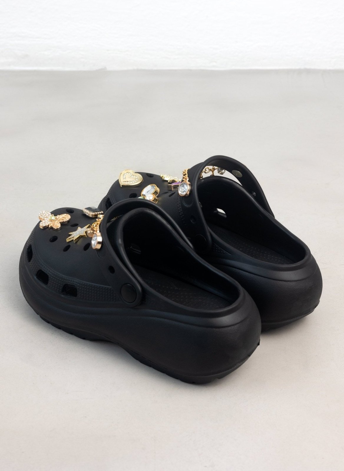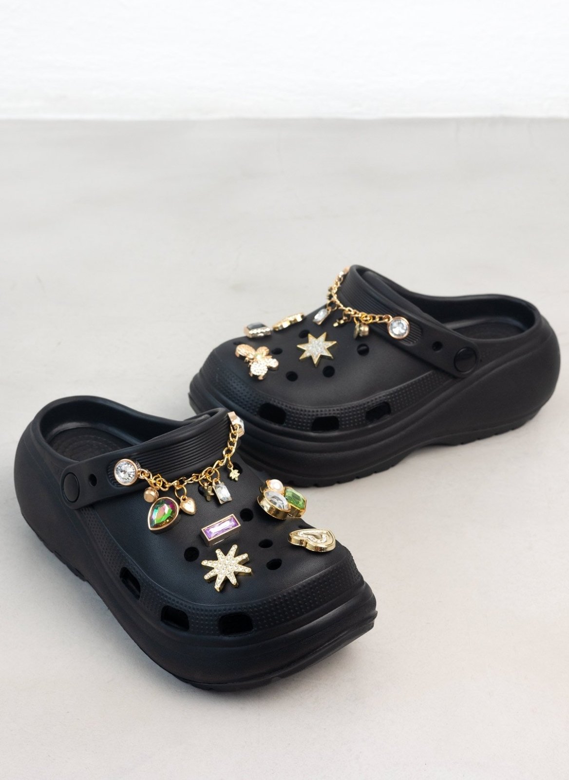 Σαμπό με διάτρητο σχέδιο στο πάνω μέρος. Διακοσμητικά charms με στρας και πέτρες. Λεππτομέρεια με αλυσίδα. Έχουν ψηλή σόλα και ανατομικό σχήμα στον πάτο.