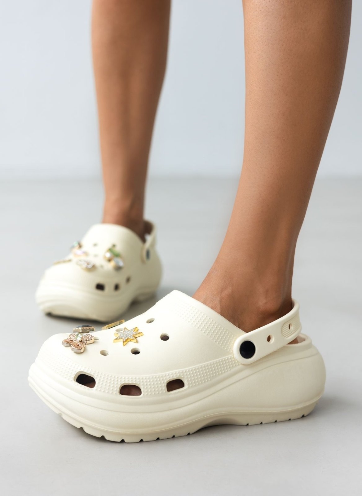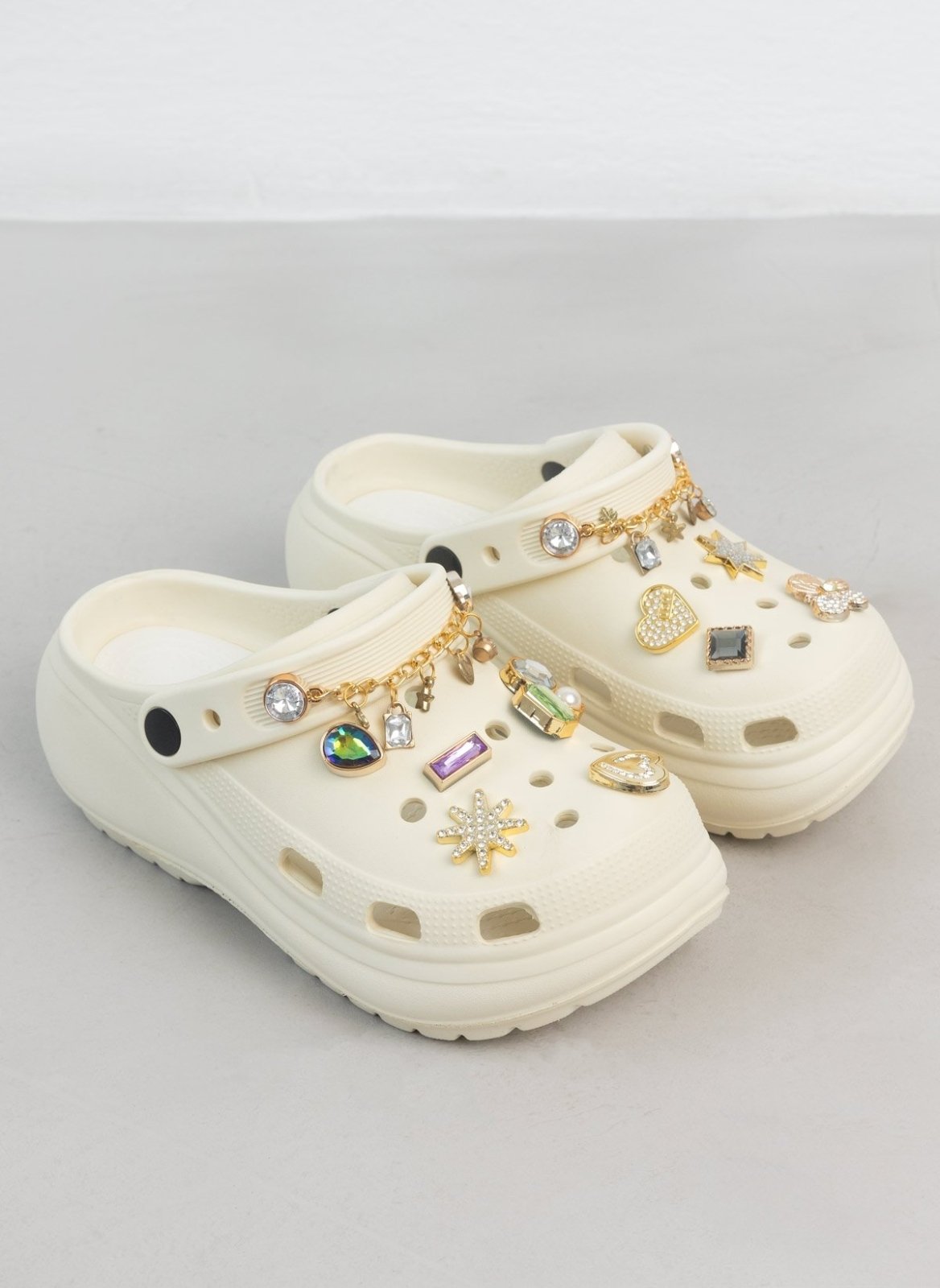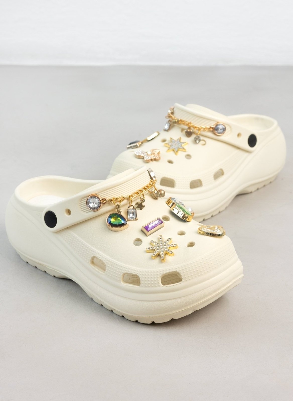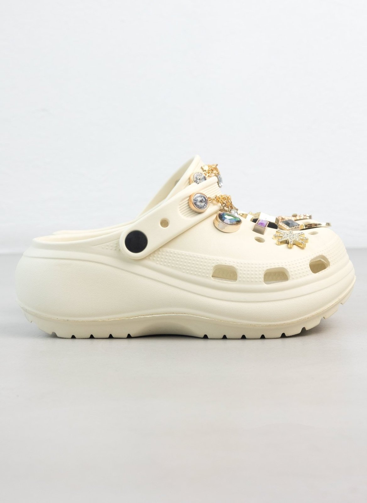 Σαμπό με διάτρητο σχέδιο στο πάνω μέρος. Διακοσμητικά charms με στρας και πέτρες. Λεππτομέρεια με αλυσίδα. Έχουν ψηλή σόλα και ανατομικό σχήμα στον πάτο.