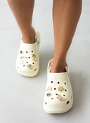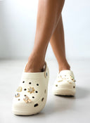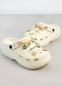 Σαμπό με διάτρητο σχέδιο στο πάνω μέρος. Διακοσμητικά charms με στρας και πέτρες. Λεππτομέρεια με αλυσίδα. Έχουν ψηλή σόλα και ανατομικό σχήμα στον πάτο.