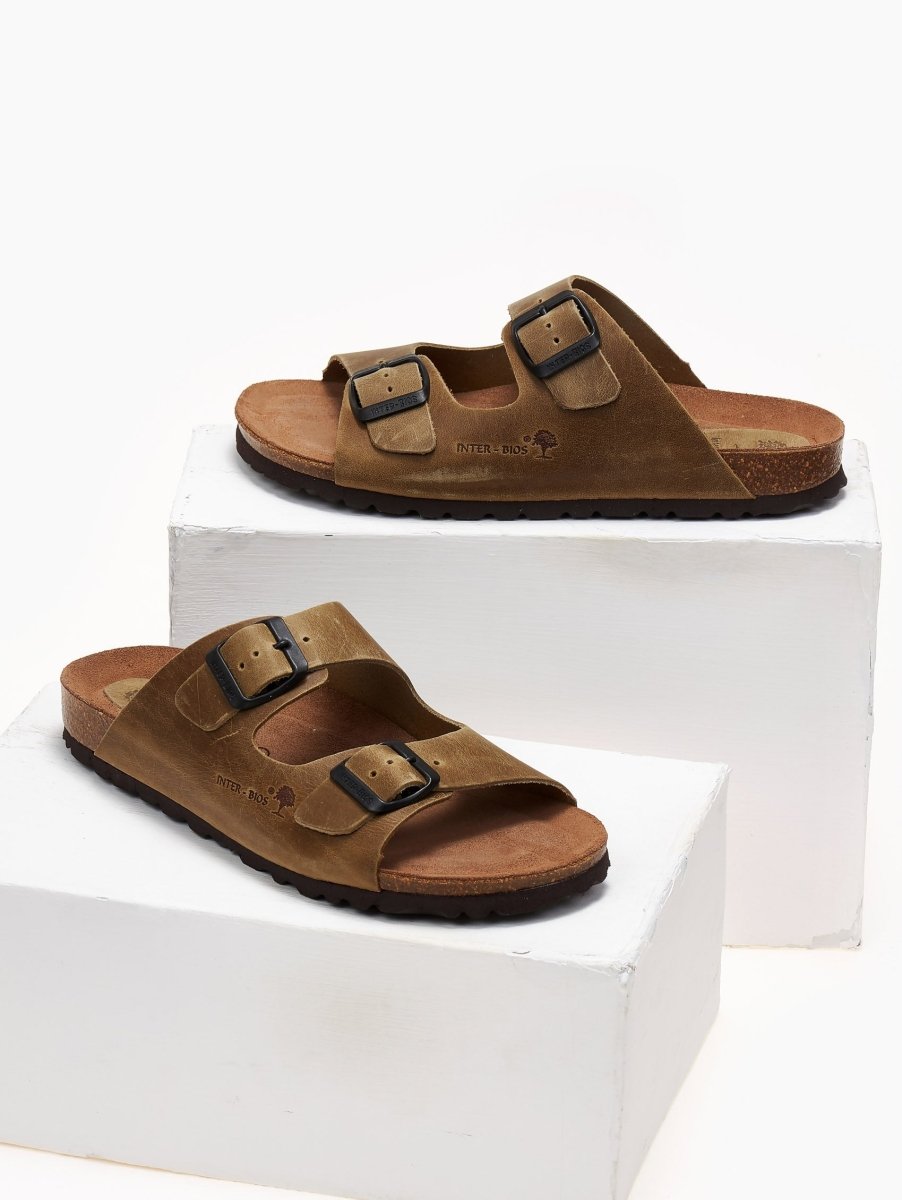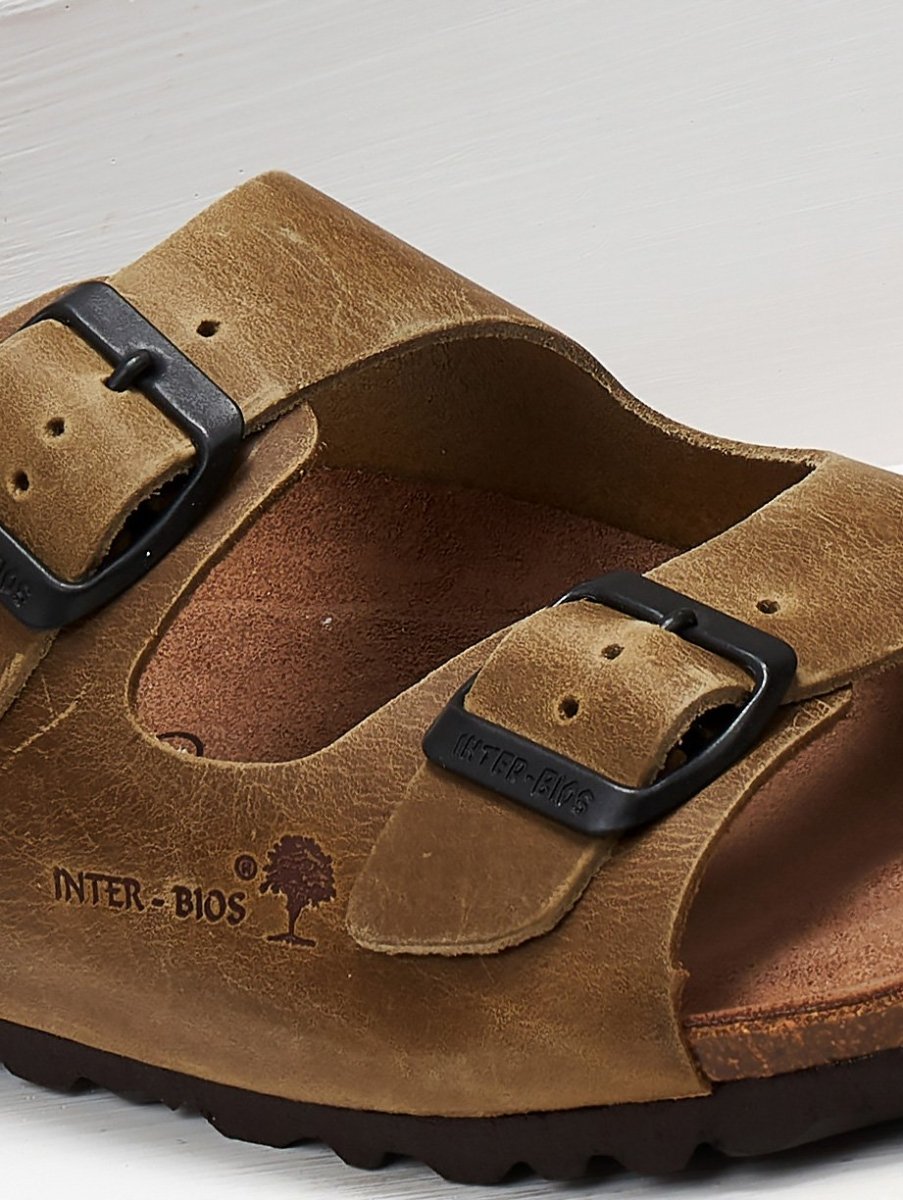 Σανδάλια δερμάτινα Interbios. Πάτος με ανατομικό σχήμα από δέρμα καστόρι. Έχουν σόλα fusberg από latex φελλό. Φάσες ανοιγόμενες με μεταλλικούς τοκάδες. Made in Spain.