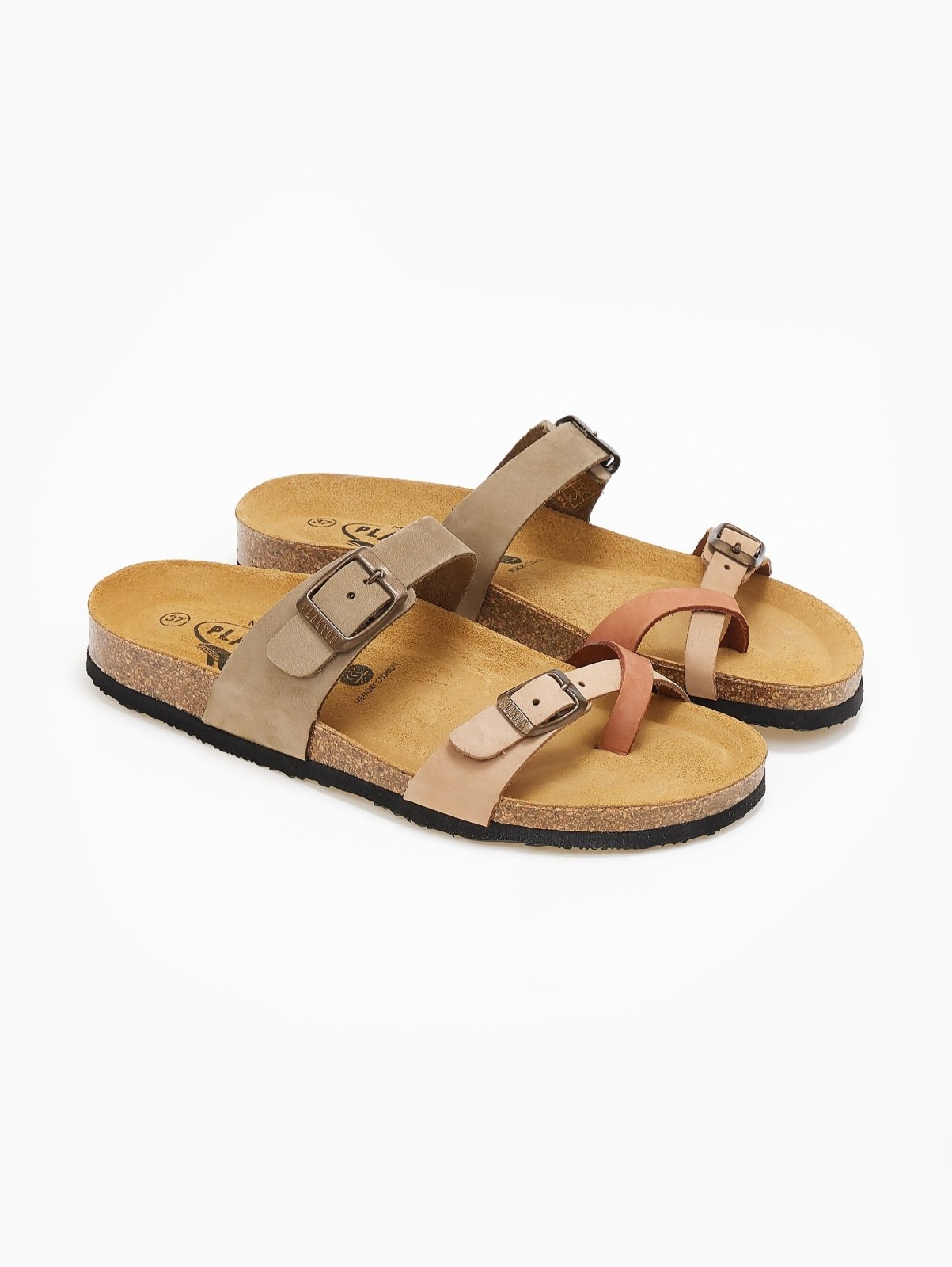 Σανδάλια από δέρμα Plakton. Συνδιασμός χρωμάτων. Έχουν δύο φάσες με μεταλλικούς τοκάδες. Χιαστί λουράκια μπροστά. Ο πάτος είναι καστόρινος με Memory Cushion Technology και φυσικό φελλό. Made in Spain.