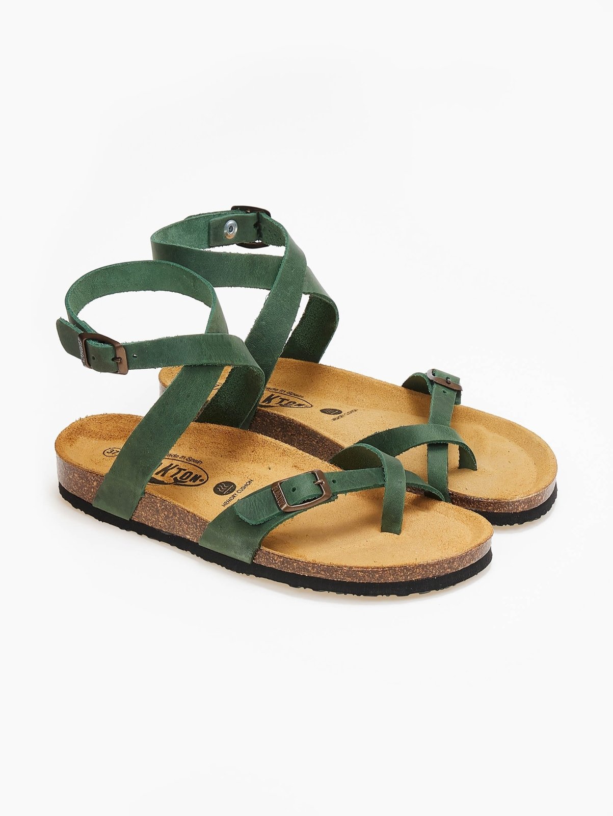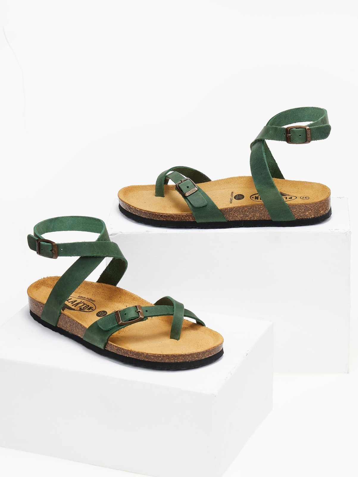 Σανδάλια δερμάτινα Plakton. Έχουν σχέδιο χιαστί στα δάκτυλα. Δένουν με λουράκι στο ύψος του αστραγάλου. Καστόρινος πάτος με ανατομικό σχήμα. Made in Spain.