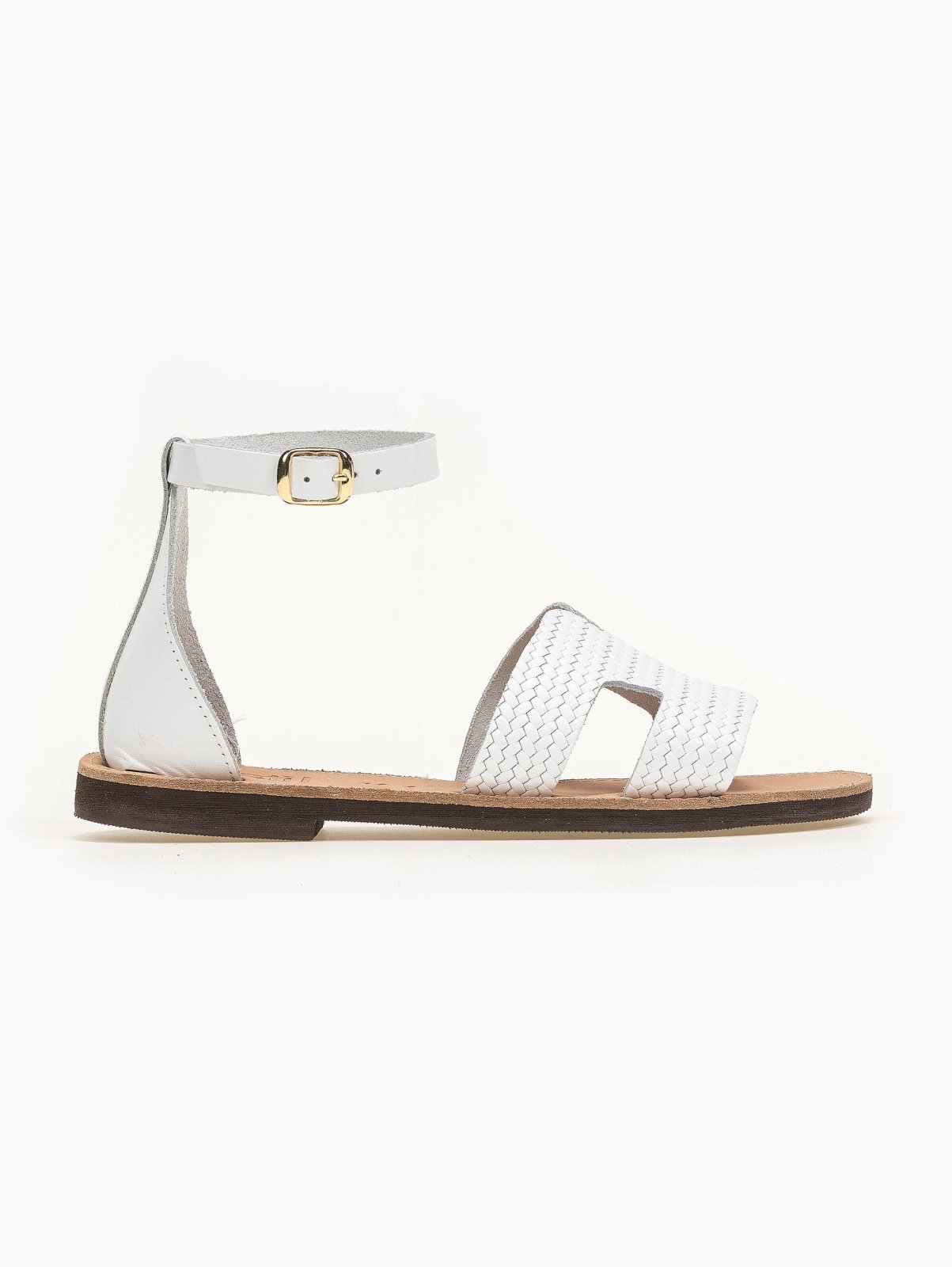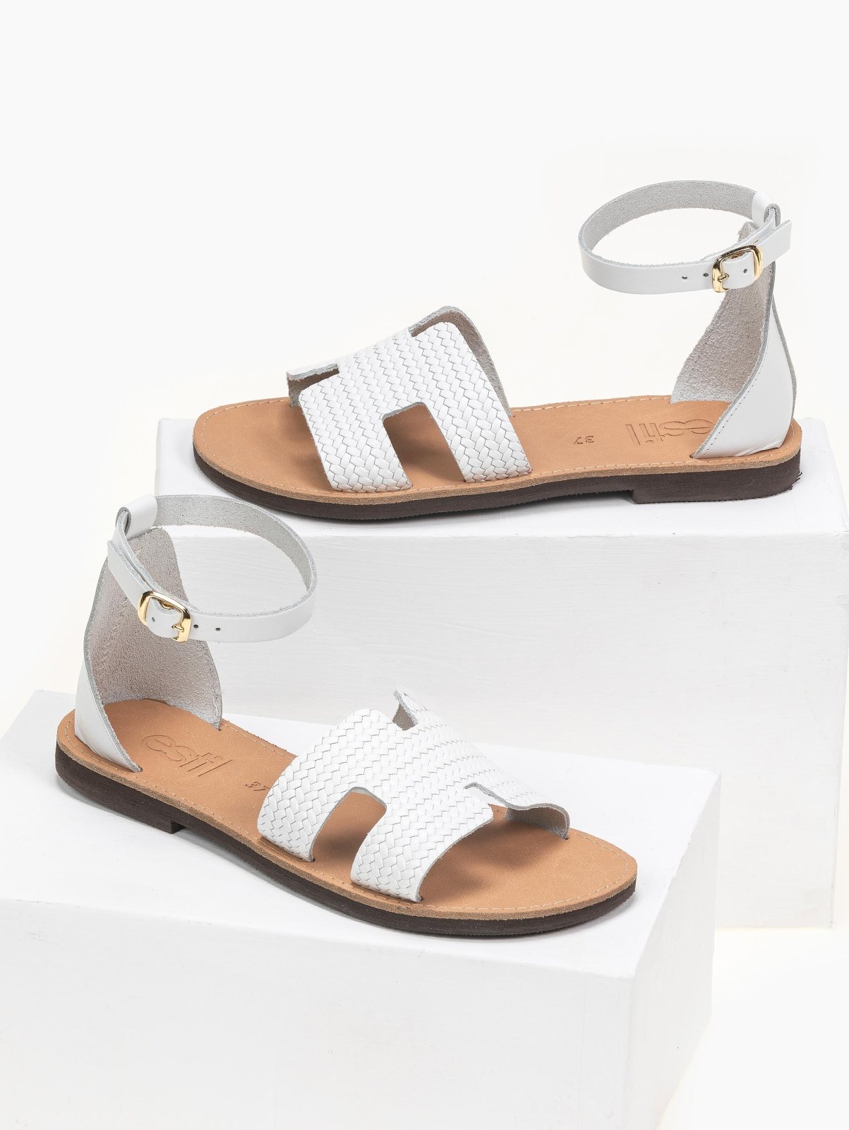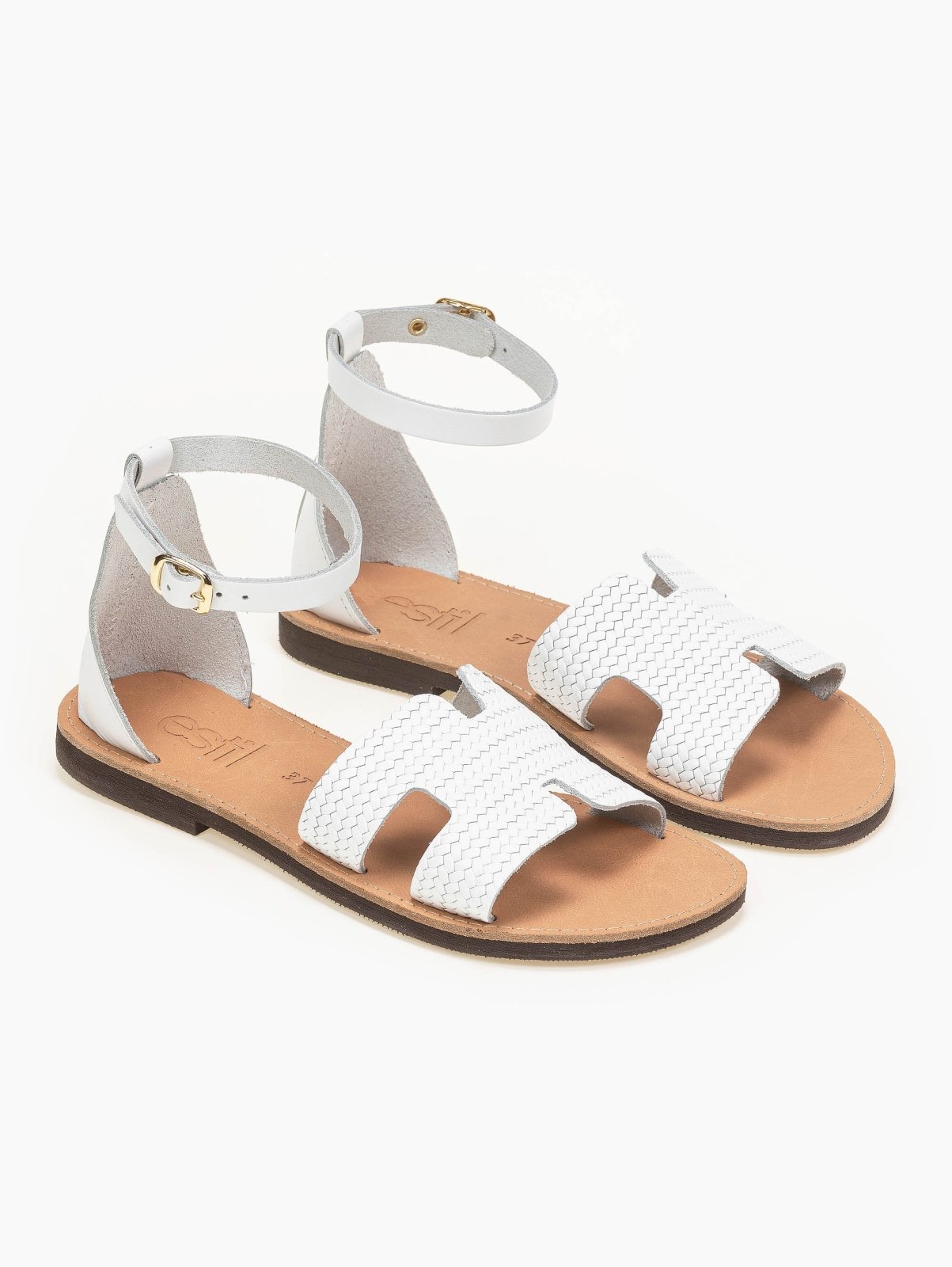 Estil φλατ σανδάλια με ανοίγματα στη φάσα. Έχουν pattern ψάθα. Η φτέρνα είναι κλειστή και δένουν με μπαρέτα στο ύψος του αστραγάλου. Ελληνικής κατασκευής,χειροποίητα.