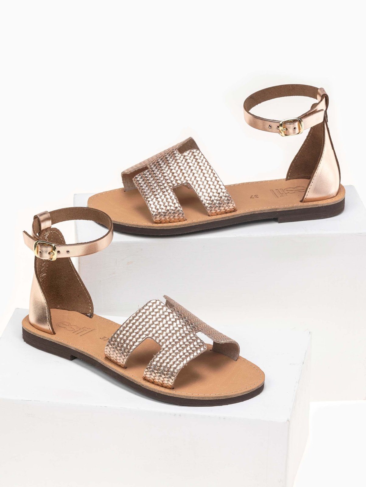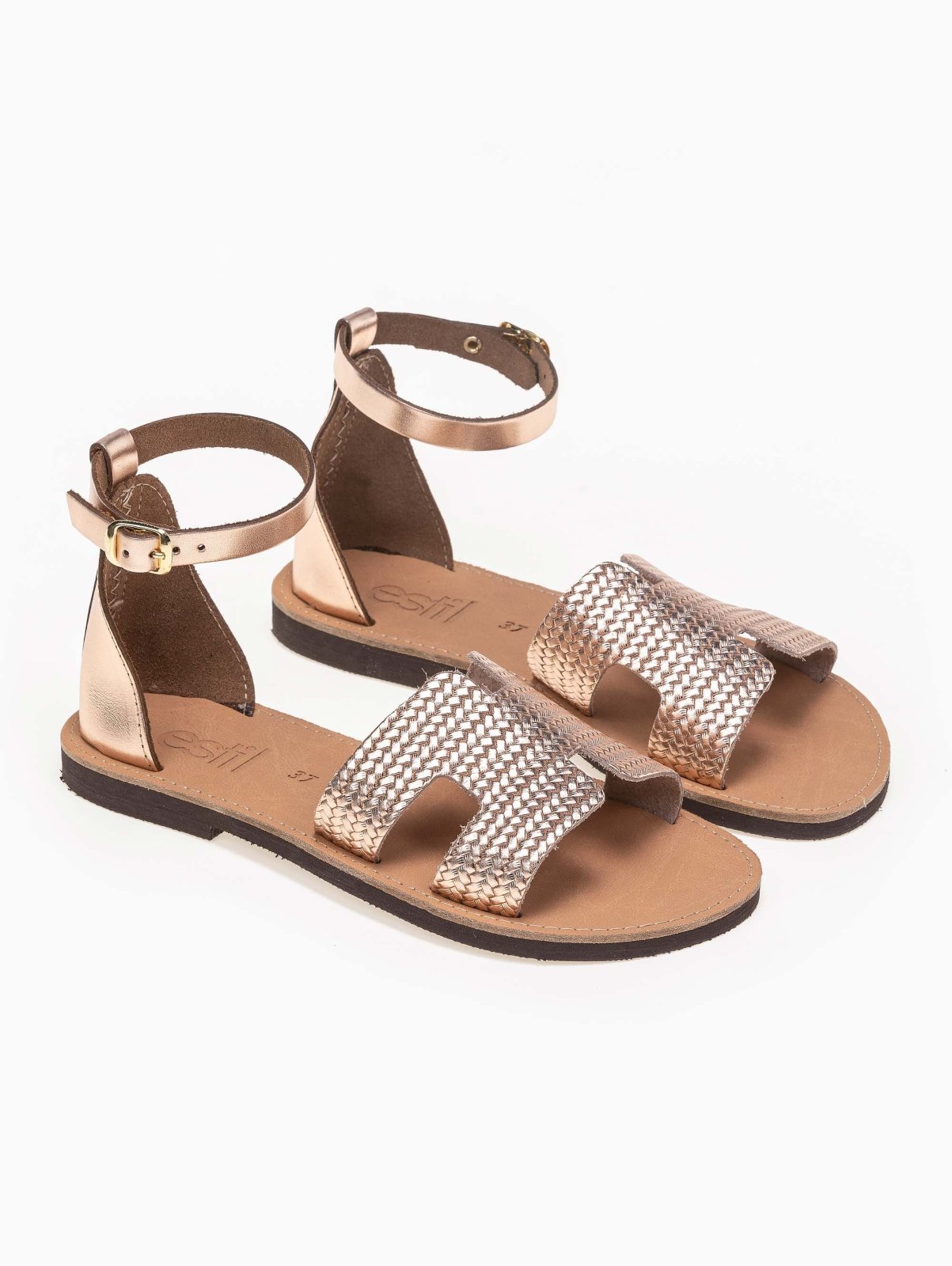 Estil φλατ σανδάλια με ανοίγματα στη φάσα. Έχουν pattern ψάθα. Η φτέρνα είναι κλειστή και δένουν με μπαρέτα στο ύψος του αστραγάλου. Ελληνικής κατασκευής,χειροποίητα.