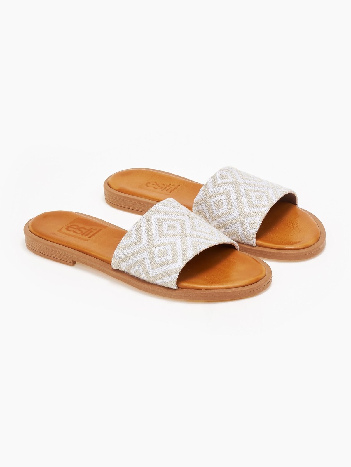 Σανδάλια δερμάτινα με φαρδιά υφασμάτινη boho φάσα estil. Έχουν μαλακή σόλα. Δερμάτινος πάτος με ενίσχυση. Ελληνικής κατασκευής.