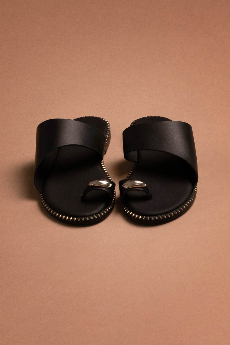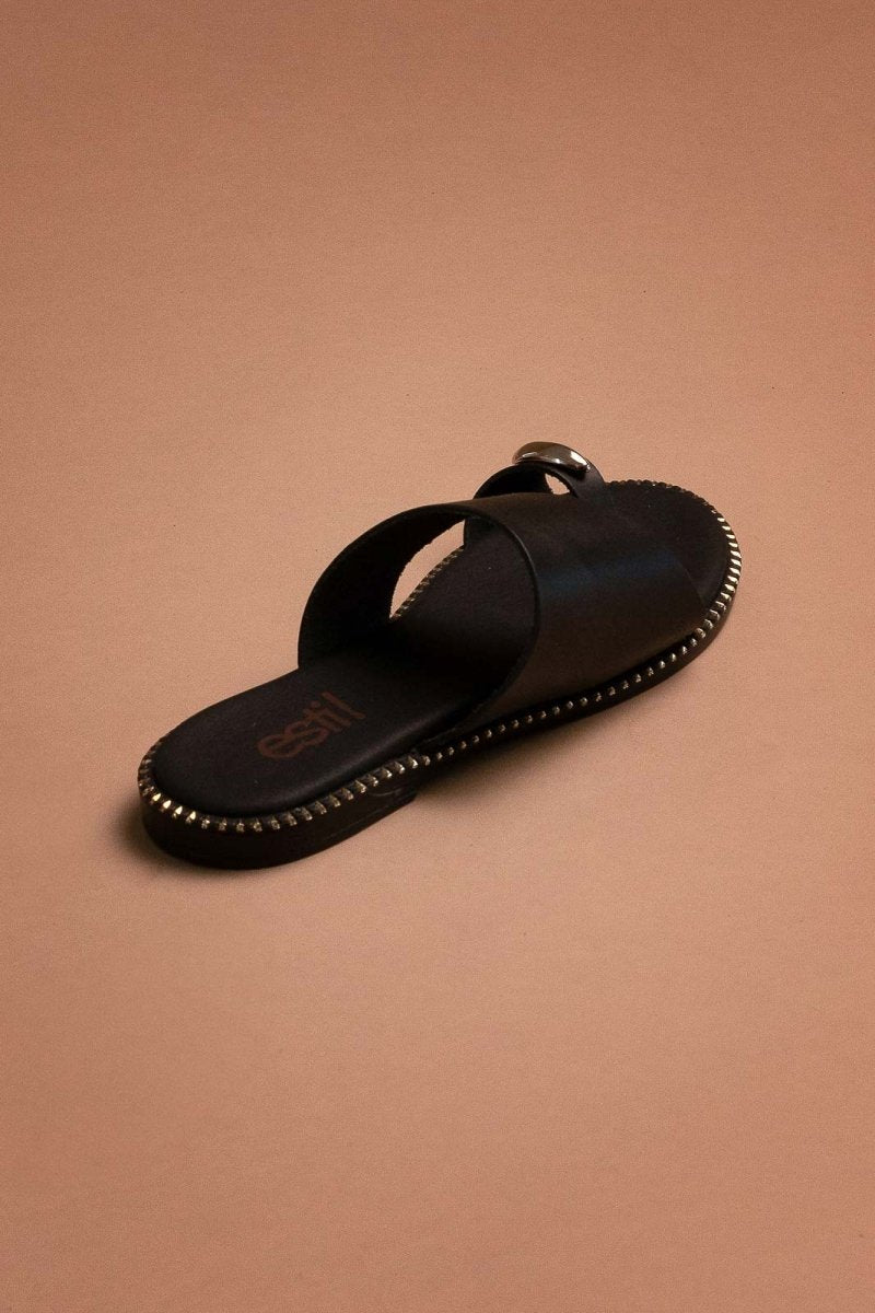 Σανδάλαι από γνήσιο δέρμα Estil. Φαρδιά ασύμμετρη φάσα στο κουτεπιέ. Δάκτυλο με έντονο μεταλλικό στοιχείο. Μεταλλικά τρουκς περιμετρικά της σόλας. Μαλακός πάτος με ενίσχυση. Ελληνικής κατασκευής.