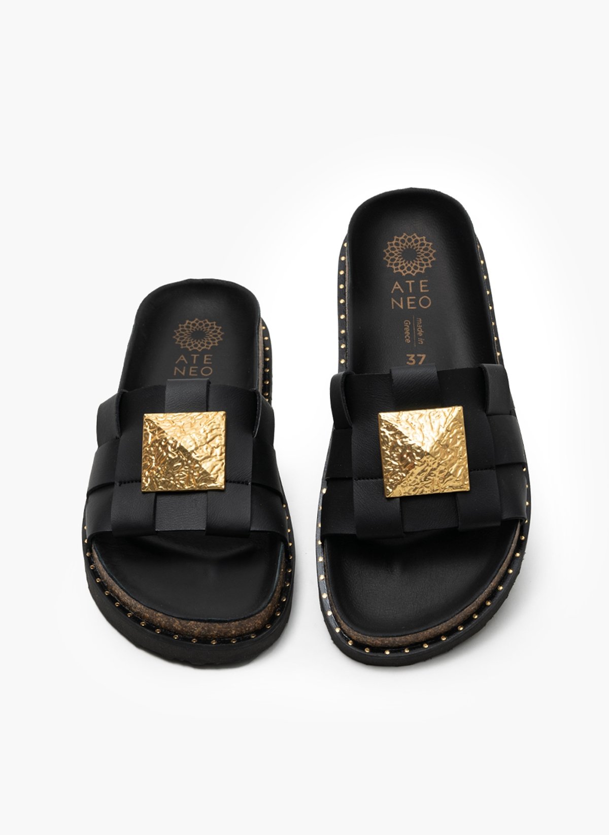 Σανδάλια δερμάτινα με περαστά λουράκια ATENEO. Μεγάλο μεταλλικό ανάγλυφο τρουκ στη φάσα. Ανατομικό σχήμα στον πάτο. Φελλός περιμετρικά της σόλας. Ελληνικής κατασκευής.