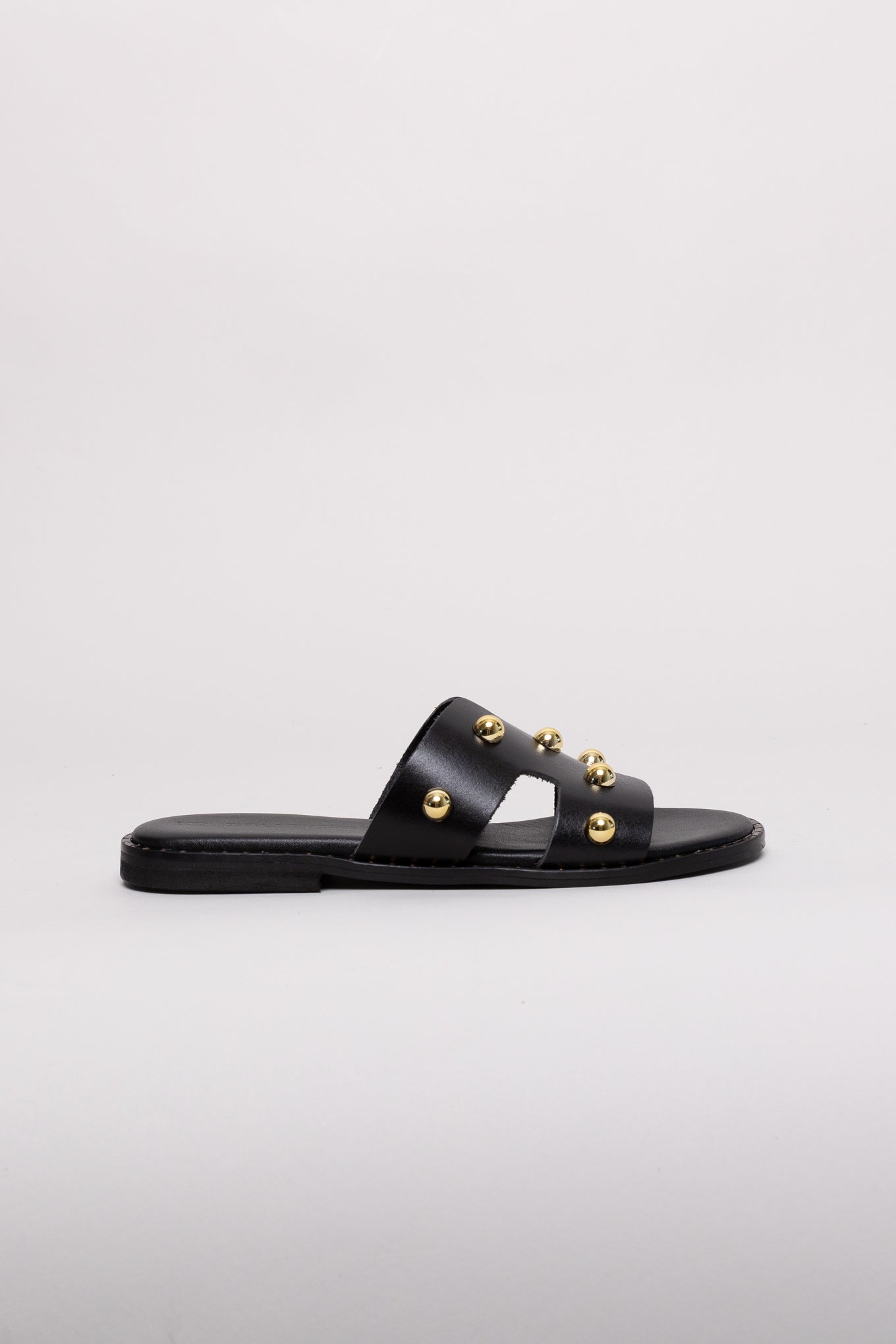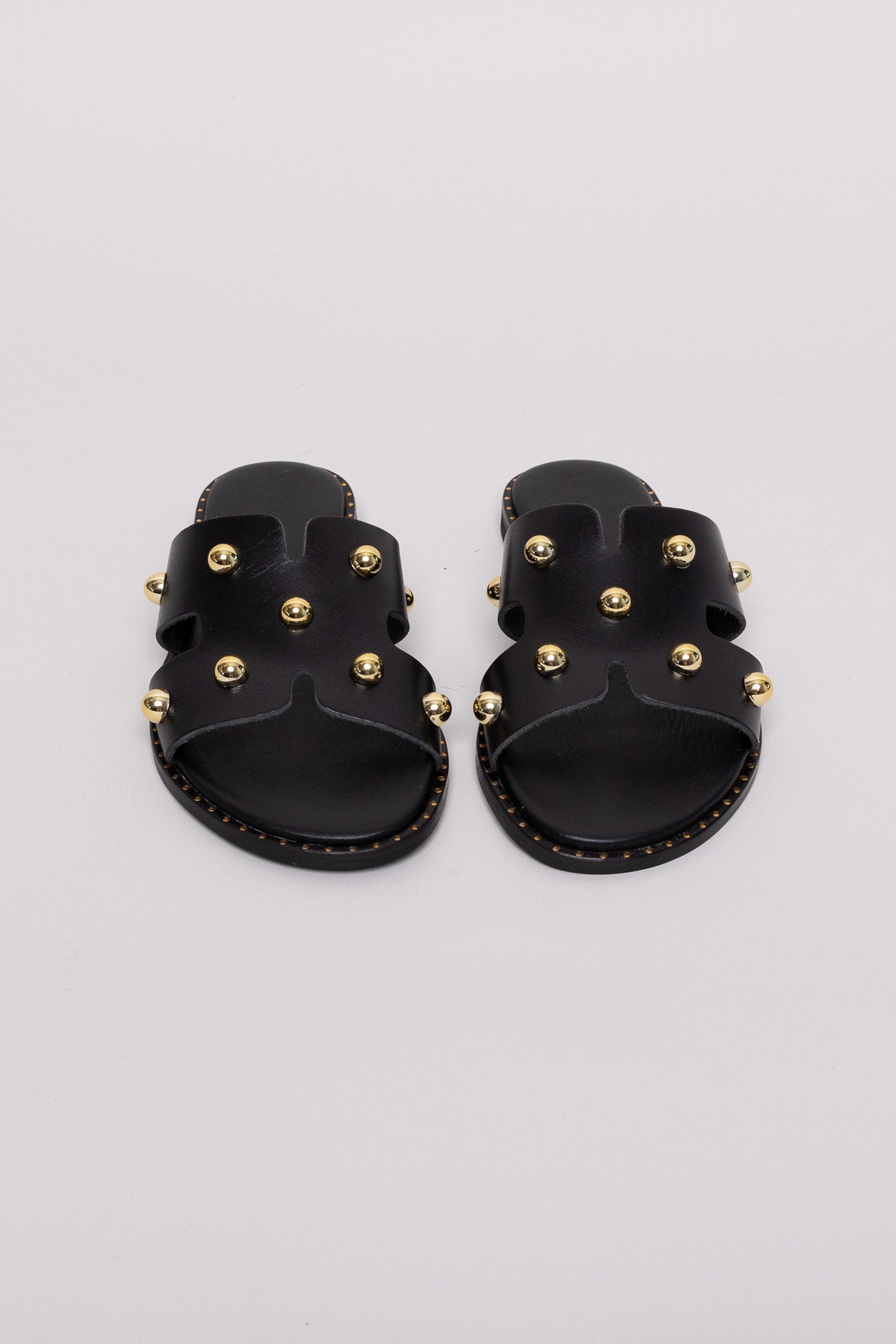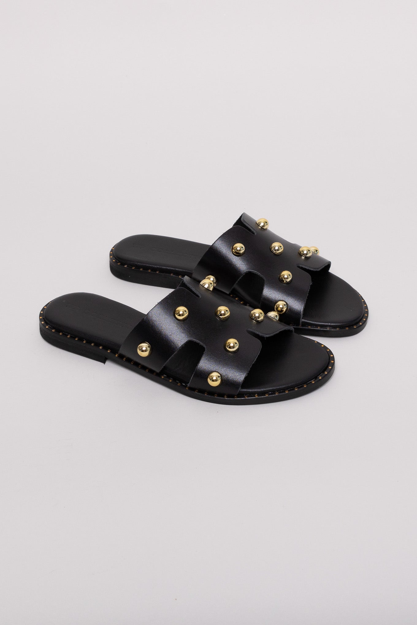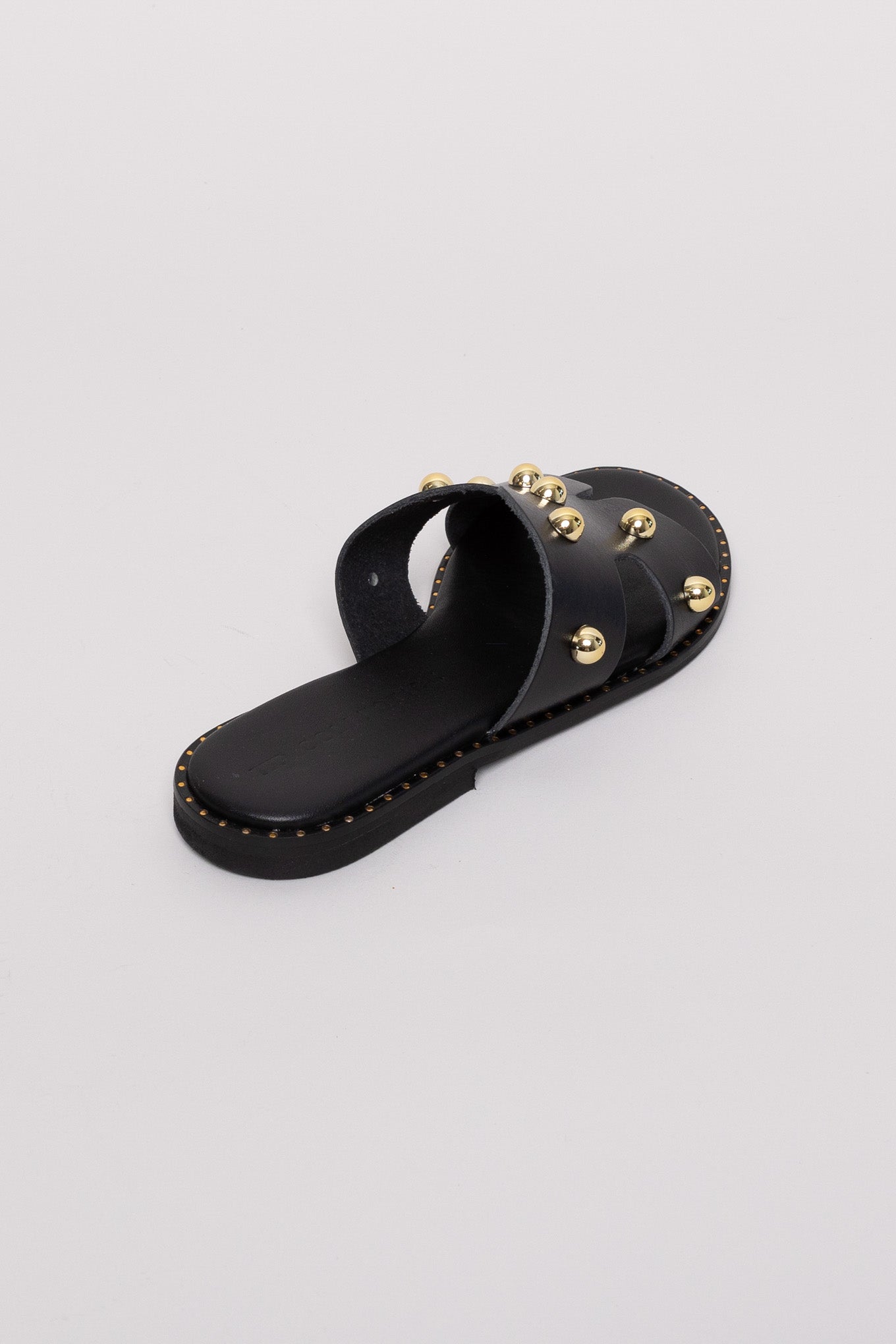 Σανδάλια από γνήσιο δέρμα Tfp. Φαρδιά φάσα με μεταλλικά τρουκς. Comfort μαλακός πάτος με ενίσχυση. Λεπτομέρεια dots σε μεταλλικό χρώμα περιμετρικά της σόλας. Ελληνικής κατασκευής.
