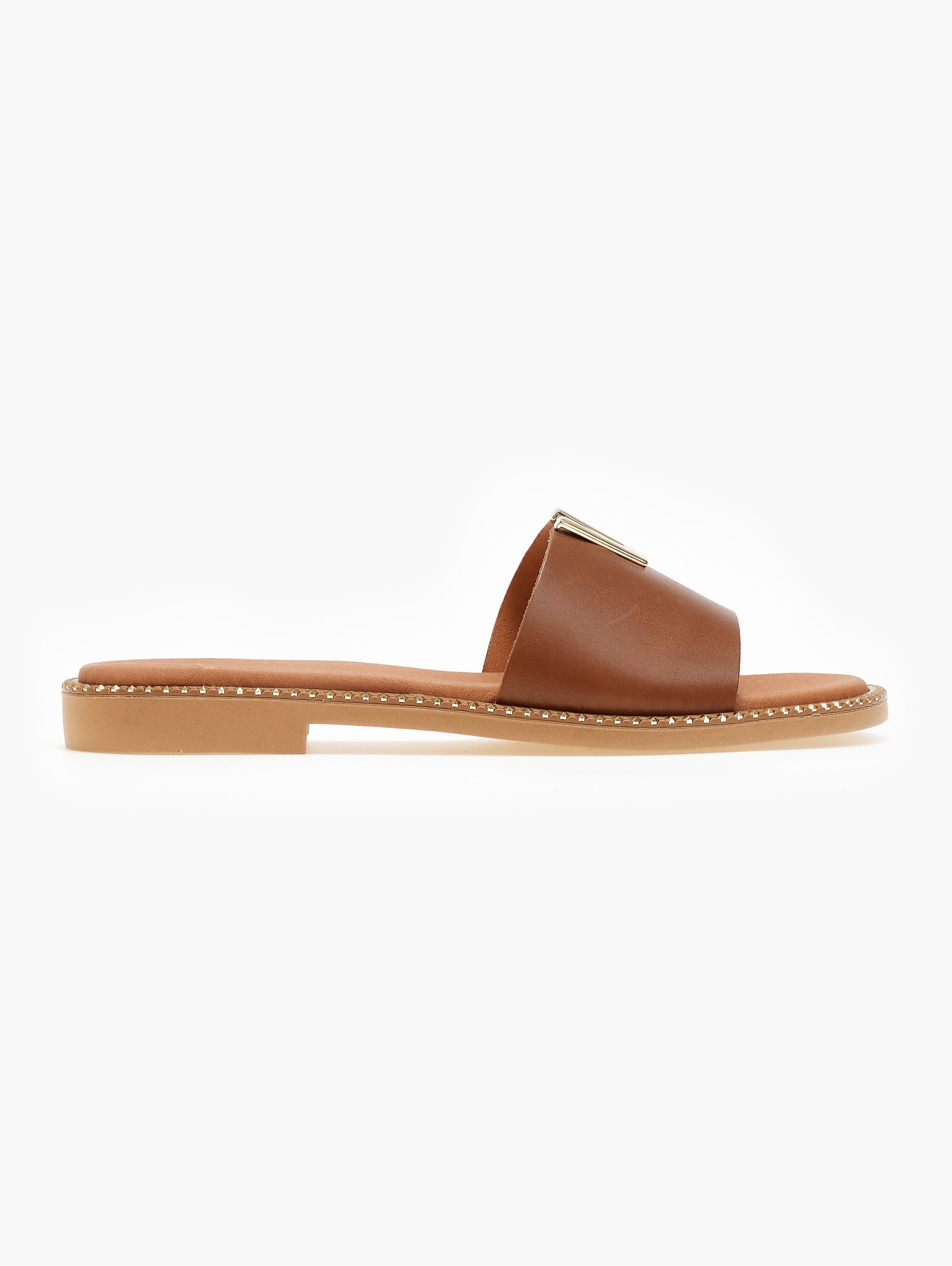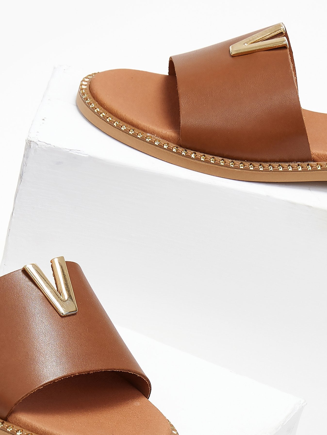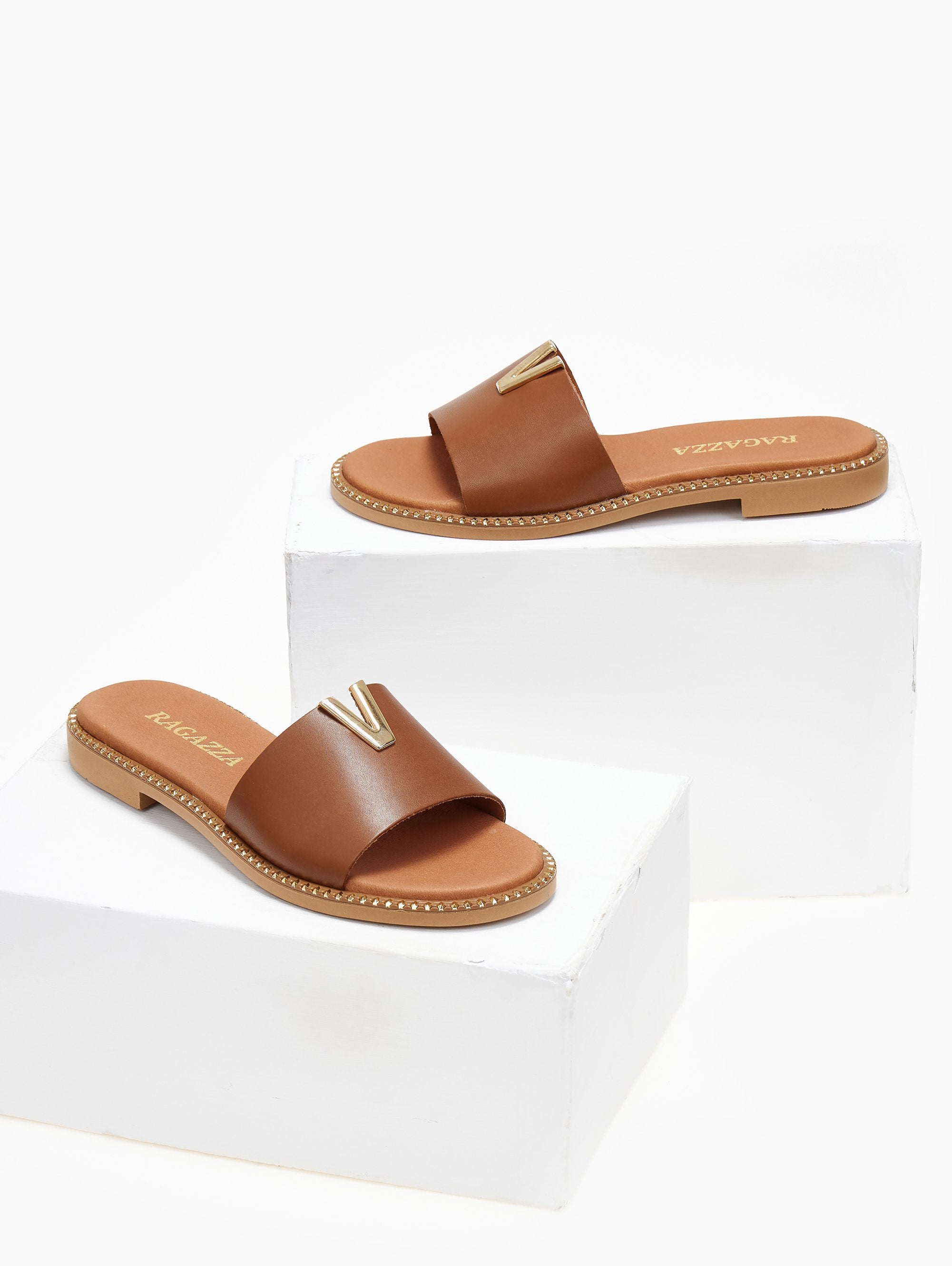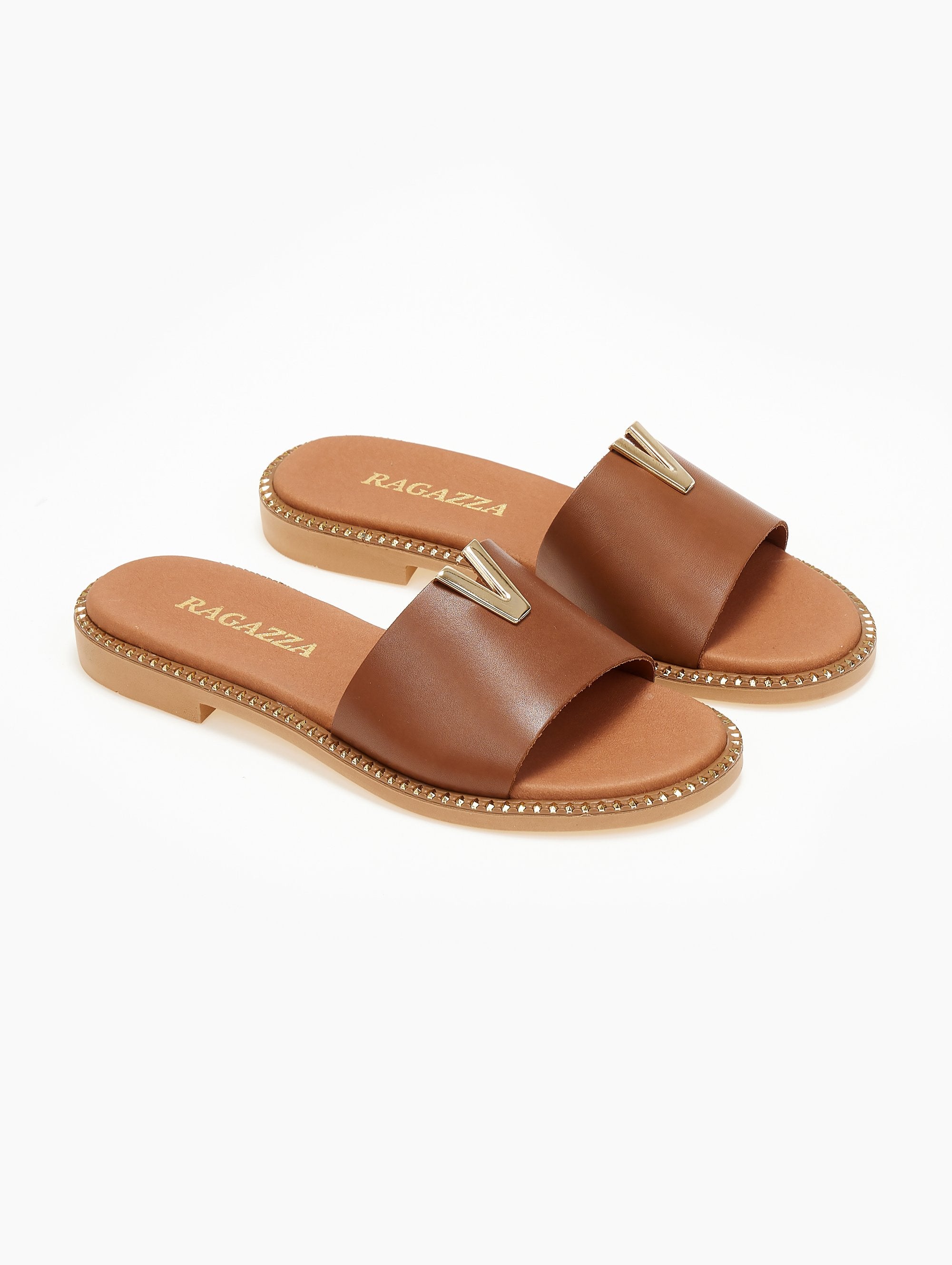 Leather sandals Ragazza with a wide V cut strap, metallic accent and subtle studded sole trim. Dryflex delivers breathability, shock absorption and odor control.