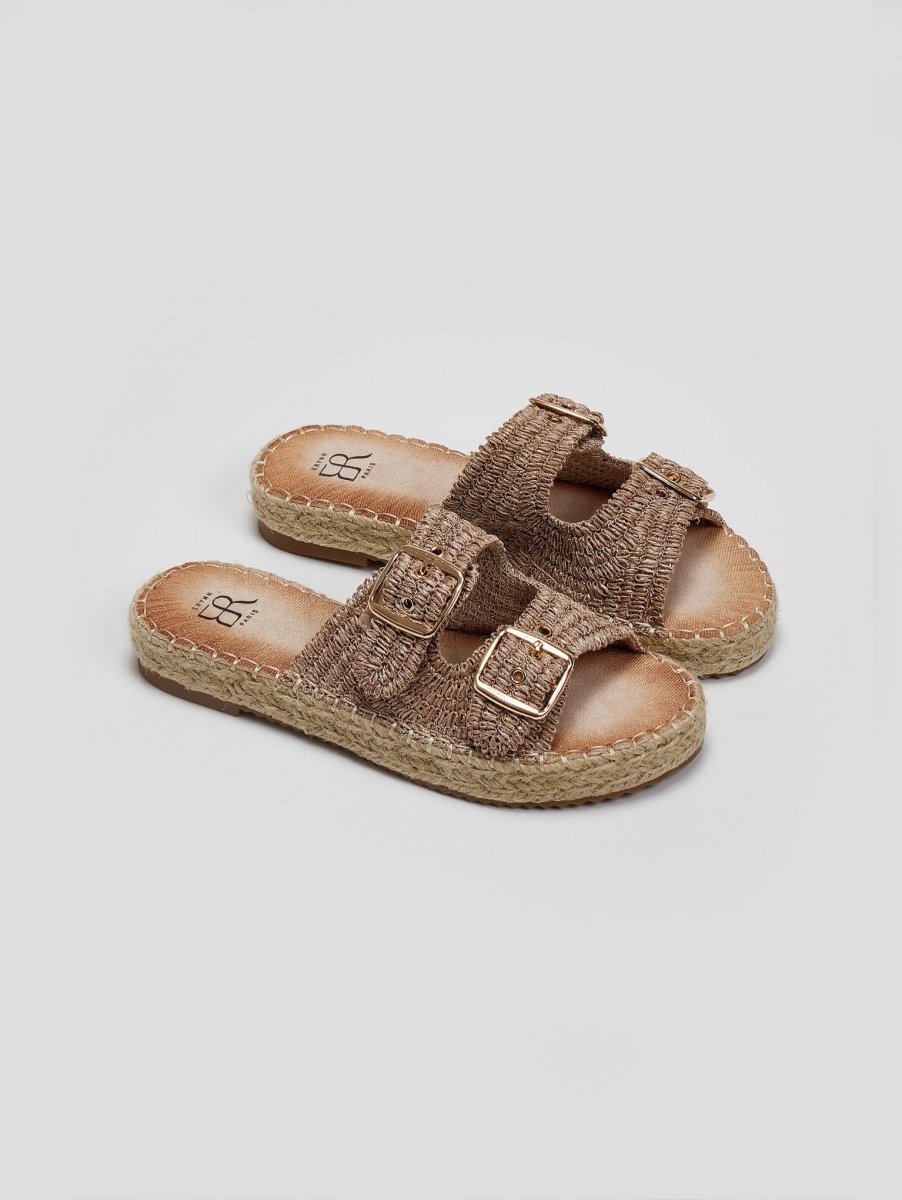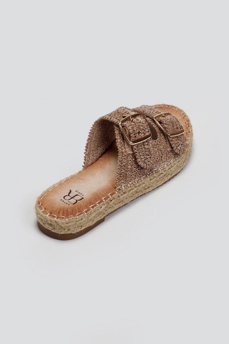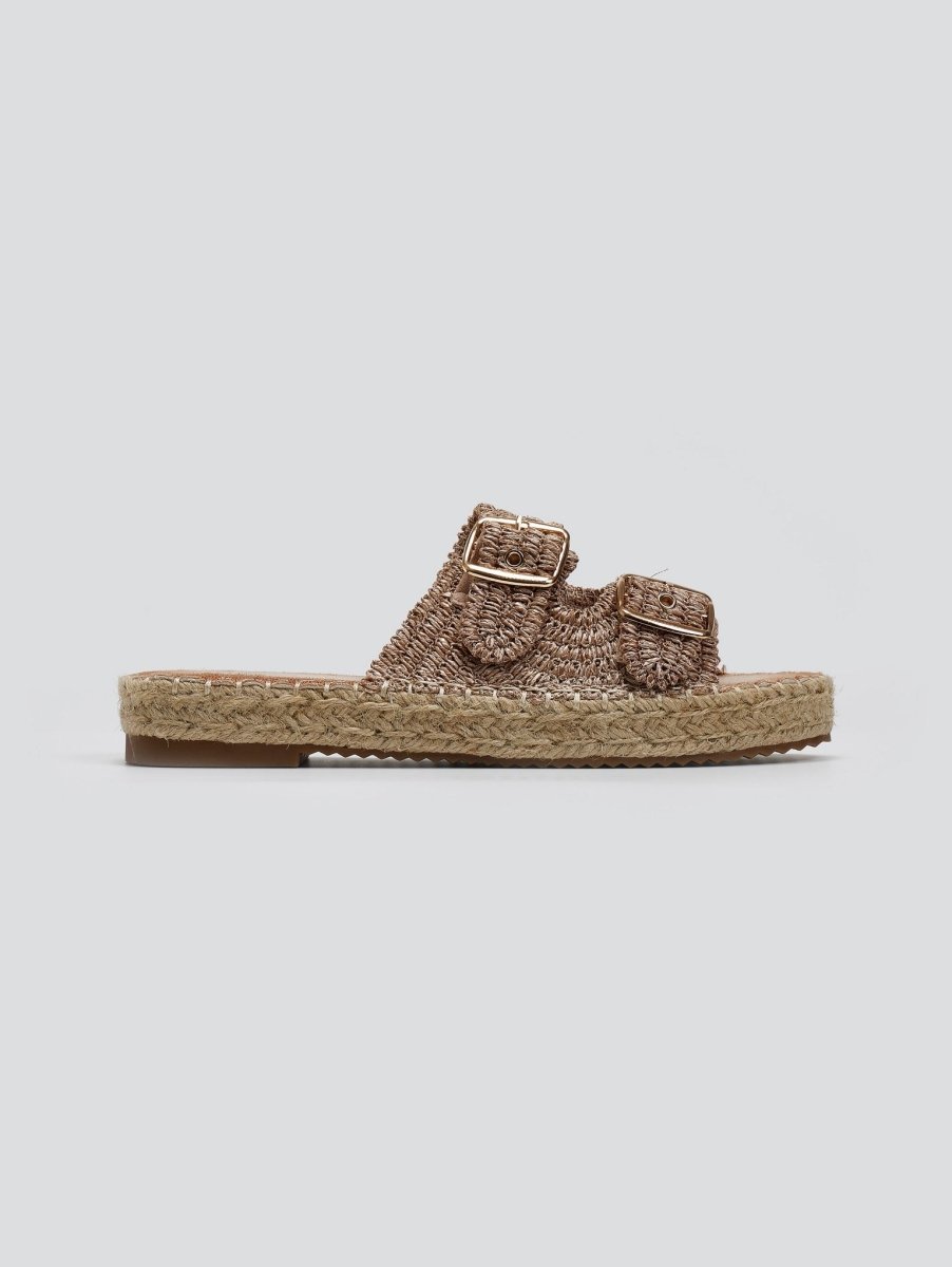 Σανδάλια flatforms από ψάθα με μεταλλικούς τοκάδες. Μαλακός πάτος. Σόλα ντυμένη με σχοινί.