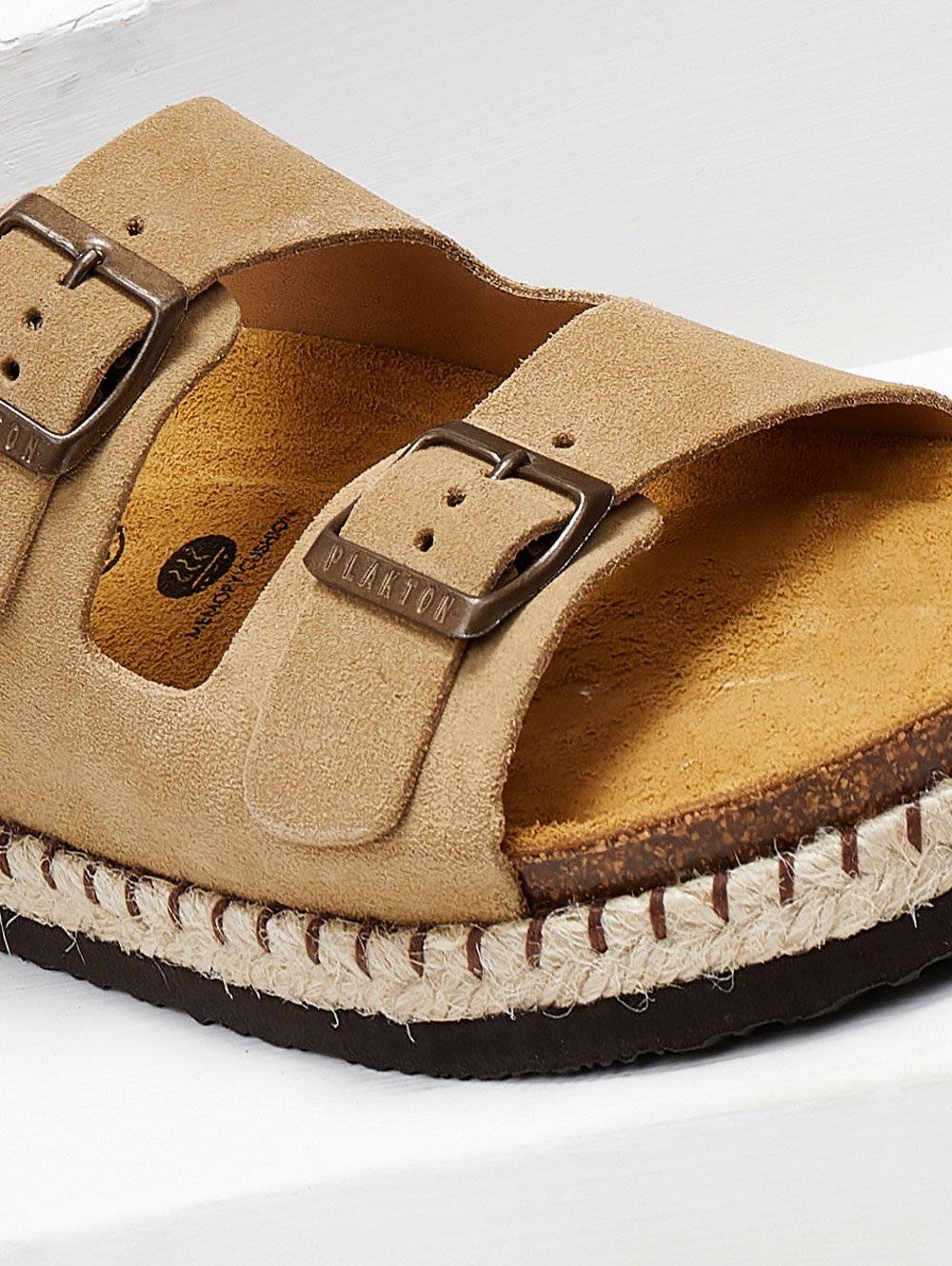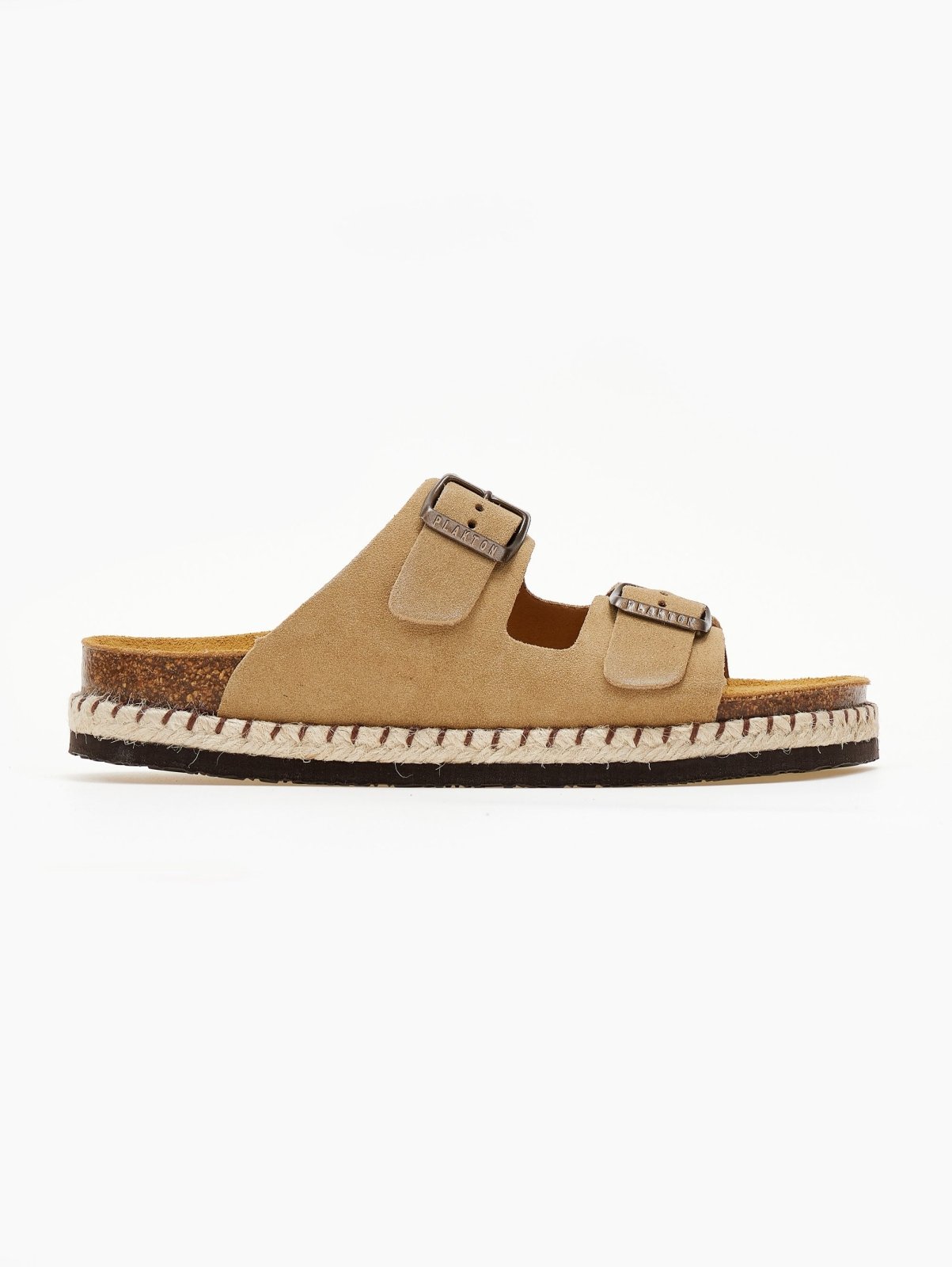 Σανδάλια από δέρμα καστόρι Plakton. Έχουν δύο φάσες με μεταλλικούς τοκάδες. Καστόρινος πάτος με Memory Cushion Technology και φυσικό φελλό. Λεπτομέρεια σχοινί στη σόλα. Made in Spain.