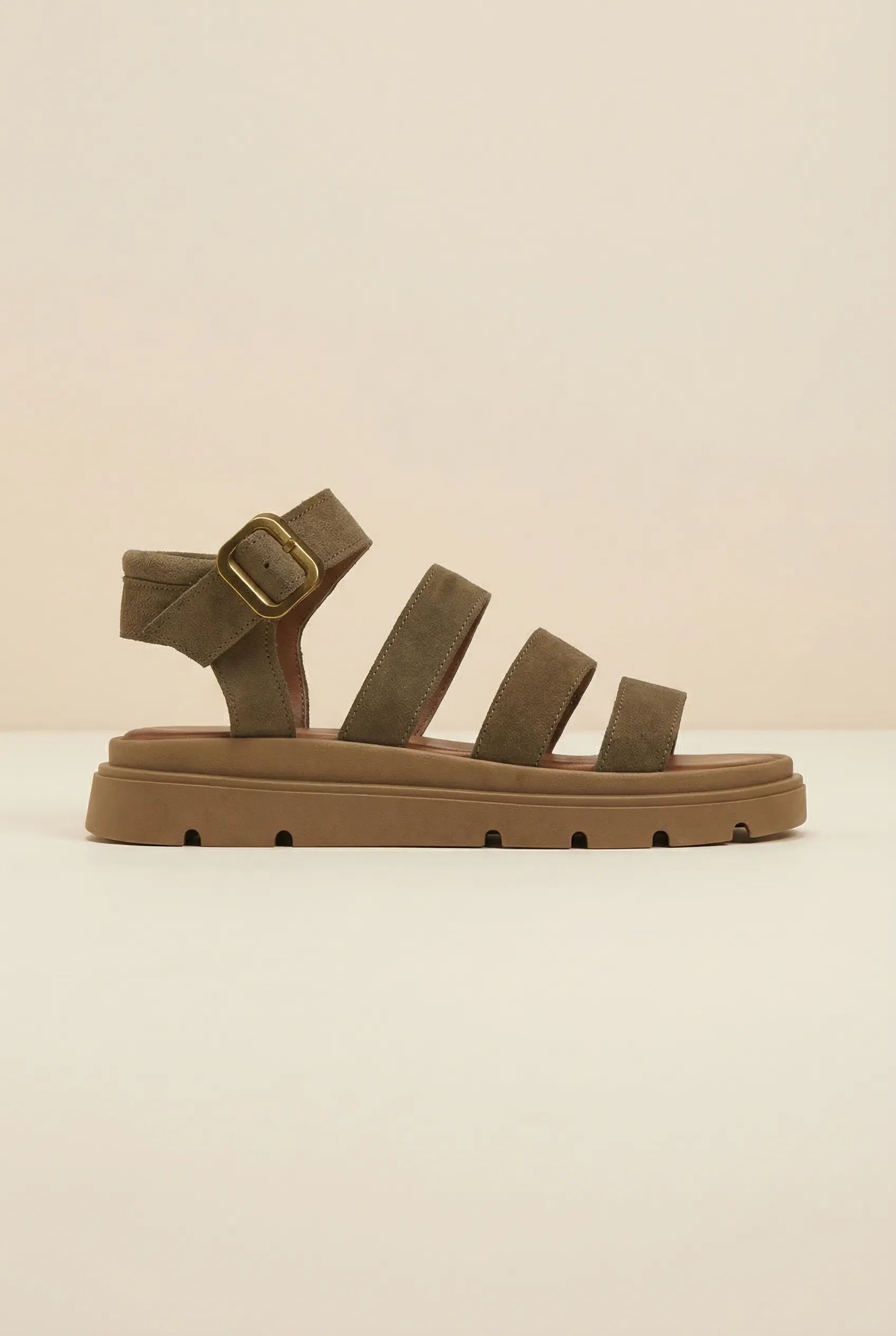 Sandals made of genuine suede leather with TFP bands. Fasten with an ankle strap. Soft padded insole. Made in Greece.