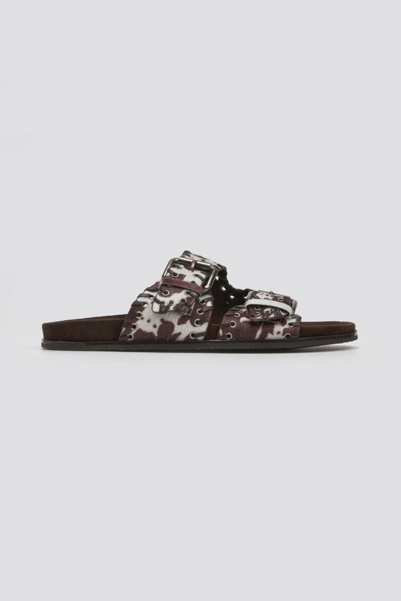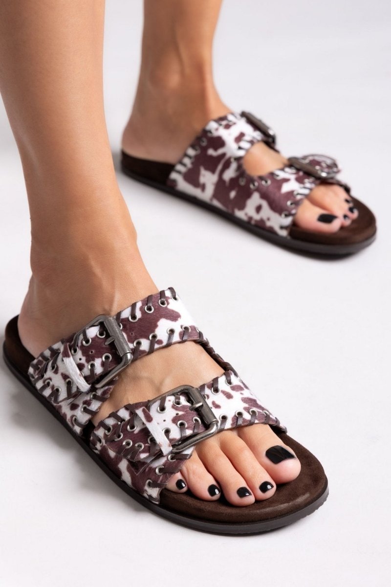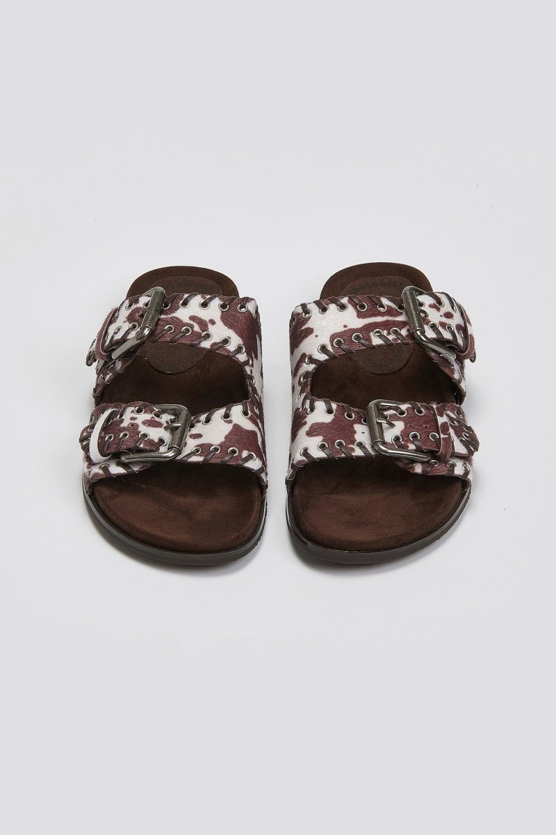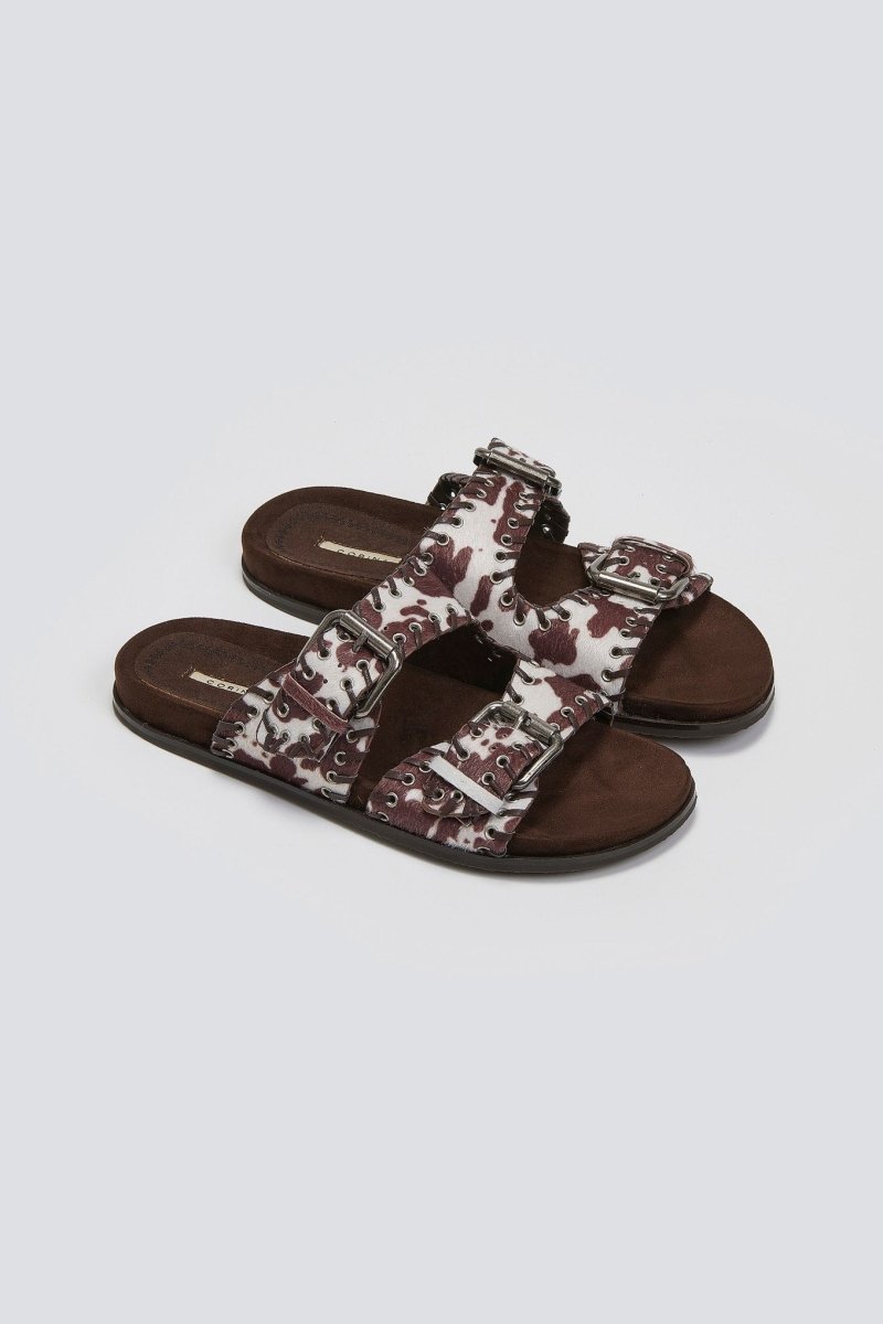 Σανδάλια από συνθετικό ponyskin με animal print Corina. Suede πάτος. Φαρδιές φάσες με τοκάδες.