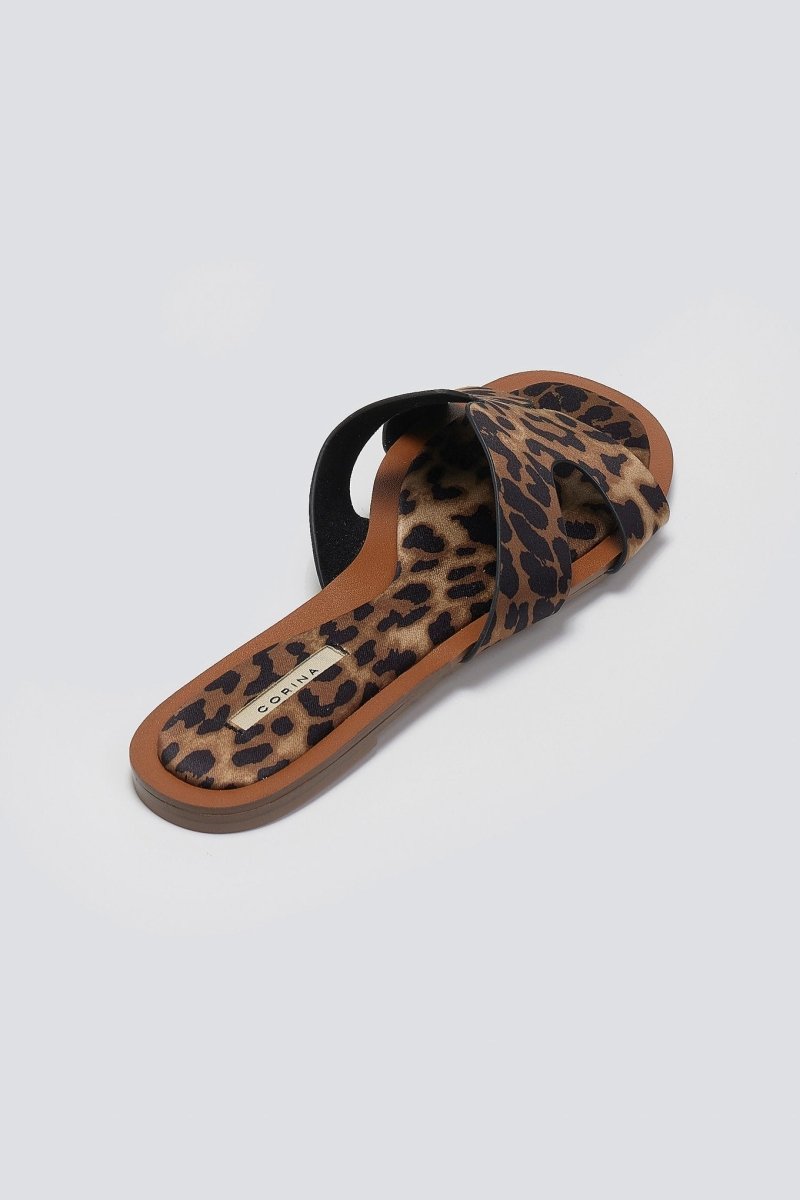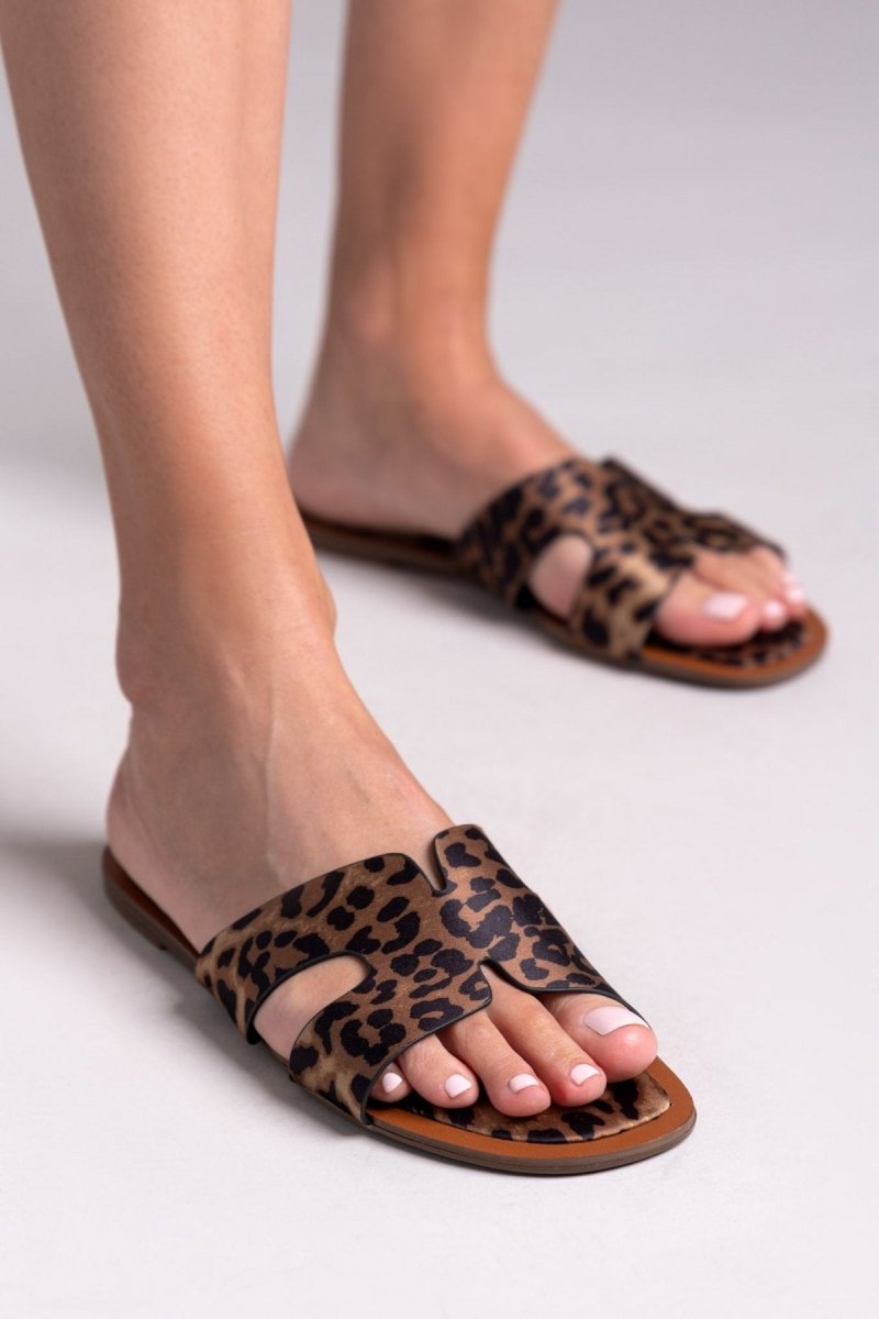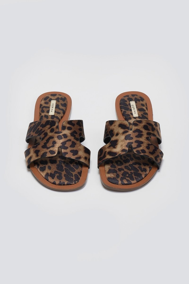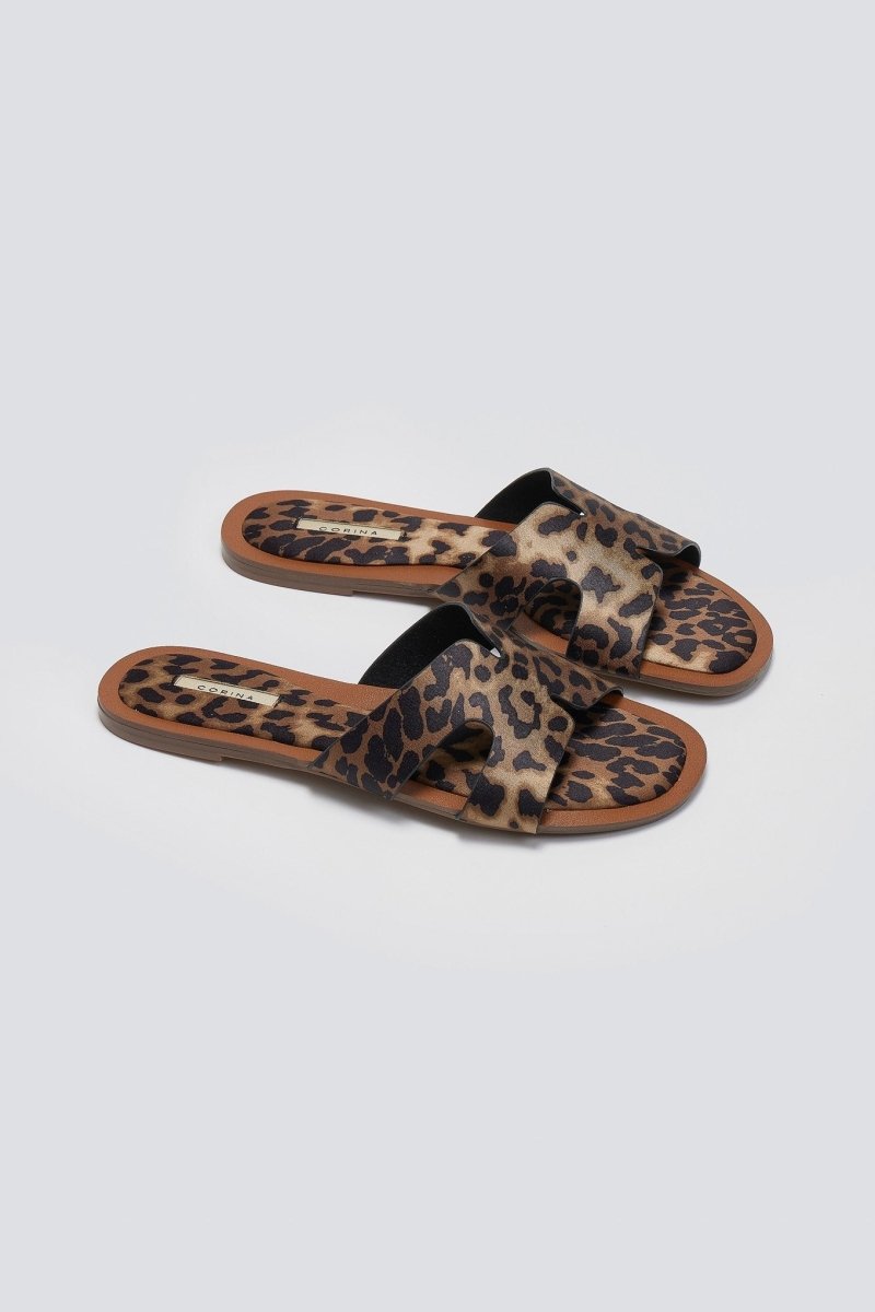Σανδάλια σατέν με print CORINA. Φαρδιά φάσα με ανοίγματα στο πλάι.