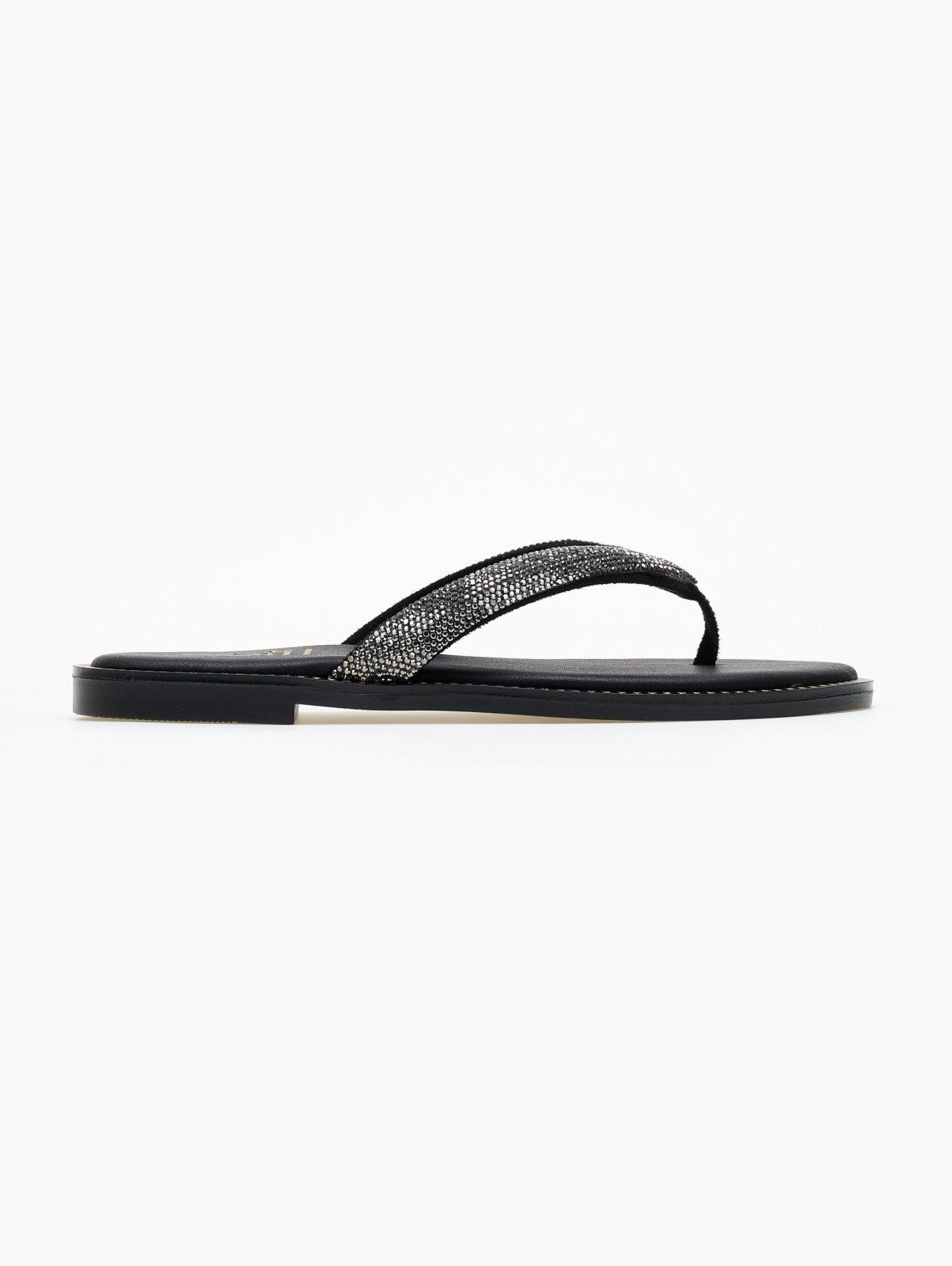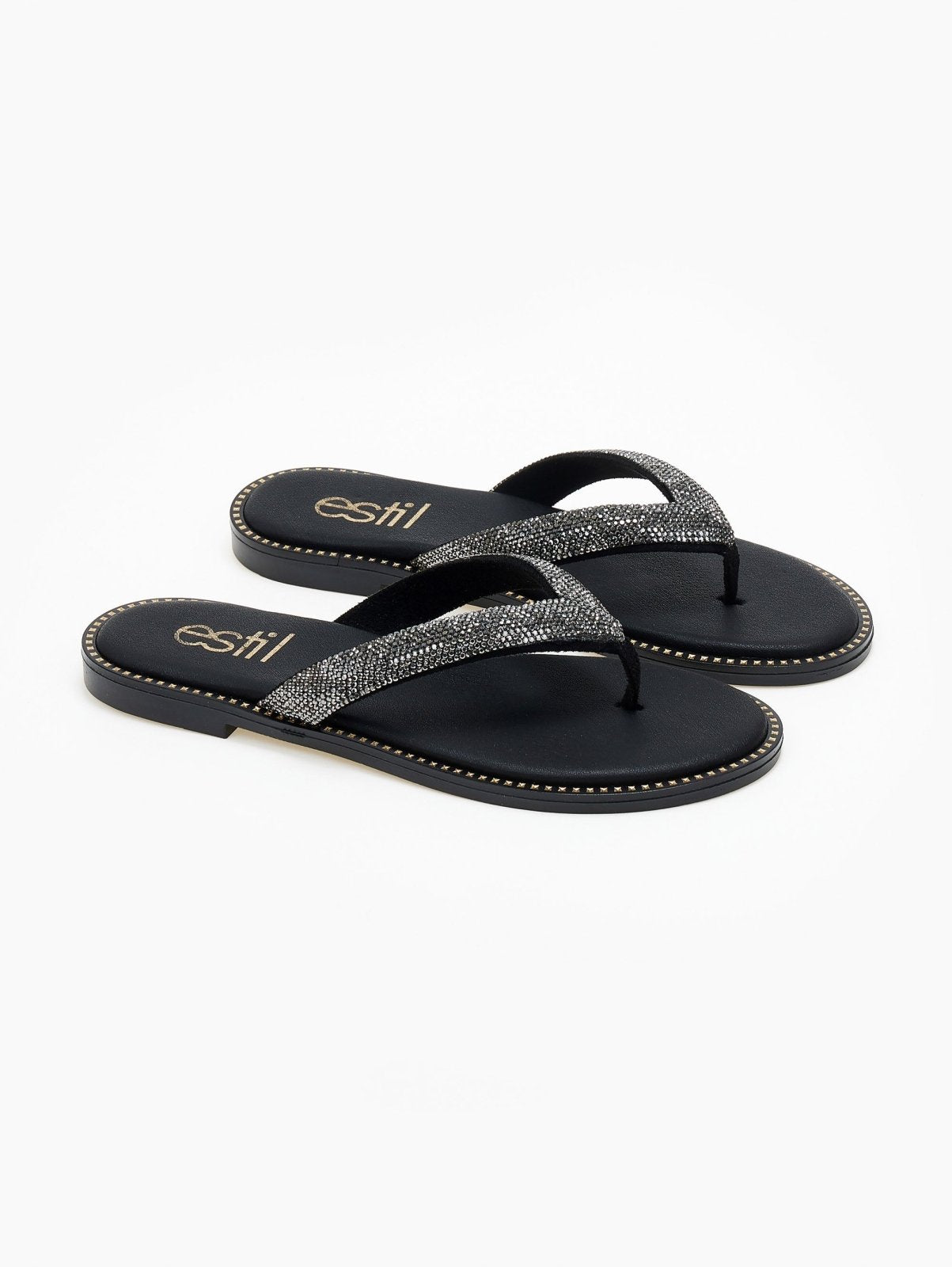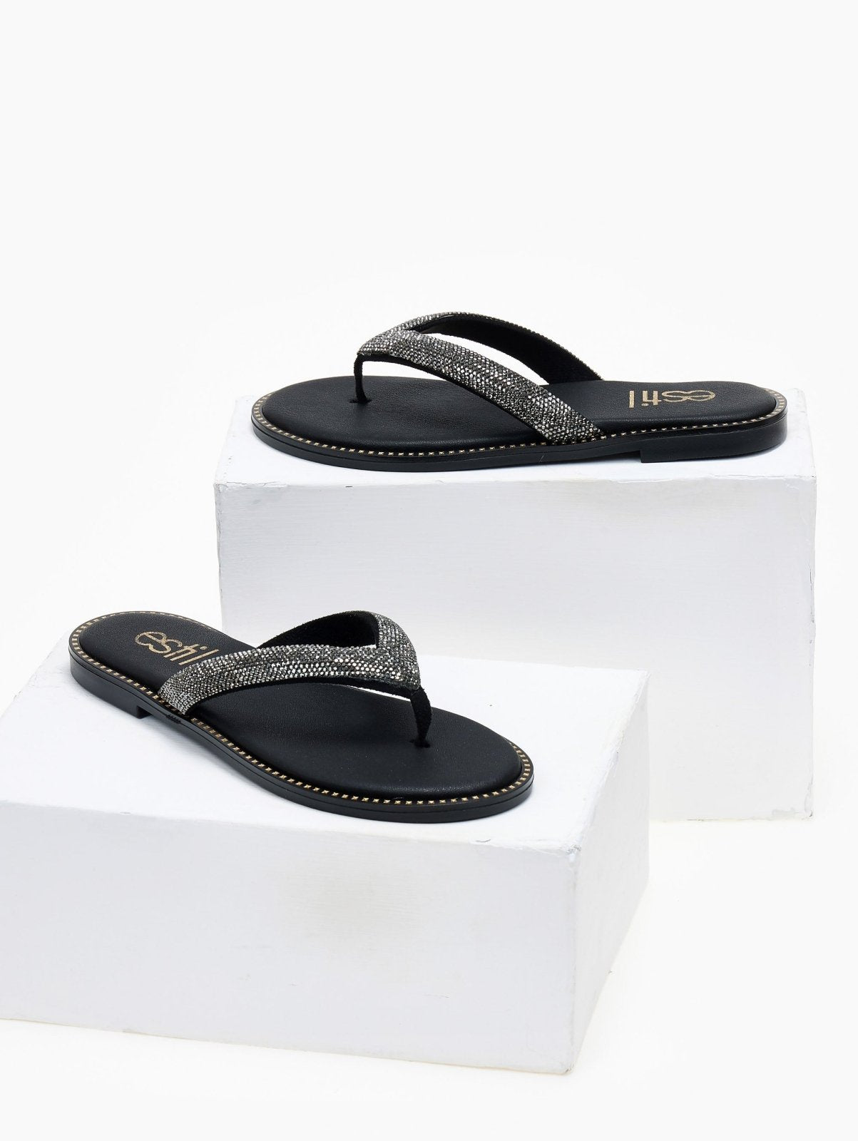 Σανδάλια με στρας Estil. Λεπτομέρεια μεταλλικό χρώμα περιμετρικά της σόλας. Μαλακός πάτος με ενίσχυση. Ελληνικής κατασκευής.