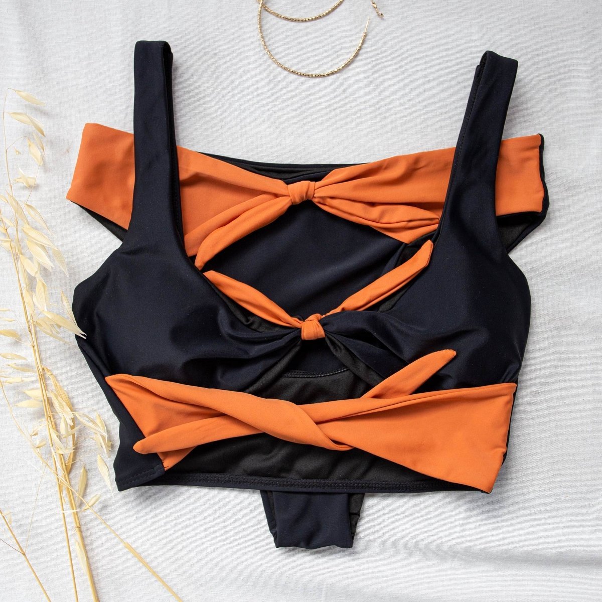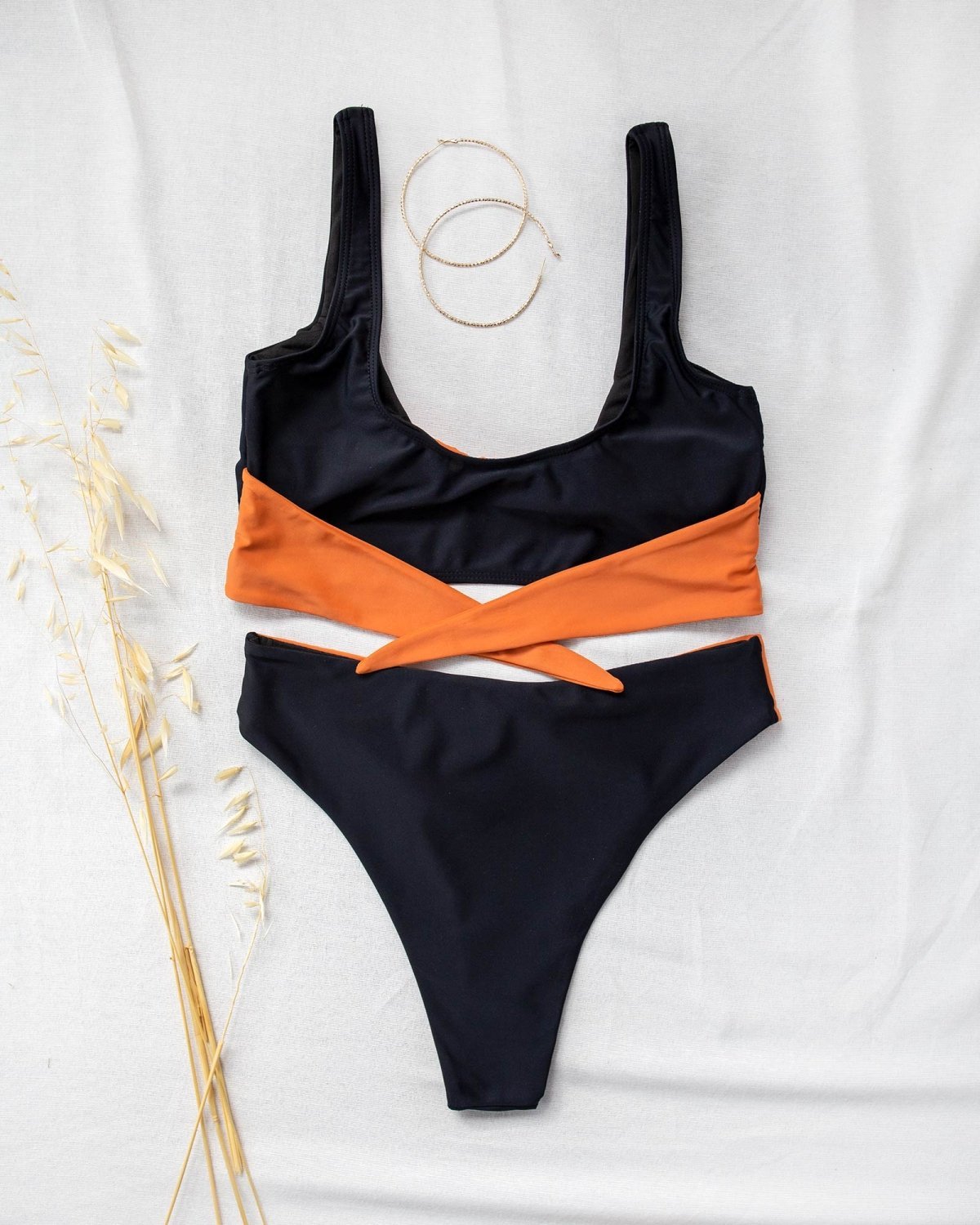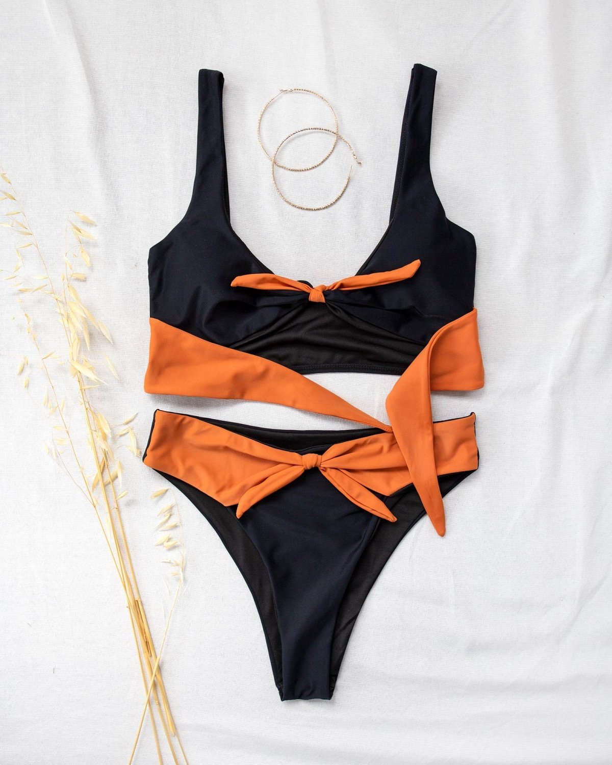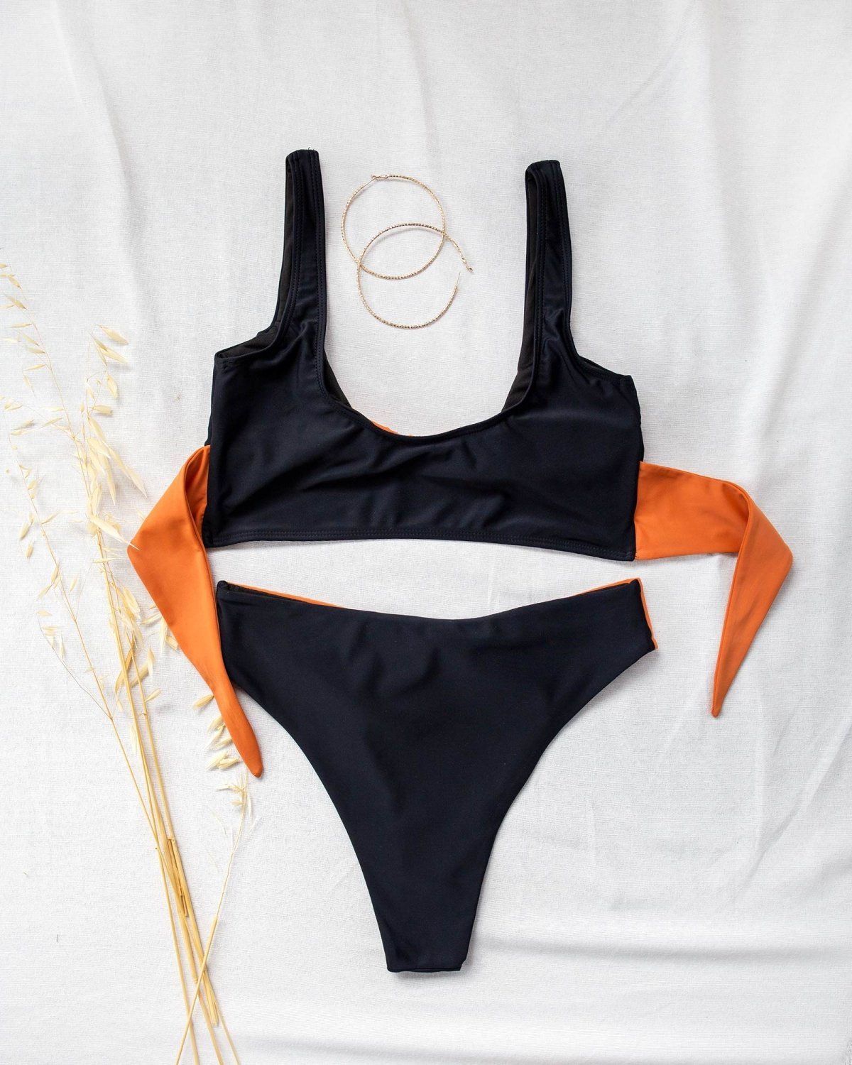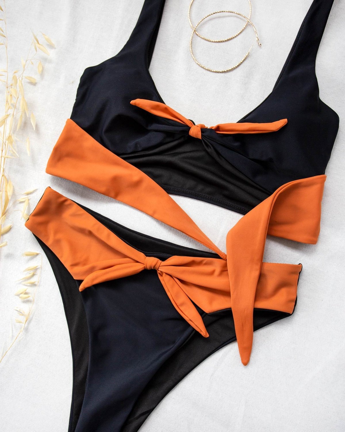 Σετ bikini με διχρωμία. Το top έχει bandeau γραμμή και διαθέτει αποσπώμενη ενίσχυση. Το slip είναι high leg ψηλόμεσο με διακοσμητικό δέσιμο. Μέτρια κάλυψη.