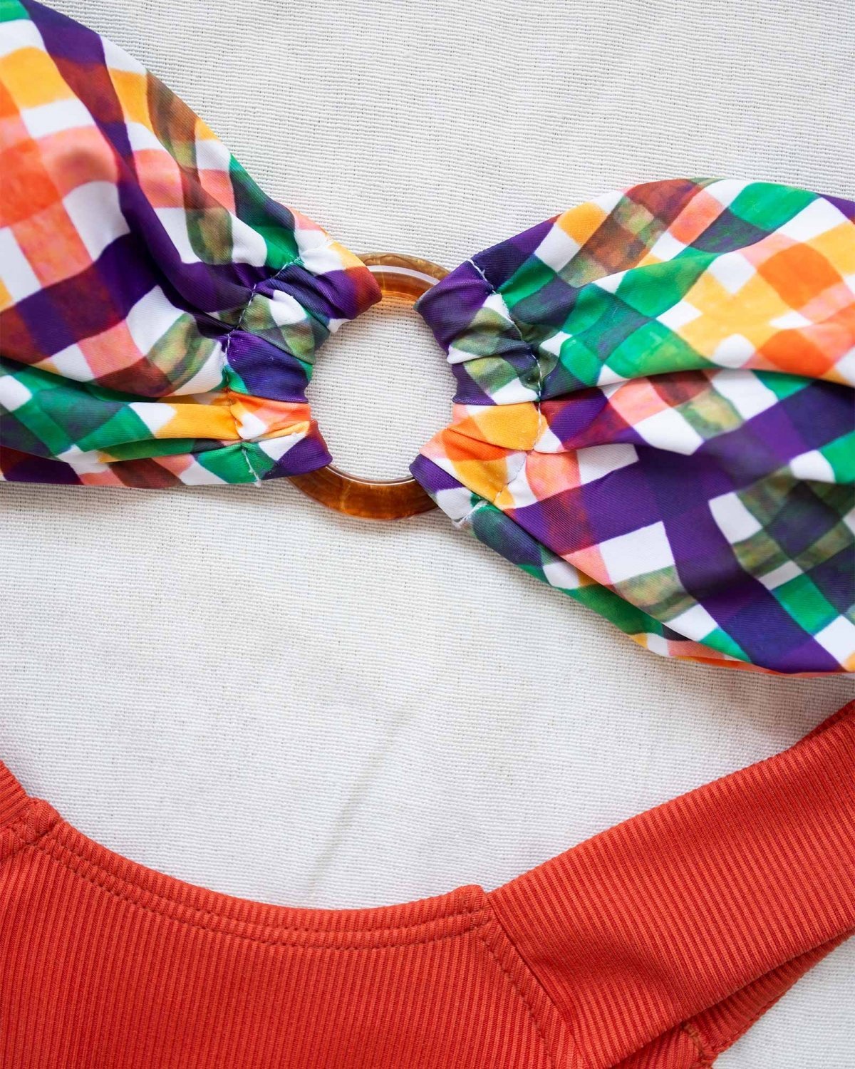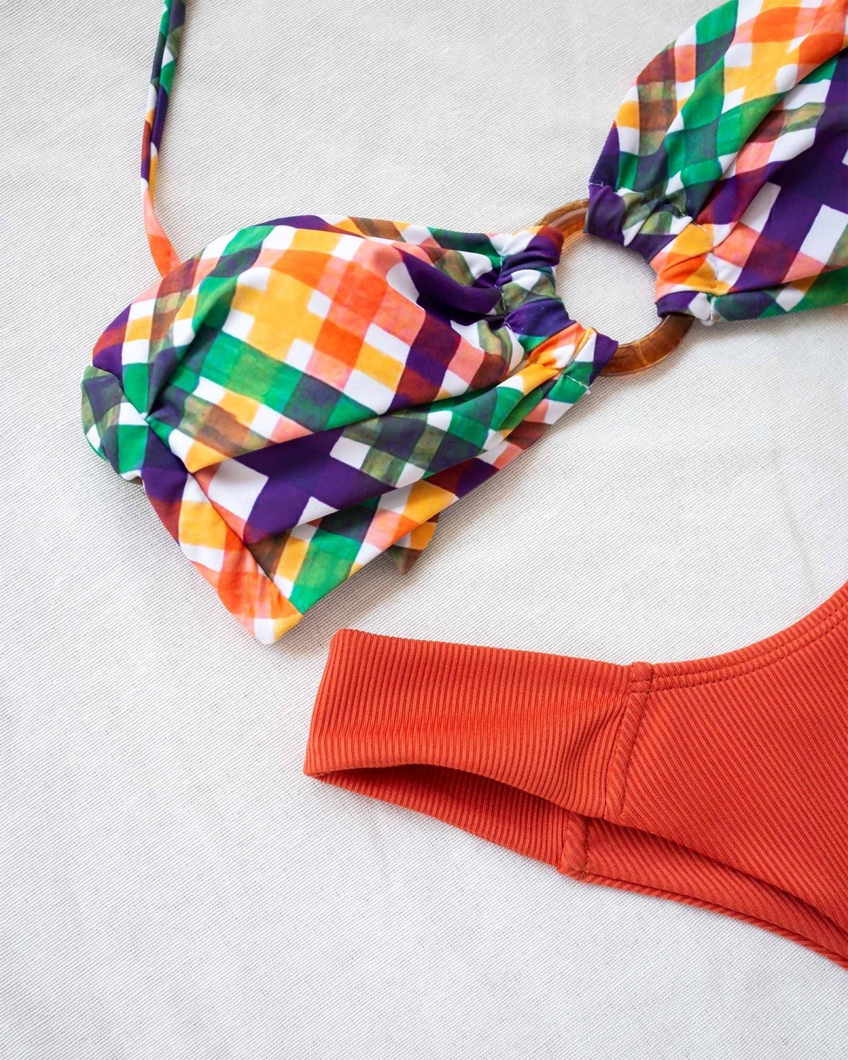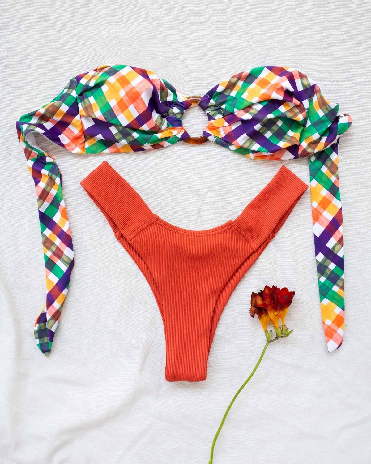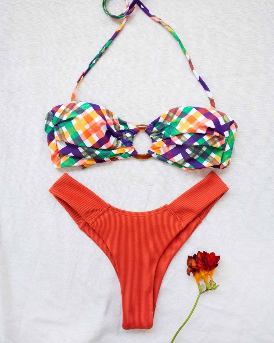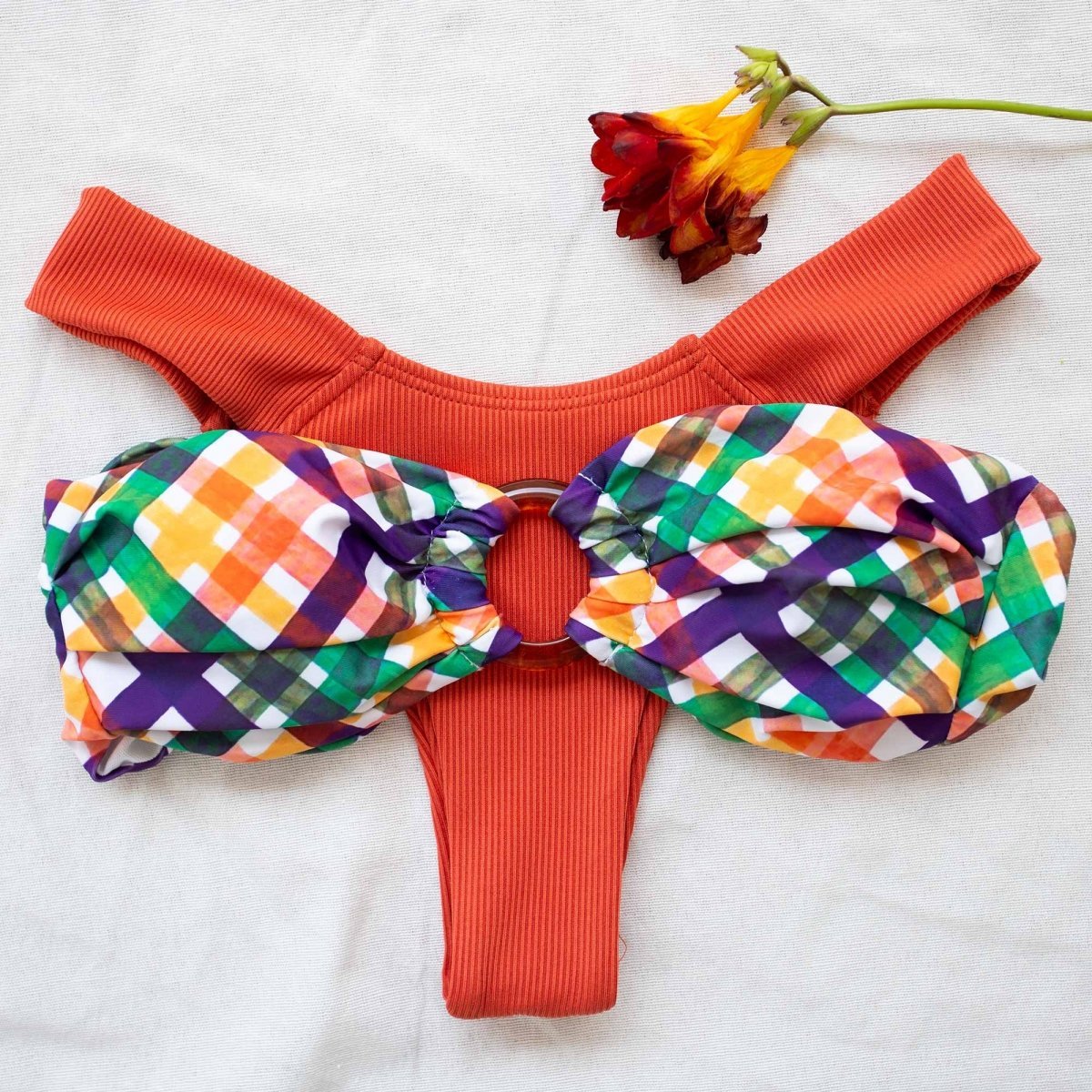 Σετ bikini.Το τοπ έχει σούρες και κοκάλινο κρίκο.Το slip είναι high leg ψηλόμεσο.Μικρή κάλυψη.