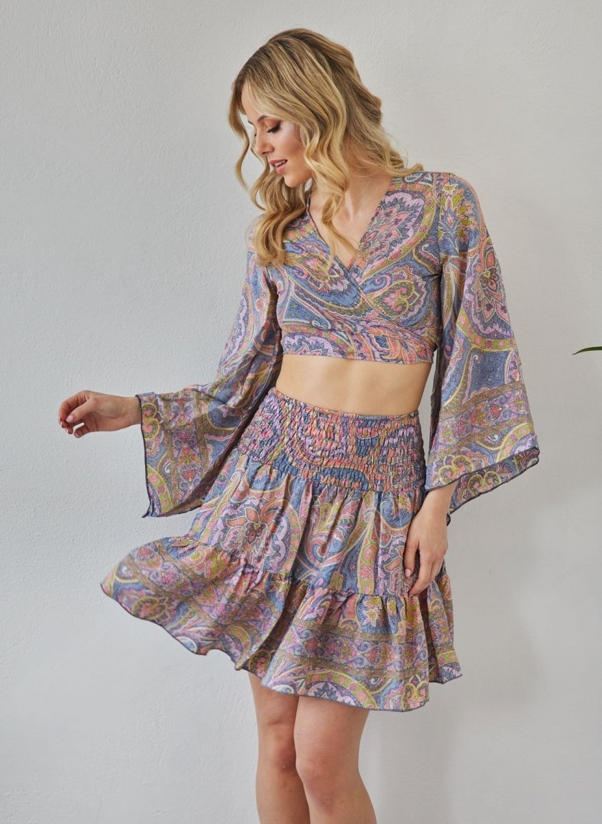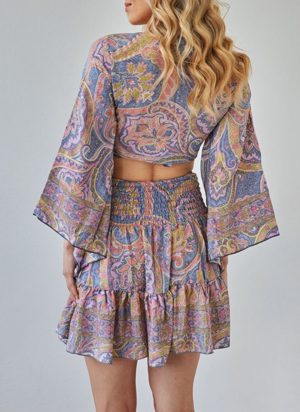 Σετ ρούχων με boho σχέδιο με λαχούρια. Το τοπ είναι δετό με φαρδιά μανίκια. Crop γραμμή. Η φούστα είναι μίνι με φαρδιά μπάσκα και βολάν. Limited edition. Made in India.