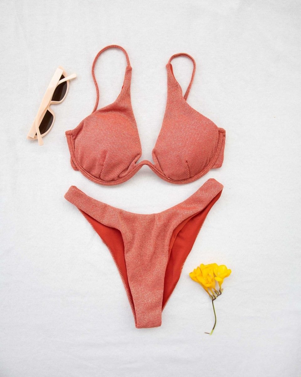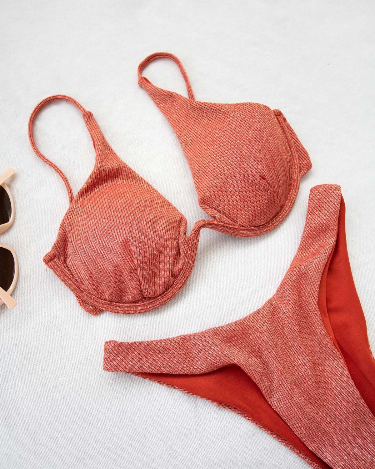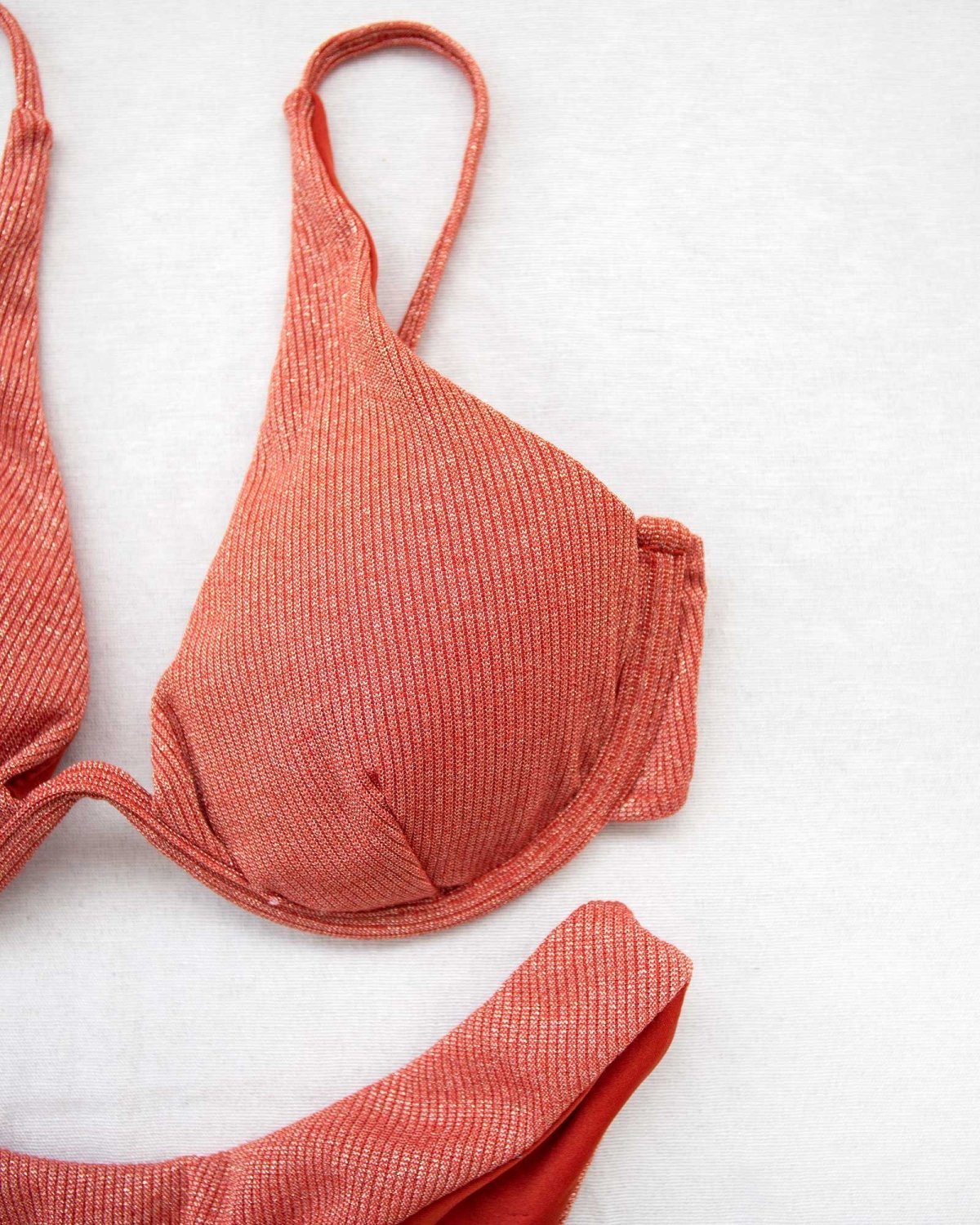 Σετ lurex bikini με μπανέλα. Το τοπ έχει μπανέλα και αποσπώμενη ενίσχυση. Το slip είναι high leg ψηλόμεσο με μικρή κάλυψη.