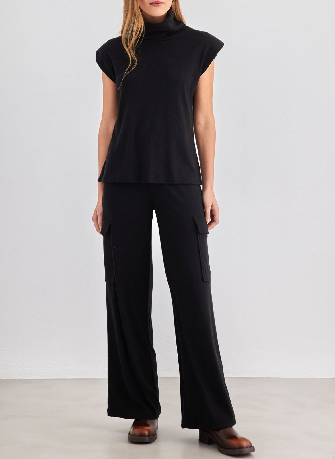 Σετ ρούχων Το παντελόνι είναι ψηλόμεσο cargo με εξωτερικές τσέπες στο πλάι. Η μπλούζα είναι αμάνικη με βάτες. Ζιβάγκο λαιμόκοψη. Made in Italy.