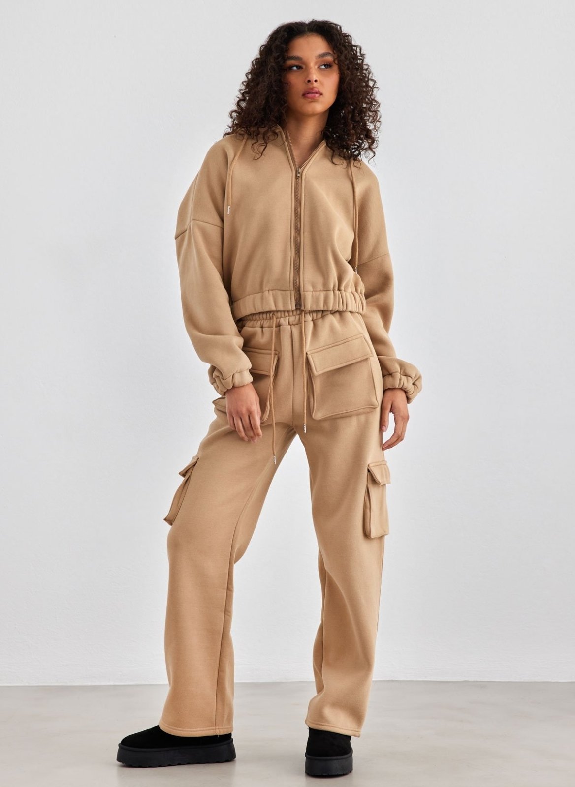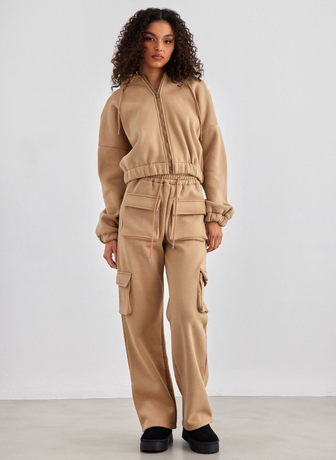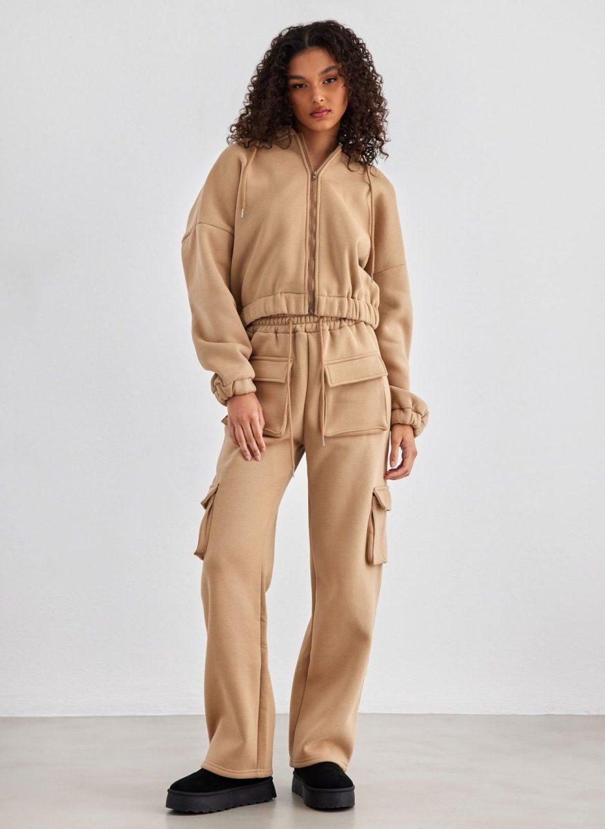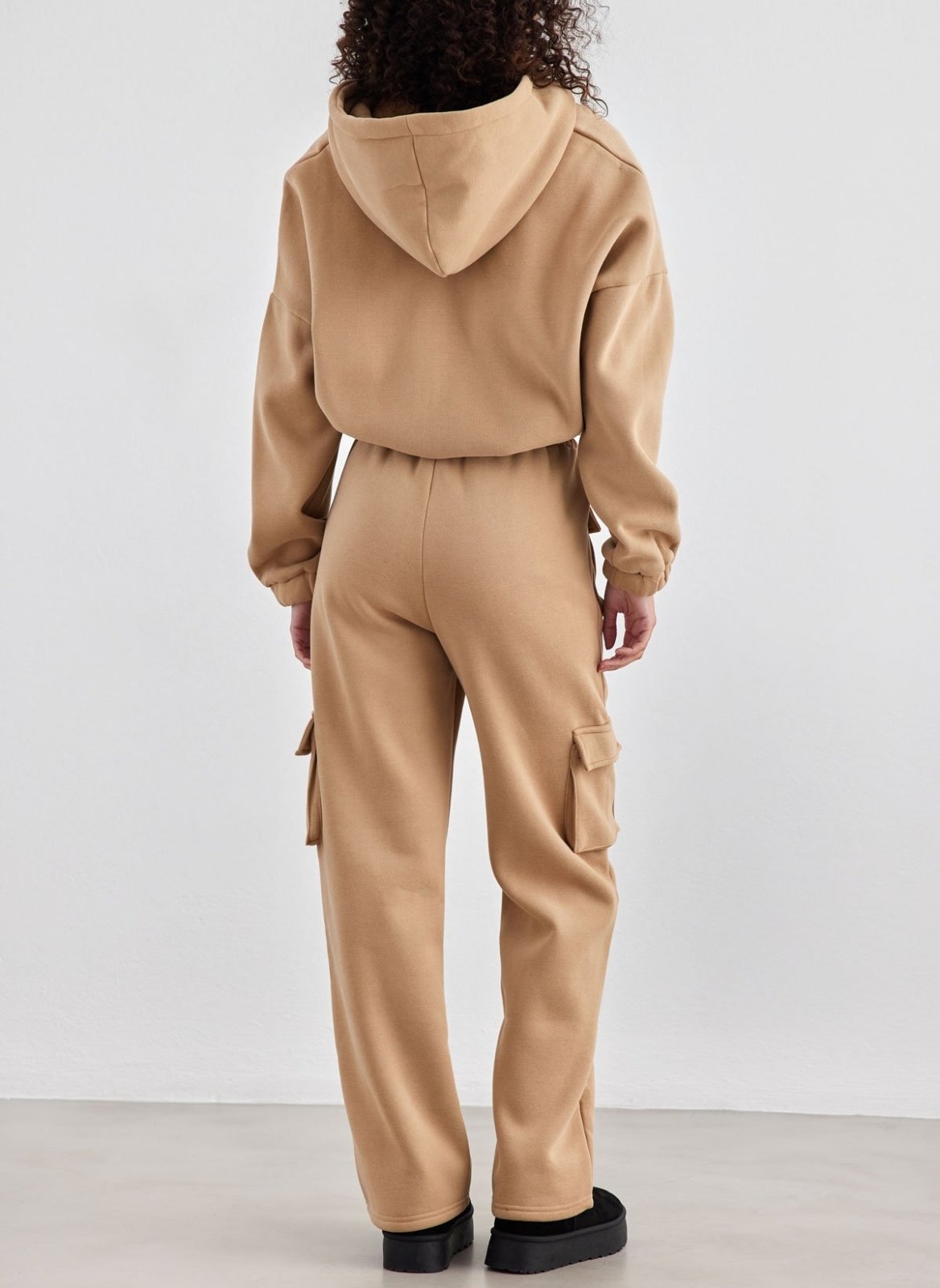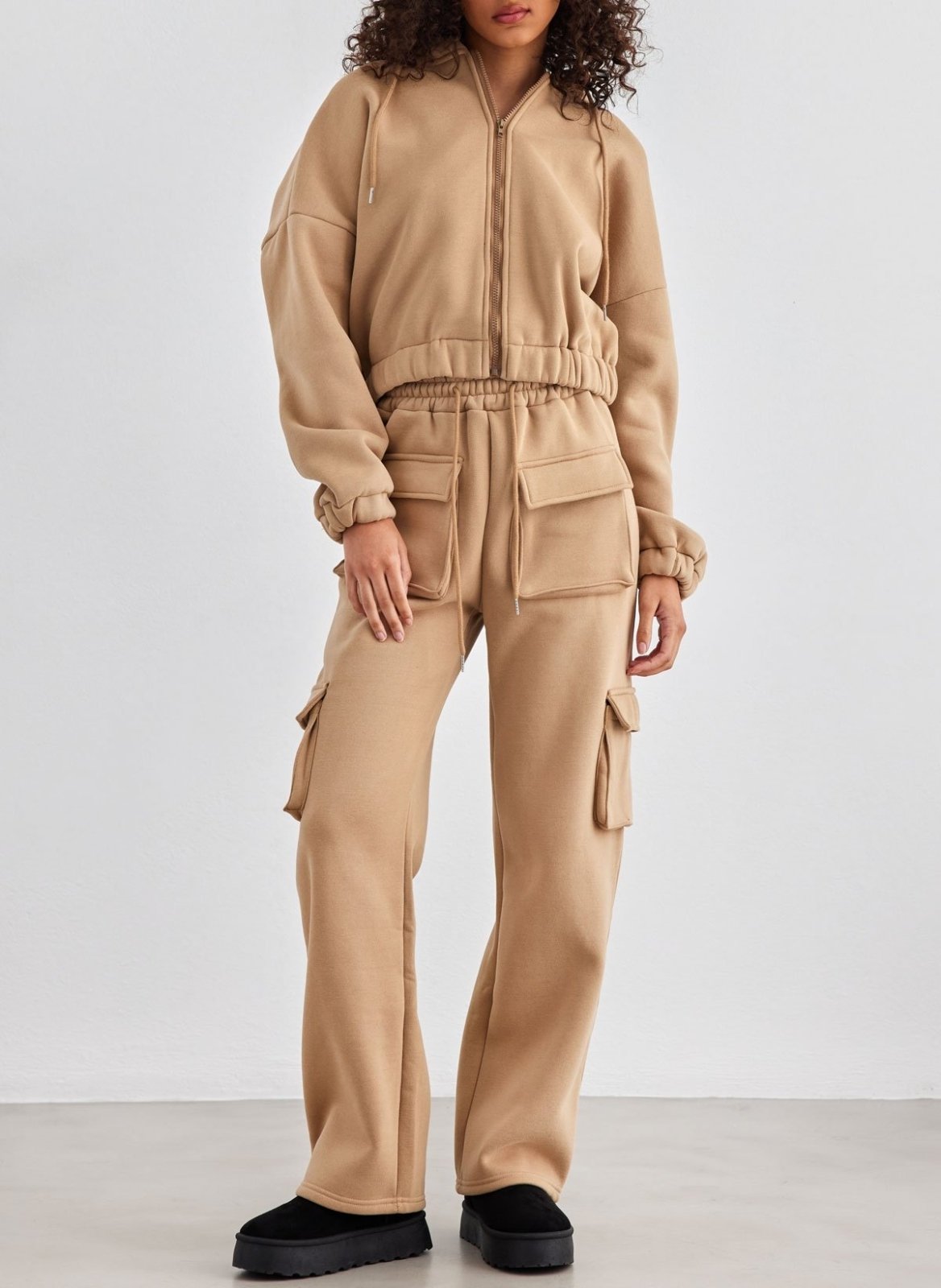 Σετ φόρμες. Το παντελόνι είναι cargo σε ίσια γραμμή. Έχει εξωτερικές τσέπες στη μπροστινή πλευρά και στο πλάι. Φαρδύ λάστιχο με κορδόνι στη μέση. Η ζακέτα έχει κουκούλα και άνετη γραμμή. Στενό τελείωμα με λάστιχο. Κλείνει με φερμουάρ.
