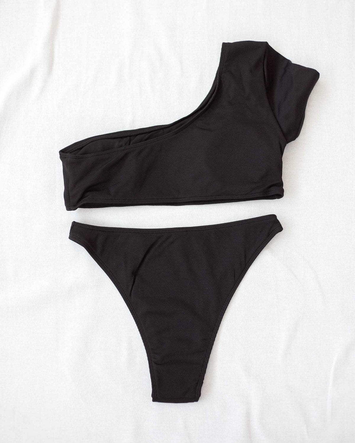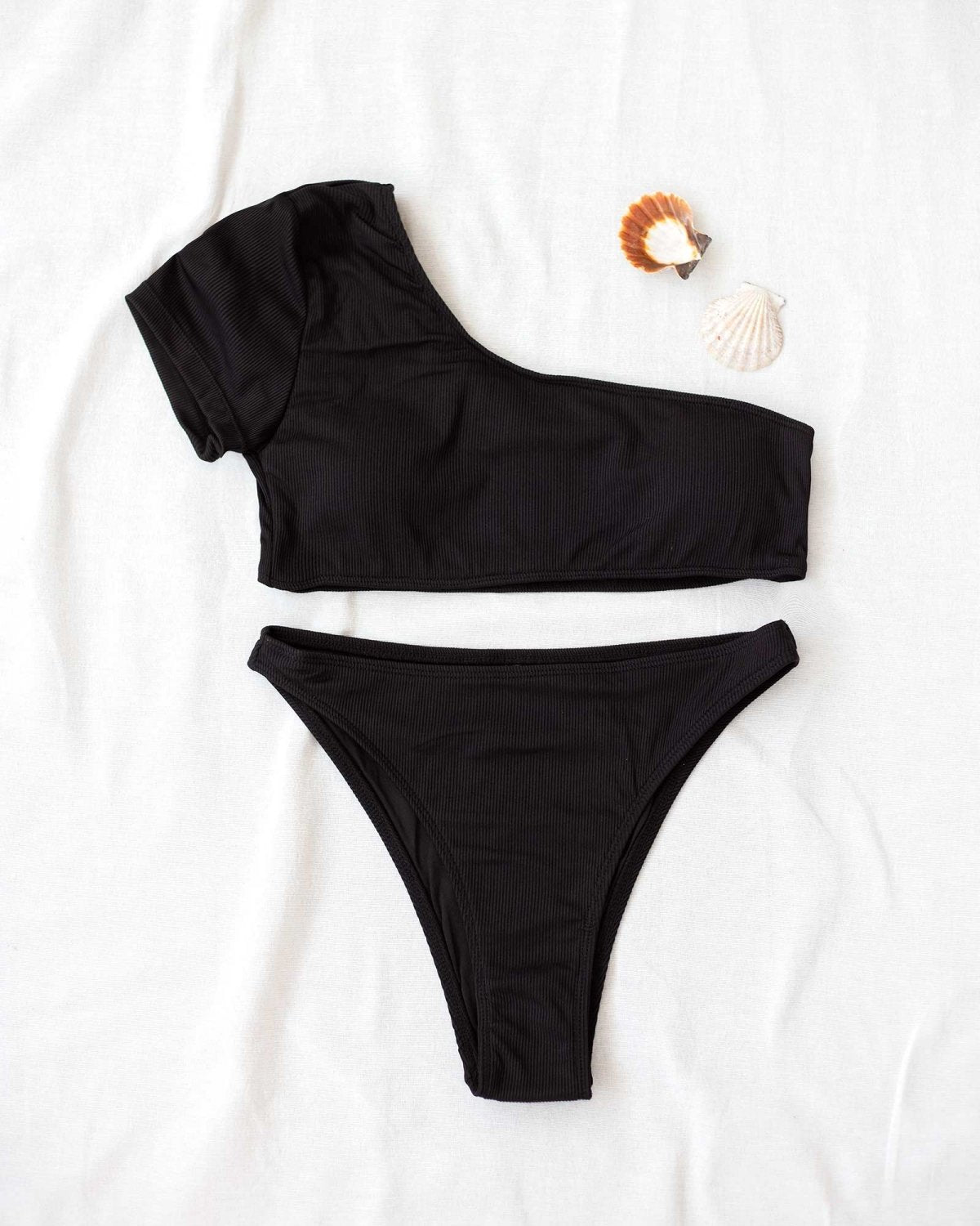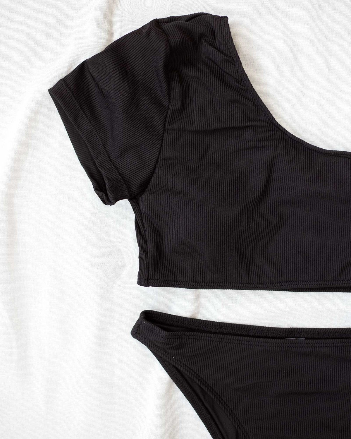 Σετ ριπ μπικίνι.Το τοπ είναι μπουστάκι με ένα μανίκι και αποσπώμενη ενίσχυση.Το σλιπ είναι ψηλόμεσο.Μέτρια κάλυψη.