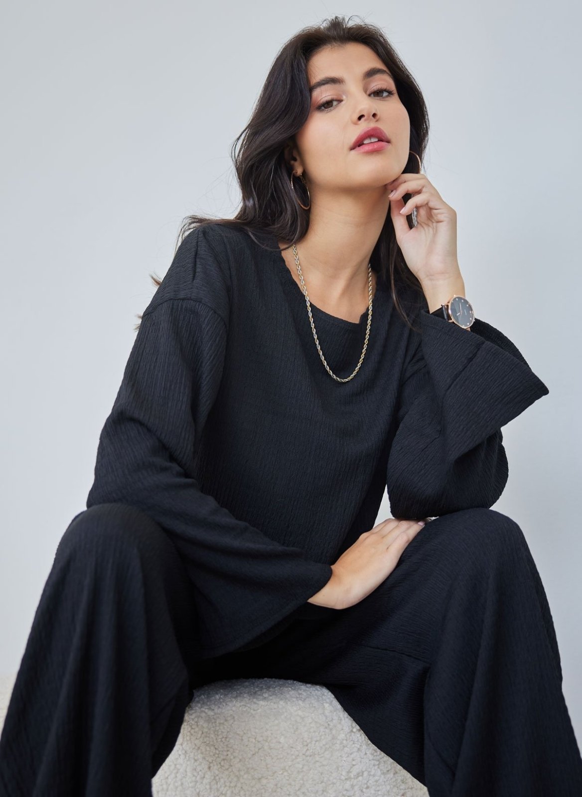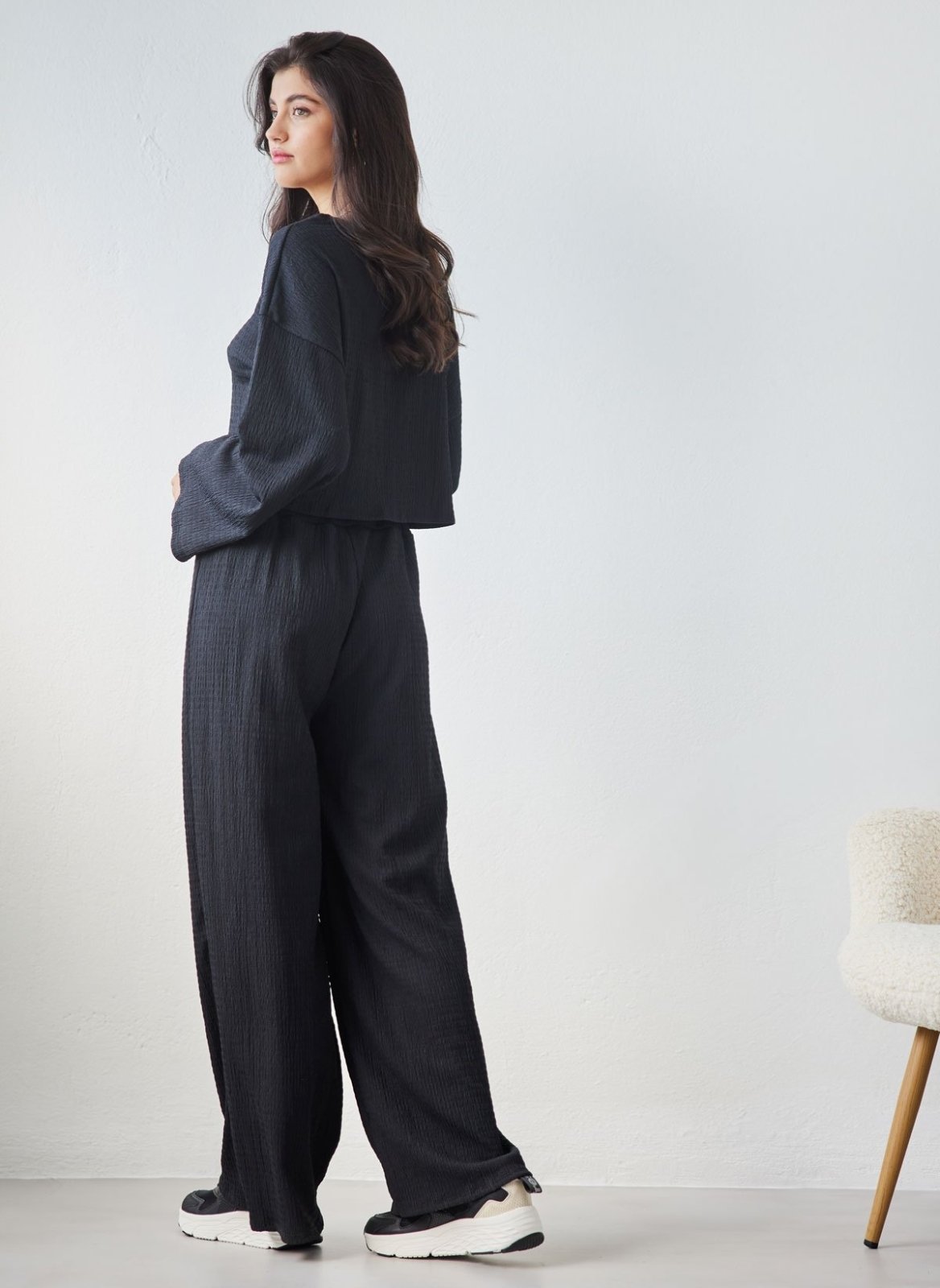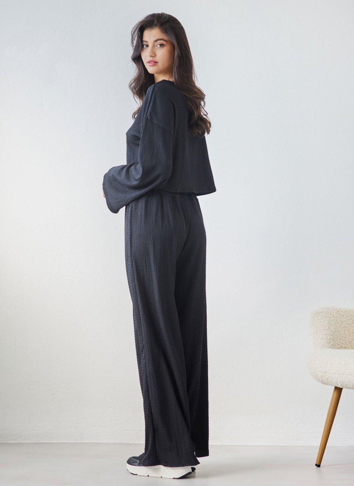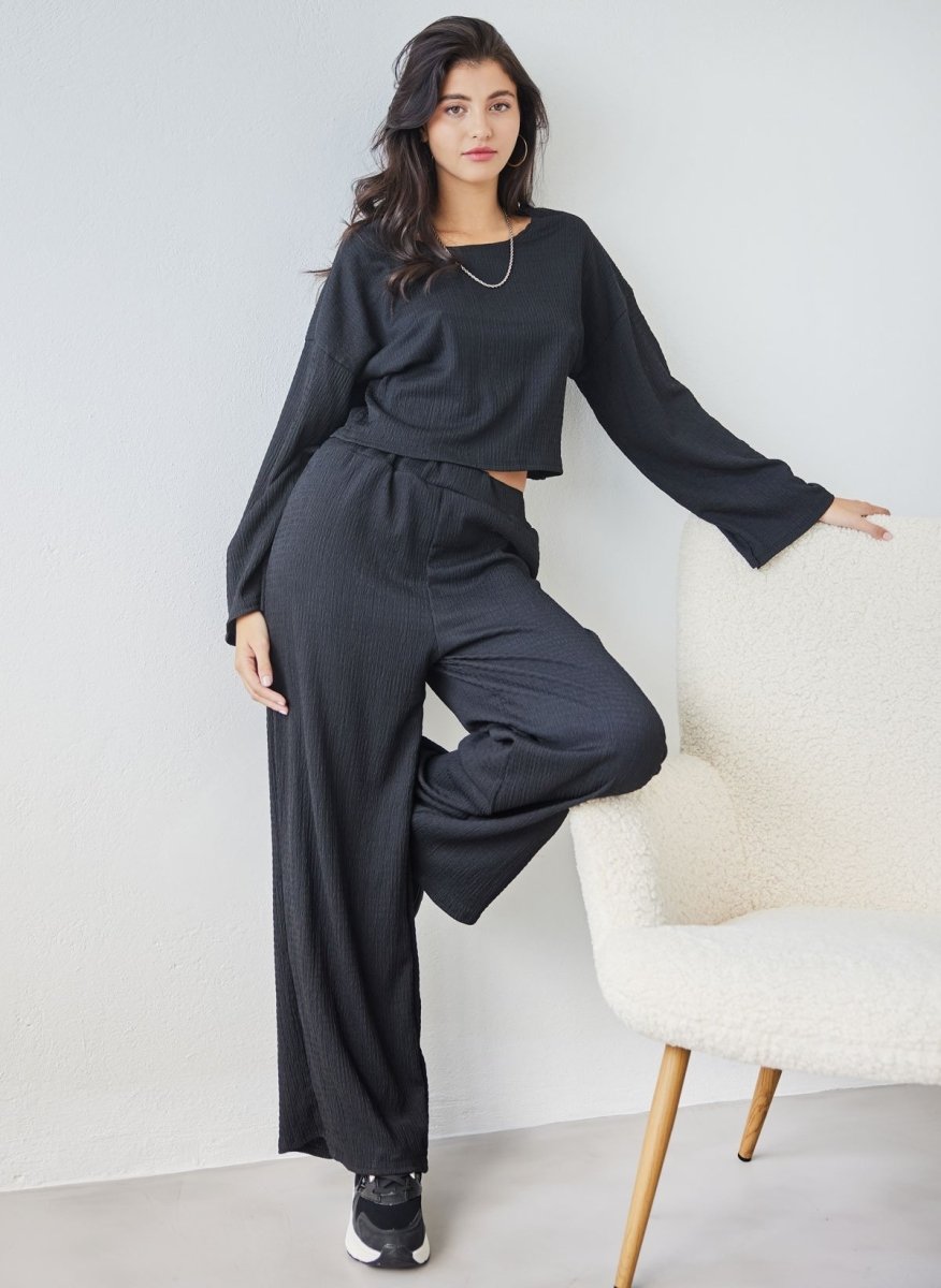Σετ ρούχων γκοφρέ. Το τοπ έχει άνετη cropped γραμμή με ανοιχτή λαιμόκοψη. Το παντελόνι είναι wide leg με λάστιχο στη μέση.