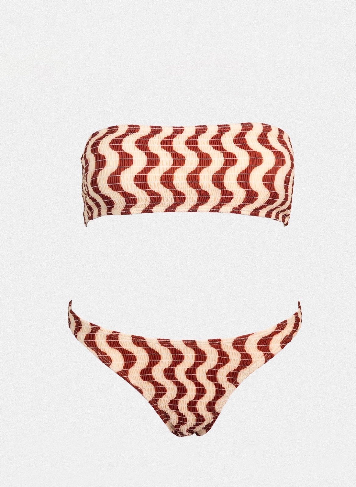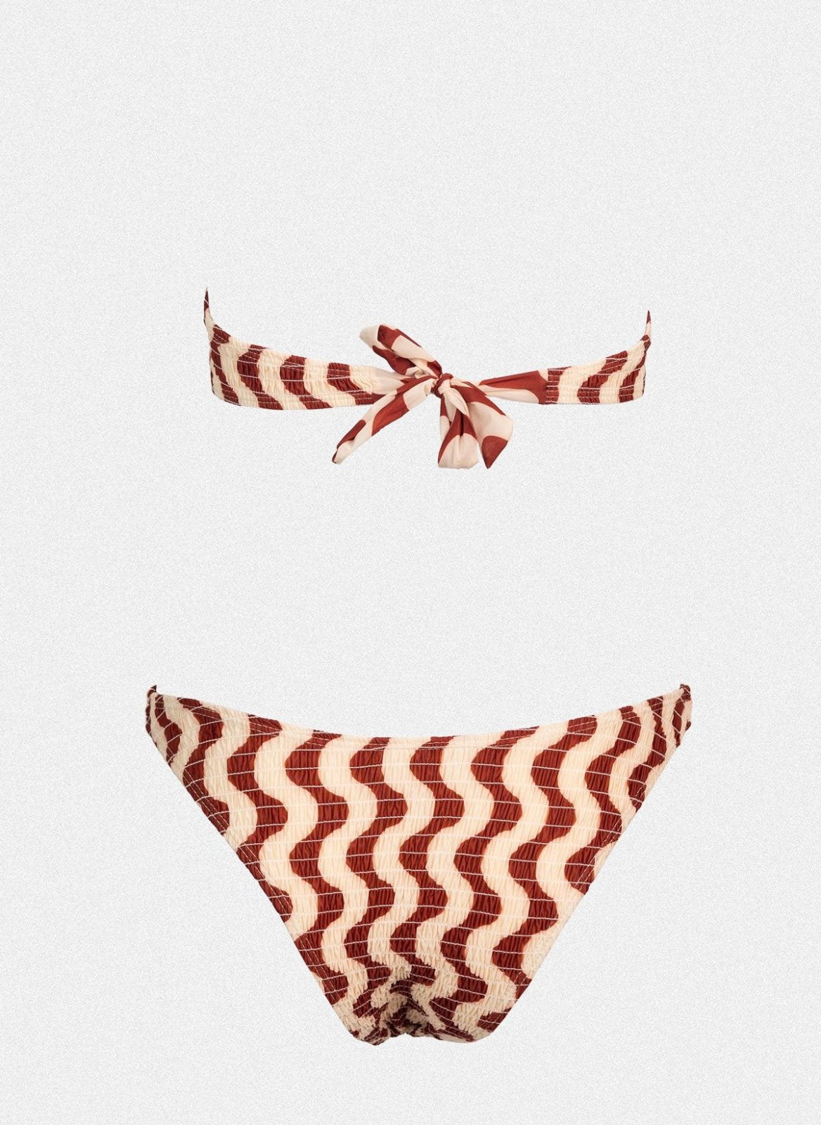 Σετ ruched μπικίνι με διχρωμία. Το σλιπ είναι παρτό ψηλόμεσο. Μέτρια κάλυψη. Το τοπ είναι strapless με αποσπώμενη ενίσχυση. Δένει στην πλάτη.