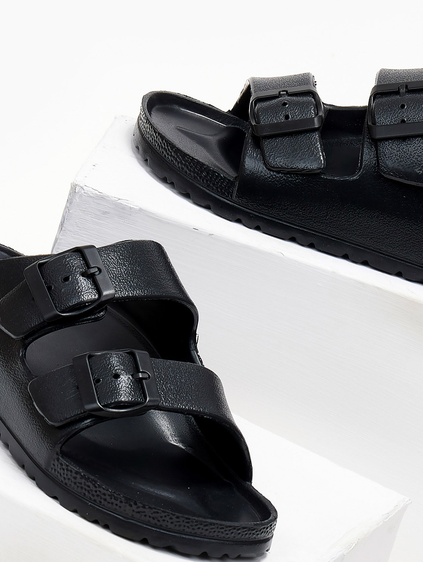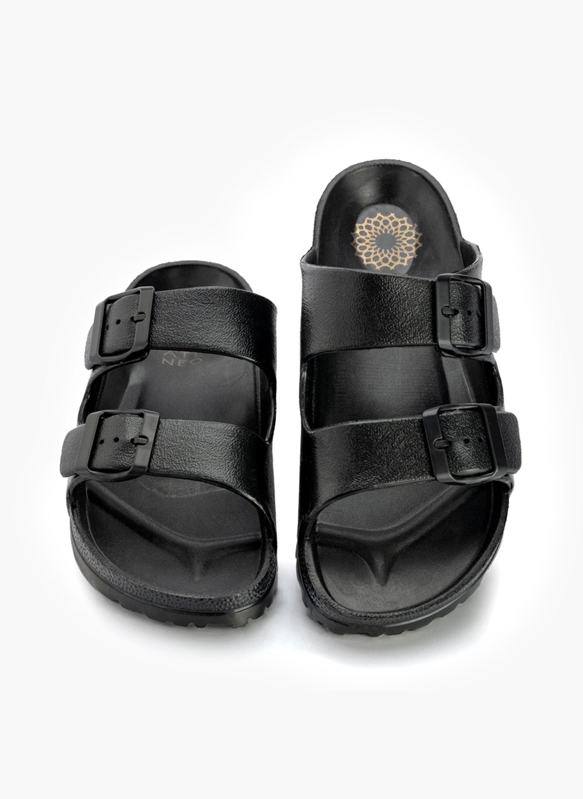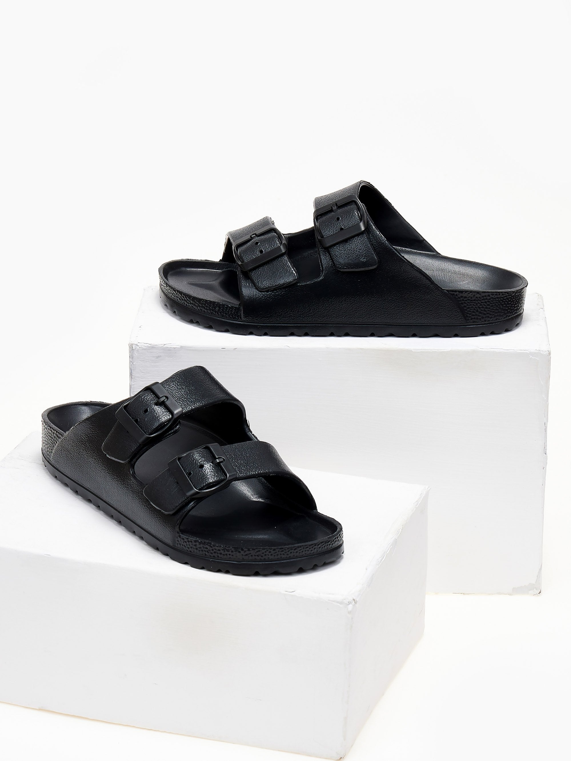 The ATENEO Anatomical Footbed Slides in Black combine comfort and style with a thoughtfully engineered design. These versatile slides feature a dual-strap construction with secure buckle fastening, paired with a contoured anatomical footbed that supports natural foot alignment. Perfect for everyday wear, these slides deliver professional comfort without compromising on aesthetics.