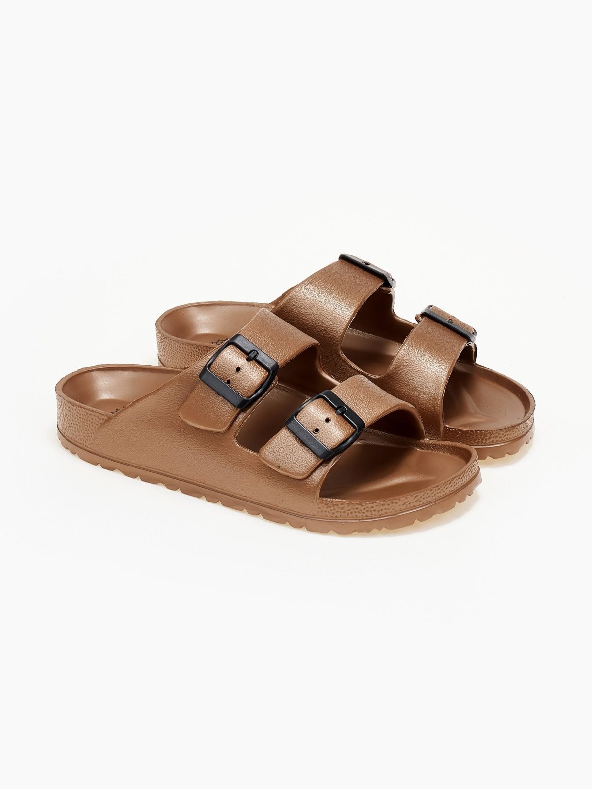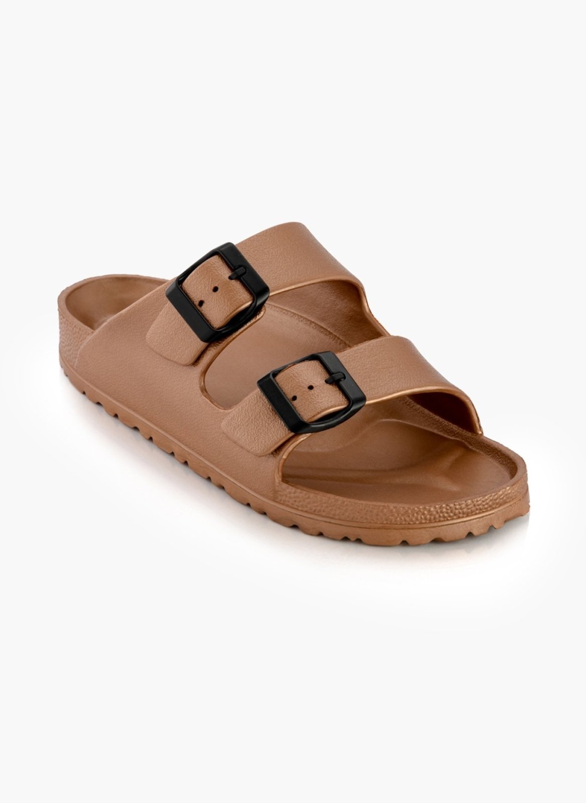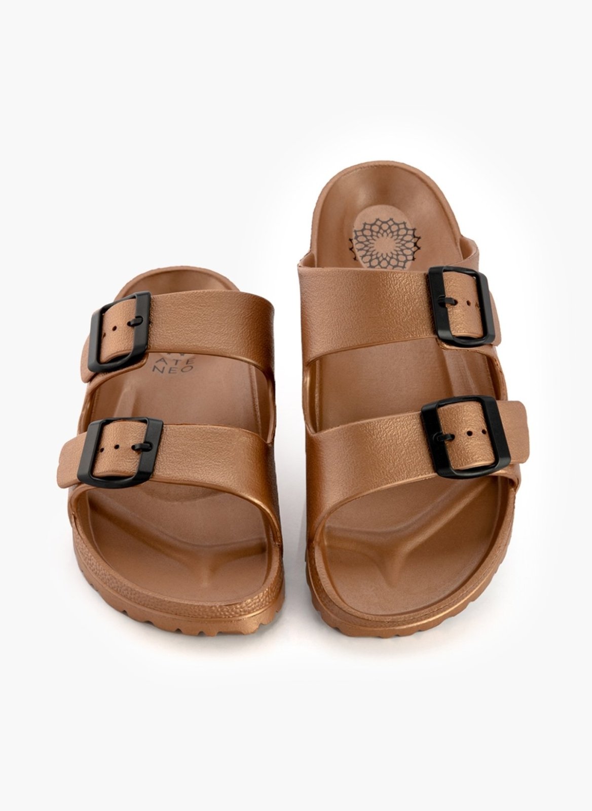 The ATENEO Anatomical Footbed Slides in Antique Copper combine style with comfort through thoughtful design. These slides feature a dual-strap construction with secure buckle closure, paired with a contoured anatomical footbed that supports natural foot alignment. The warm antique copper finish adds a sophisticated touch to any casual wardrobe, making these slides versatile for everyday wear.