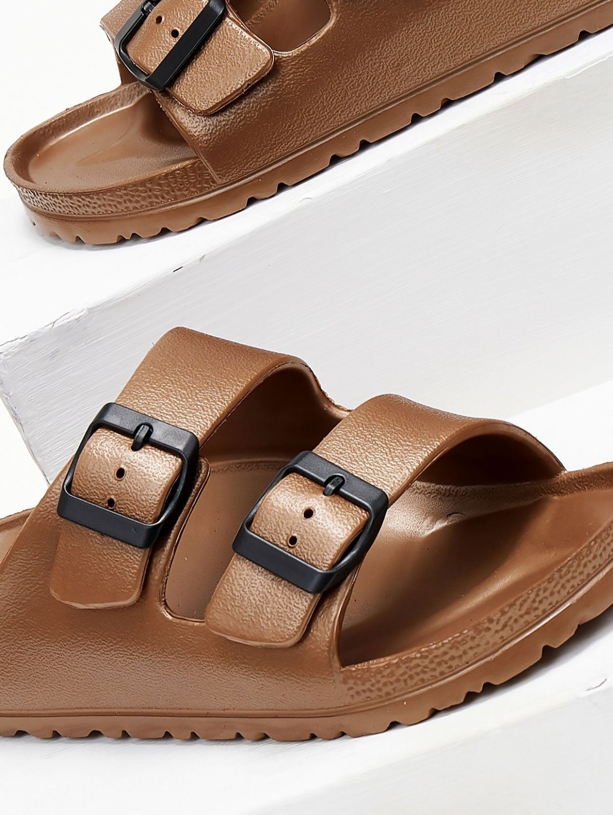 These slides are true to size. We recommend selecting your standard shoe size for optimal comfort and fit. The adjustable buckle straps accommodate various foot widths, ensuring a secure and personalized fit for most wearers.