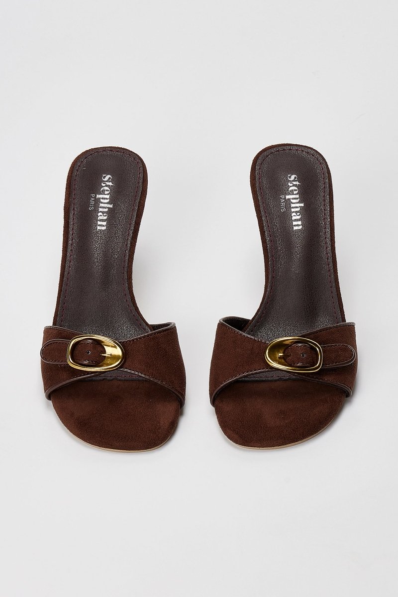 Slim Heel Mules Buckle Strap - Brown Suede