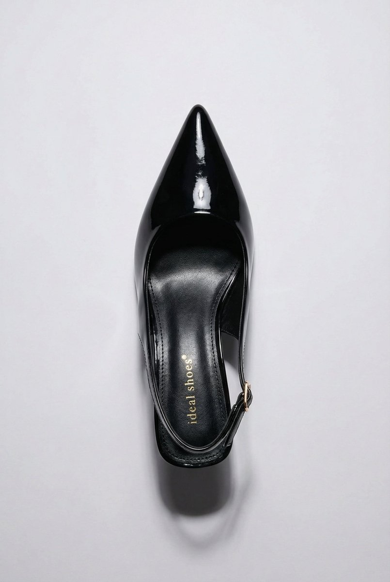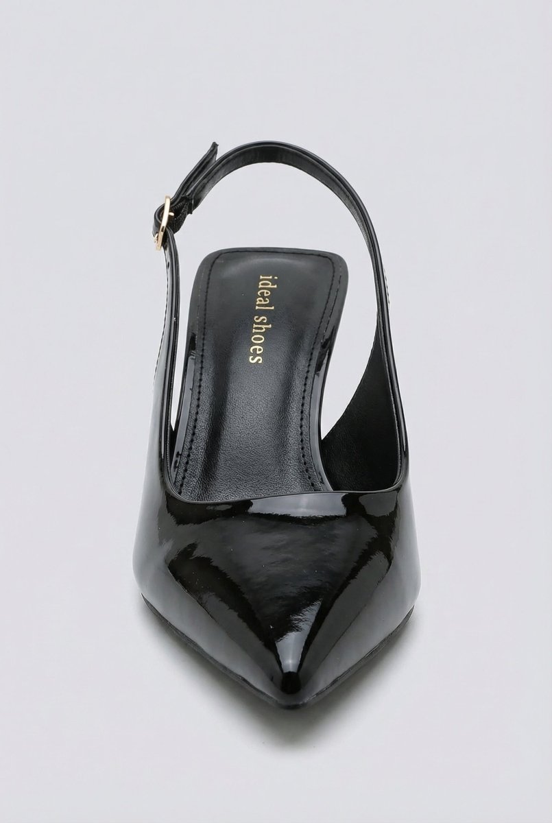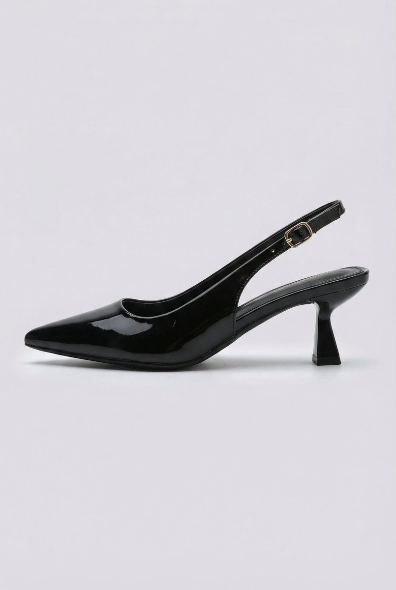 Glossy slingback pumps with a slim stiletto heel and side buckle fastening for a secure fit. Sleek silhouette and refined lift. Crafted for modern women.