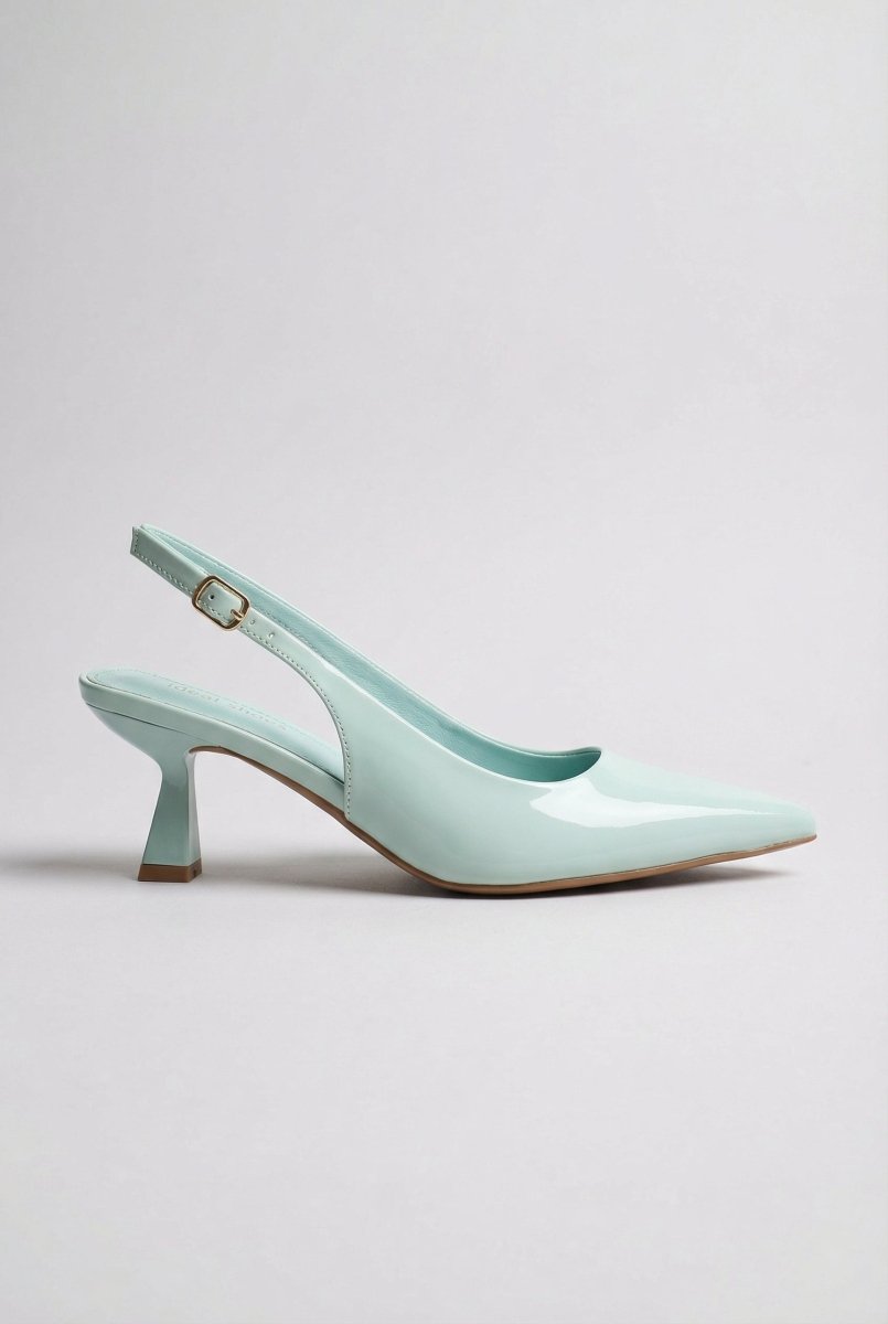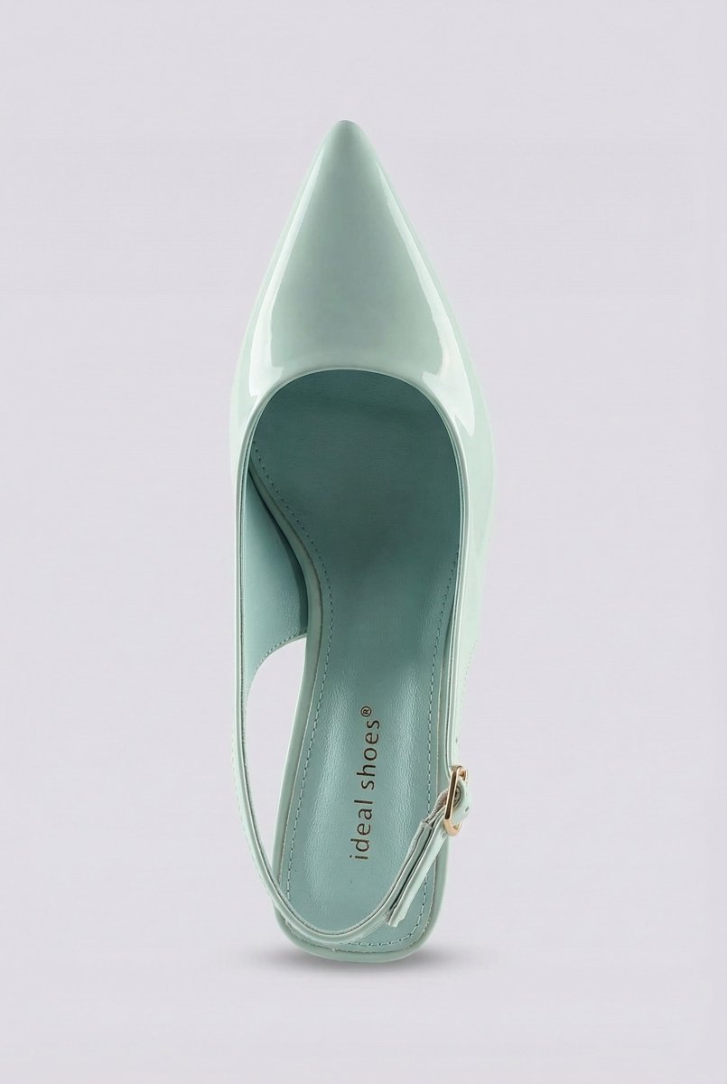 Ideal Shoes presents the Slingback Pumps in Light Green Patent, a sophisticated footwear choice designed for the contemporary woman. These glossy patent leather pumps feature a sleek silhouette with a slim stiletto heel and secure side buckle fastening. Perfect for elevating both professional and evening looks, these slingback pumps combine timeless elegance with modern styling.