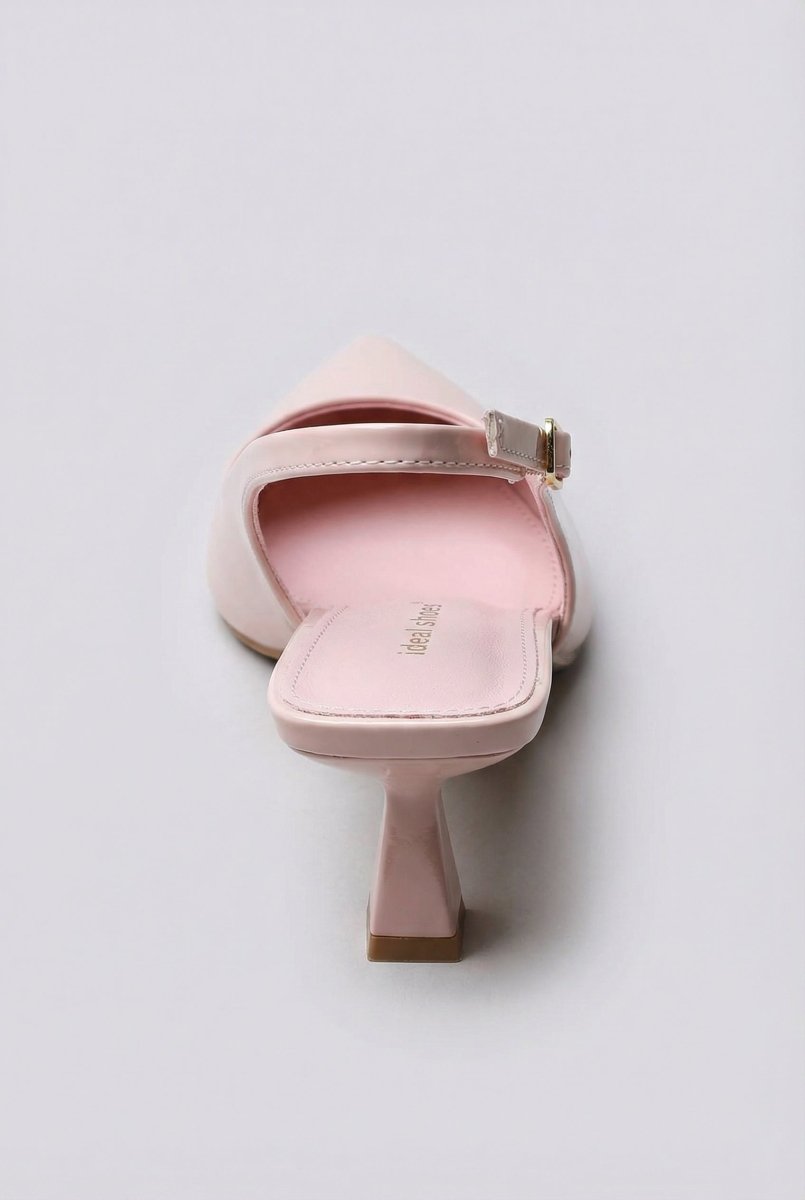 Glossy slingback pumps with a slim stiletto heel and side buckle fastening for a secure fit. Sleek silhouette and refined lift. Crafted for modern women.