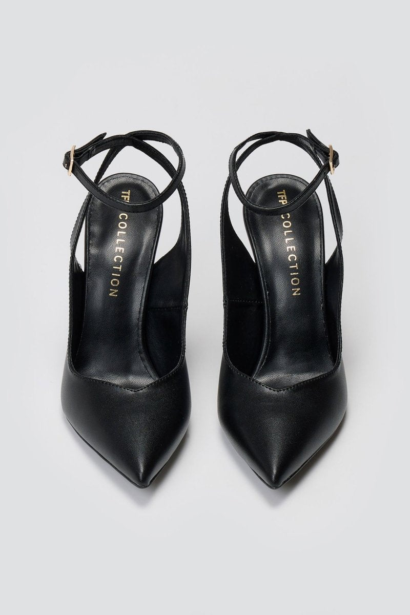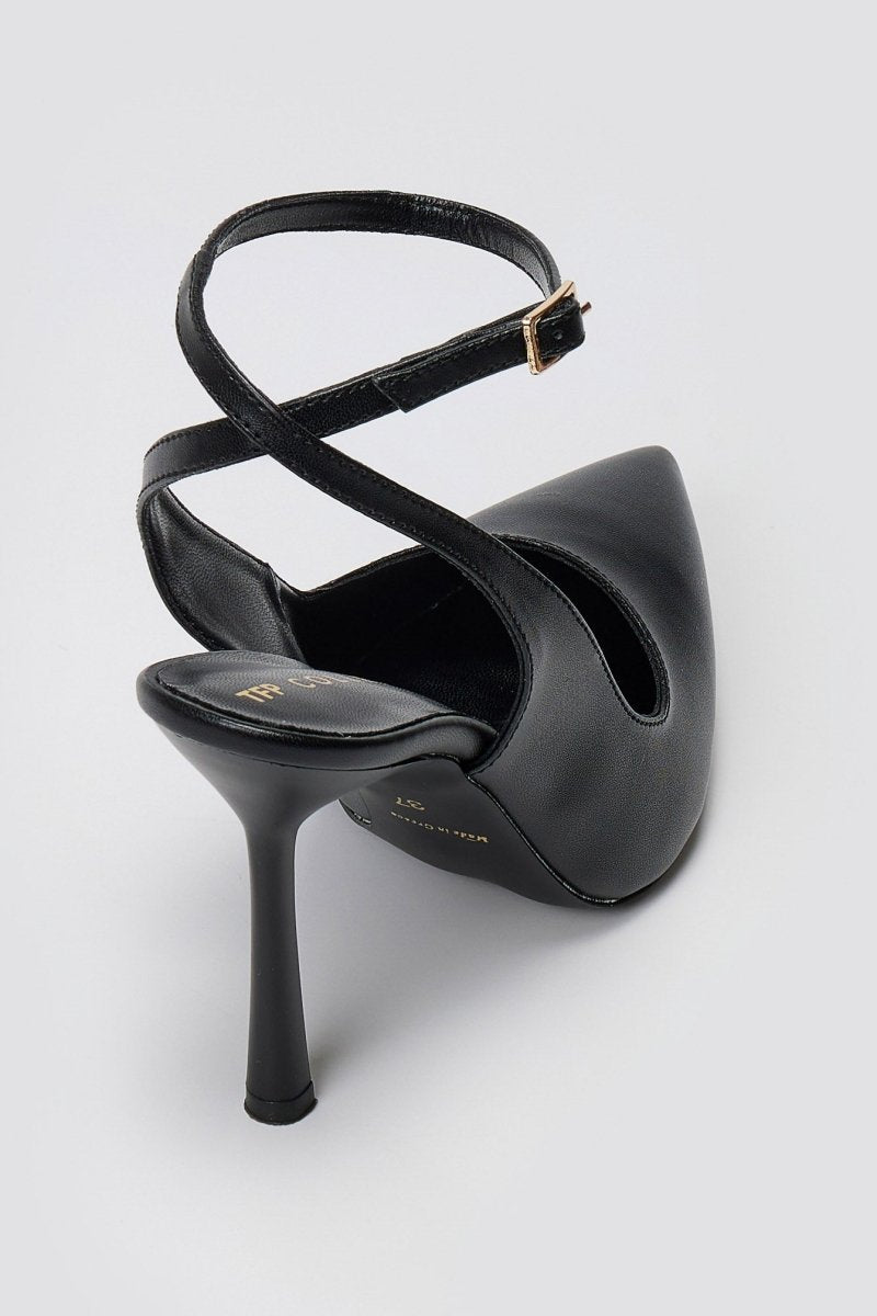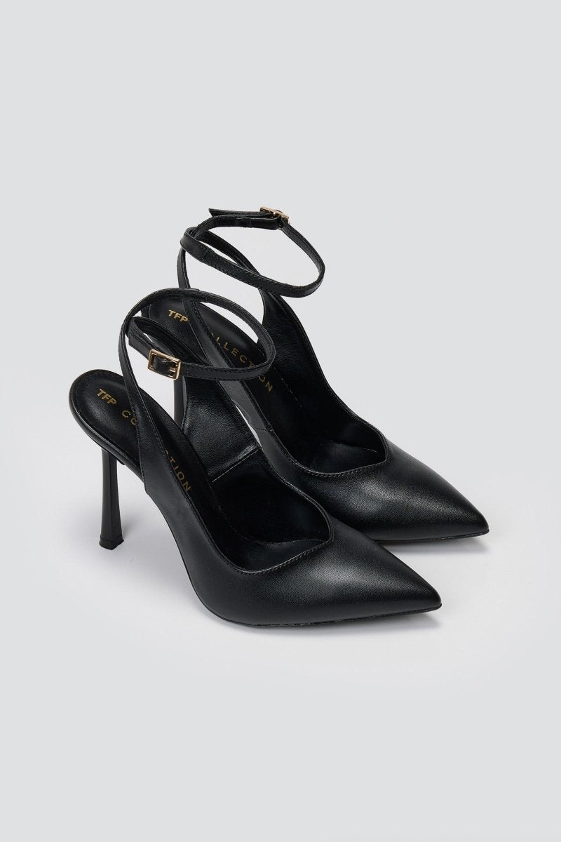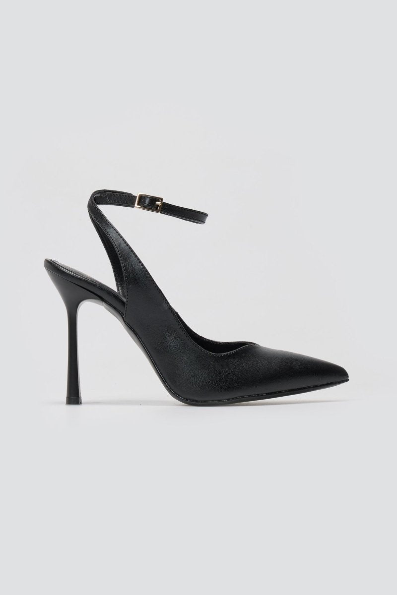 Pointed pumps with open back slingback, V-cut vamp and secure ankle strap on a high stiletto heel. Elegant style and balanced comfort for modern women.